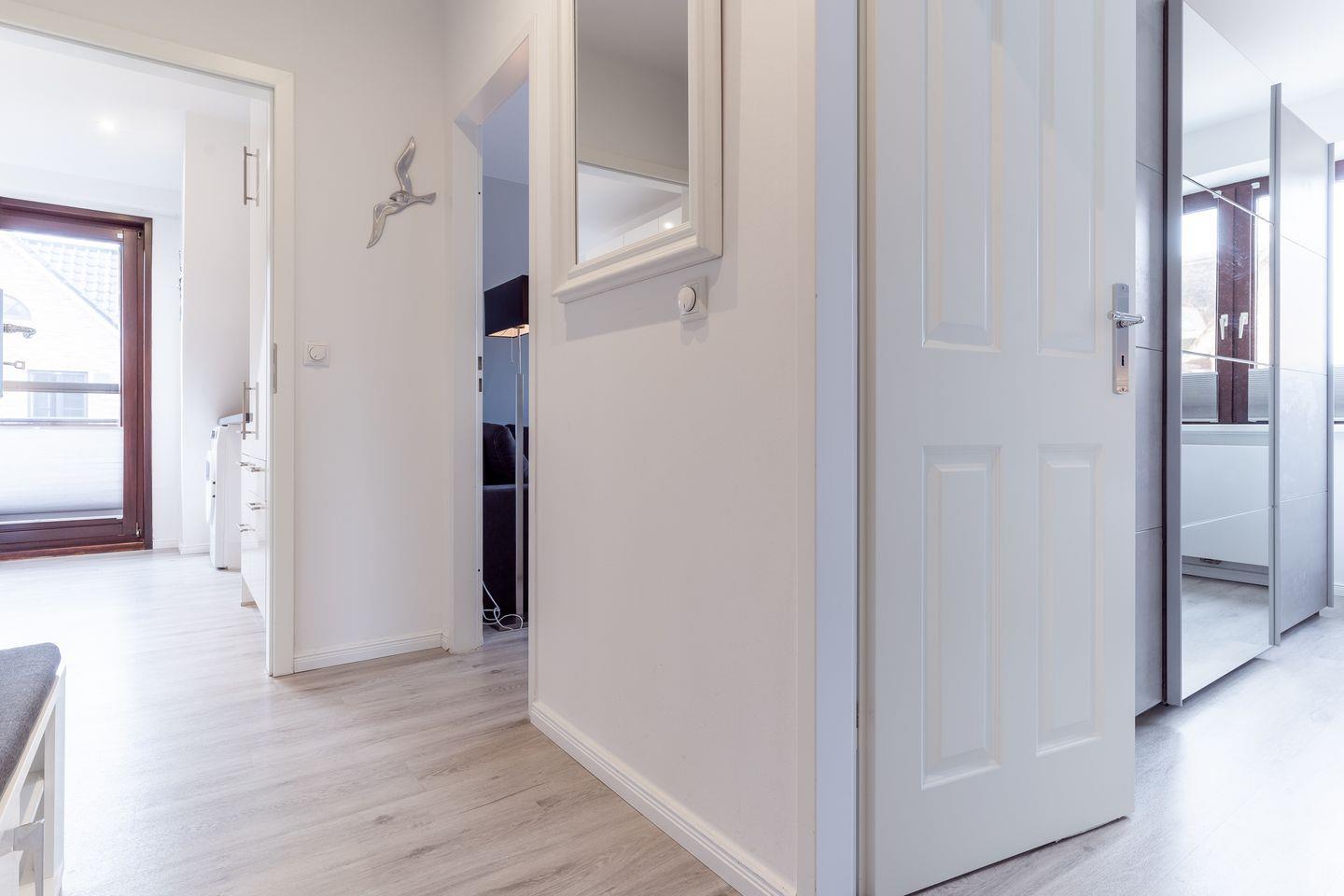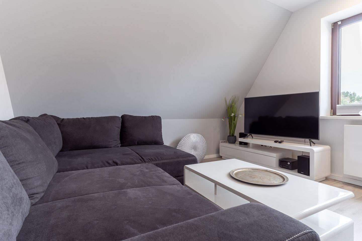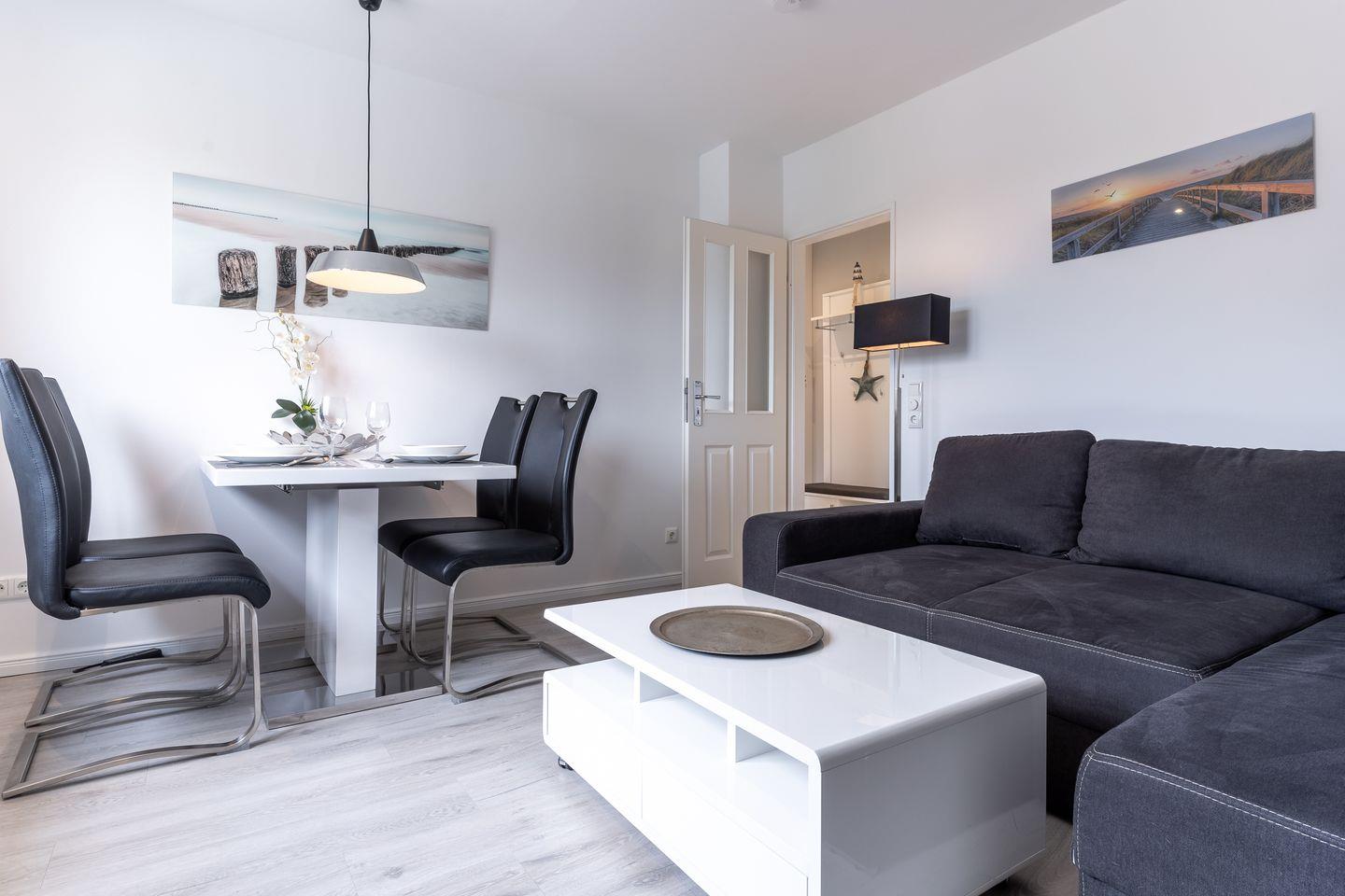 Auch Urlaub mit Hund in St. Peter-Ording ist hier möglich. Das moderne Wohnzimmer ist hell und freundlich gestaltet. Zur Ausstattung gehören eine komfortable Couch und der große Esstisch, an dem die ganze Familie Platz findet. Die Couch lässt sich zum komfortablen Schlafplatz für 2 Personen umfunktionieren. Für die multimediale Unterhaltung sorgen ein großer Flachbild-TV, Radio mit Bluetooth und kostenfreies W-LAN. Für die Versorgung im Urlaub sorgt die vollumfassend ausgestattete, angrenzende Küche der Ferienwohnung. Hier stehen neben Cerankochfeld und Backofen noch Kühlschrank, Mikrowelle und Nespresso-Maschine bereit. Ein Waschtrockner steht für Gäste kostenfrei zur Verfügung. Orangenpresse und Milchaufschäumer gehören ebenfalls zum Inventar. Im hellen, einladenden Schlafzimmer steht ein komfortables 170x200cm Doppelbett zur Verfügung. Zur edlen Ferienwohnung gehören weiterhin Duschbad mit WC und Haartrockner. Die meisten Fenster der Ferienwohnung sind mit Fliegenschutzgitter und Verdunklungsplissees ausgestattet. Die große Fensterfront ist mit elektrischem Außenrollo ausgestattet, um Licht und Sichtschutz nach Belieben regulieren zu können.
