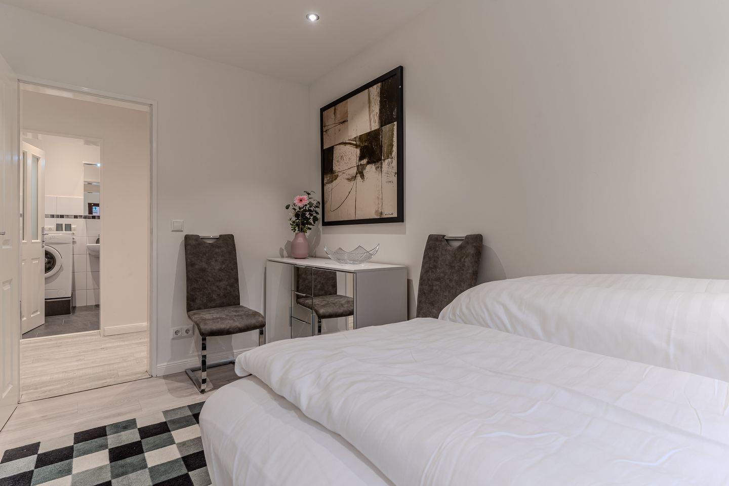 Die moderne, 44m² große Ferienwohnung, welche im Jahr 2020 vollständig saniert wurde, liegt im Erdgeschoss und bietet bis zu 2 Personen Platz für einen unvergesslichen Urlaub in St. Peter-Ording. Dank der Erdgeschosslage eignet sich die Ferienunterkunft wunderbar für mobilitätseingeschränkte Gäste. Die Ferienwohnung verfügt über eine kleine Terrasse. Auch der Urlaub mit Hund in St. Peter Ording ist hier möglich, bis zu 2 Hunde sind hier herzlich willkommen. Das moderne Wohnzimmer wirkt durch die große Fensterfront wunderbar hell und freundlich. Zur Ausstattung gehören eine komfortable Couch und der große Esstisch, an dem die ganze Familie Platz findet. Für die multimediale Unterhaltung sorgen ein großer Flachbild-TV, Radio mit Bluetooth und kostenfreies W-LAN. Für die Versorgung im Urlaub sorgt die vollumfassend ausgestattete Küche der Ferienwohnung. Hier stehen neben Cerankochfeld und Backofen noch Kühlschrank, Mikrowelle und Nespresso-Maschine bereit. Orangenpresse und Milchaufschäumer gehören ebenfalls zum Inventar. Im hellen, einladenden Schlafzimmer steht ein komfortables 180x200cm Boxspringett zur Verfügung. Zur edlen Ferienwohnung gehören weiterhin Duschbad mit WC, Haartrockner und Schminkspiegel. Alle Fenster der Ferienwohnung sind mit Fliegenschutzgitter und Verdunklungsplissees ausgestattet. Die große Fensterfront ist mit elektrischem Außenrollo ausgestattet, um Licht und Sichtschutz nach Belieben regulieren zu können. Feriengästen steht zudem eine kostenfrei nutzbare Waschmaschine zur Verfügung.