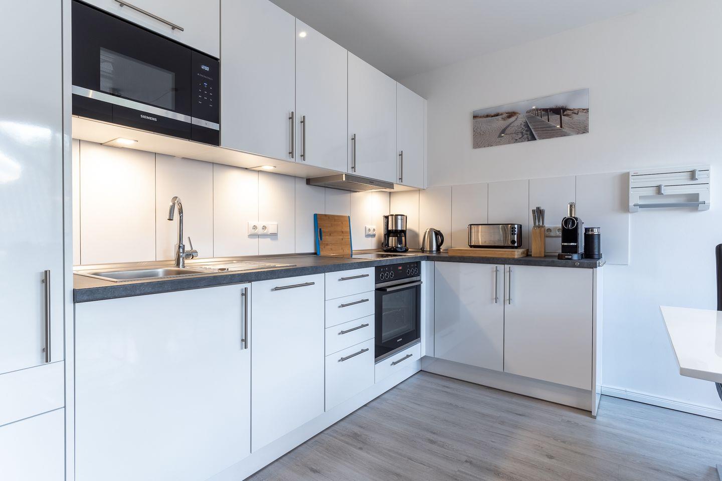 Für die Versorgung im Urlaub sorgt die vollumfassend ausgestattete, in den Raum integrierte Küche der Ferienwohnung. Hier stehen neben Cerankochfeld und Backofen noch Kühlschrank, Mikrowelle und Nespresso-Maschine bereit. Orangenpresse und Milchaufschäumer gehören ebenfalls zum Inventar. Im einladenden Schlafzimmer mit innenliegendem Fenster steht ein komfortables 180x200cm Doppelbett zur Verfügung. Zur modernen Ferienwohnung gehören weiterhin Duschbad mit WC und Haartrockner. Alle Fenster der Ferienwohnung sind mit Verdunklungsplissees ausgestattet. Die große Fensterfront ist mit elektrischem Außenrollo ausgestattet, um Licht und Sichtschutz nach Belieben regulieren zu können. Feriengästen steht kostenlos ein Waschtrockner zur Verfügung.