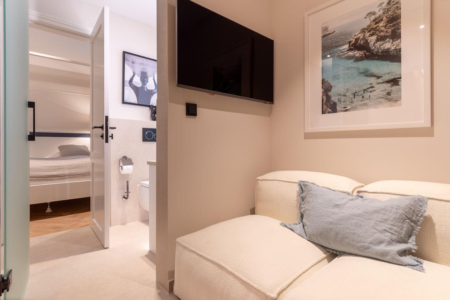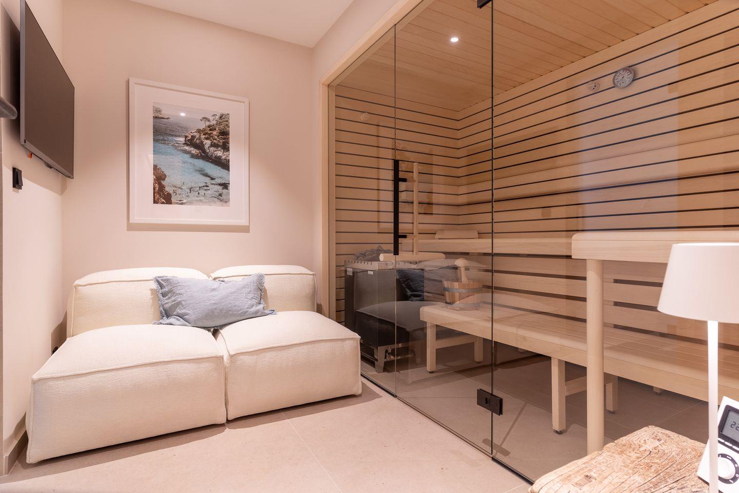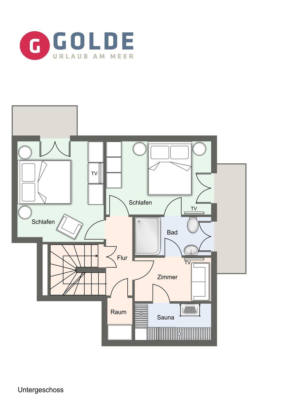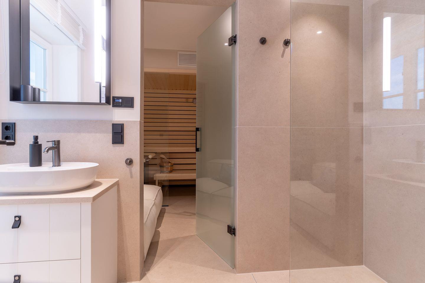 Das volle Wohlfühlprogramm erwartet Sie im Untergeschoss, das sowohl durch natürliches Tageslicht, als auch durch eine Strandbilder-Beleuchtung illuminiert wird. Sie gelangen direkt in den großzügigen Entspannungsbereich mit Sauna, großer Dusche und TV.