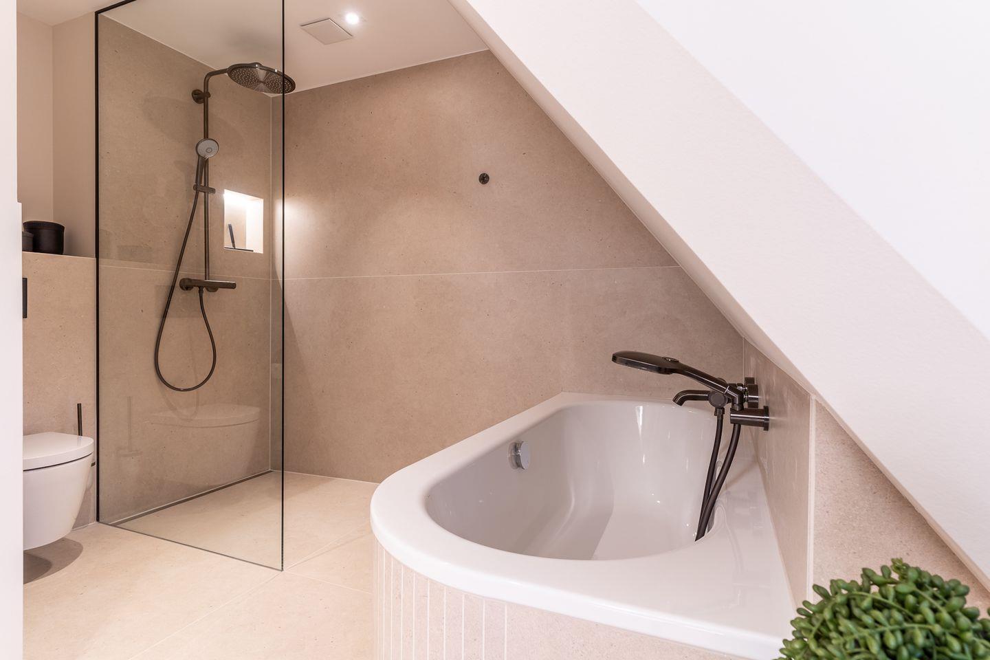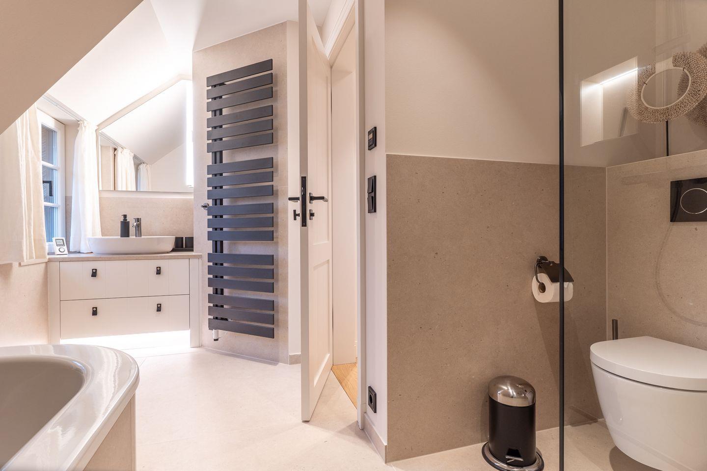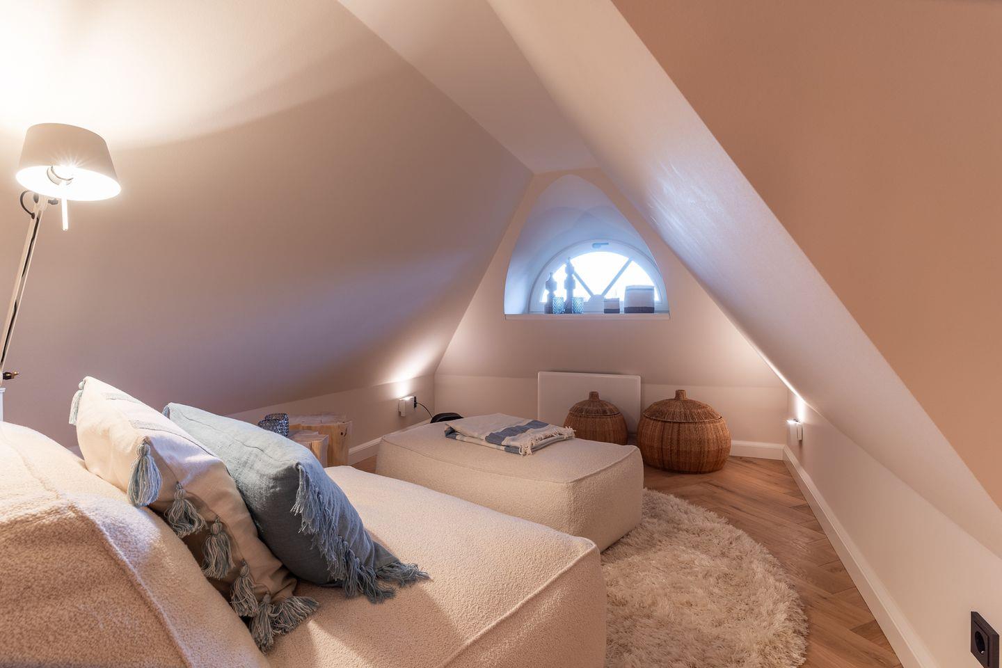 Darüber hinaus befindet sich im Obergeschoss ein geräumiges Vollbad mit Badewanne. Über den Flur gelangen Sie in das Dachgeschoss, hier ist ein gemütlicher Longe Bereich zum lesen, träumen, verweilen.