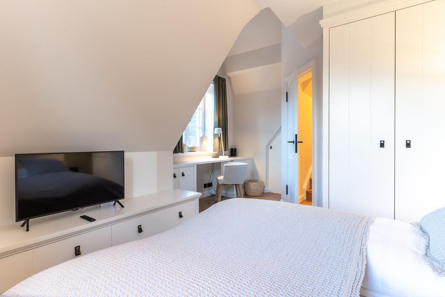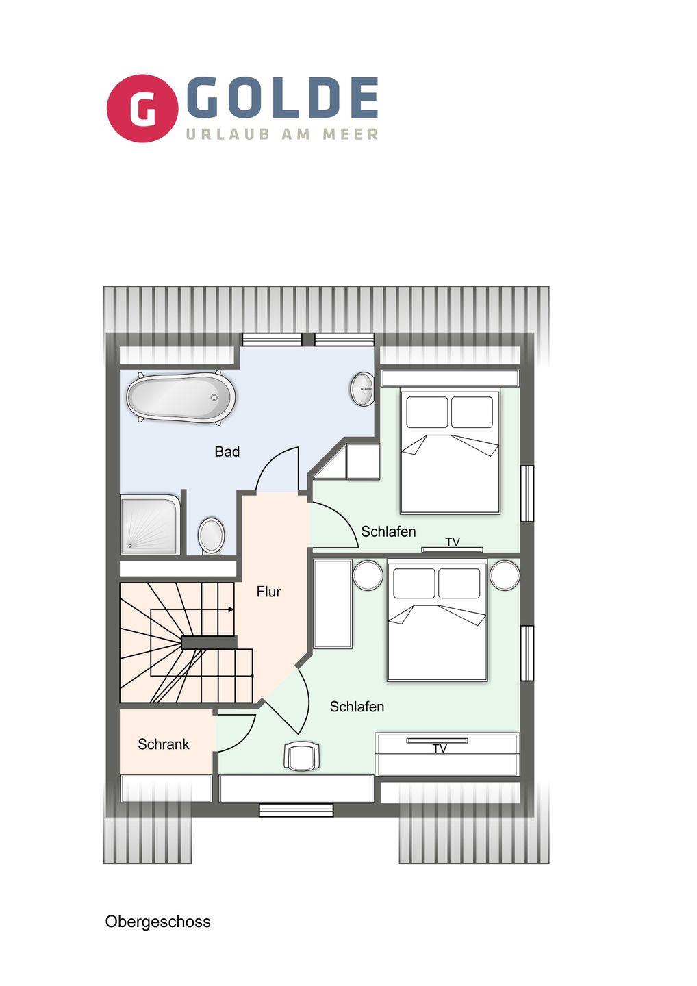 Über eine Holztreppe gelangt man in das Obergeschoss. Die zwei Schlafzimmer, jeweils mit einem Doppelbett 1x (1,60 x 2,00m) 1x (1,40 x 2,00m) sind mit einem TV und Kleiderschrank ausgestattet. Ein Schlafzimmer bietet Ihnen außerdem einen Schreibtisch.
