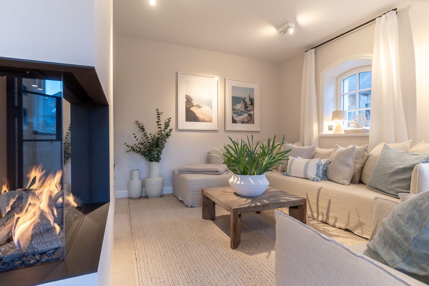 Im Erdgeschoss erwartet Sie ein lichtdurchflutetes Wohnzimmer mit Gaskamin und TV, eine offene Küche sowie ein gemütliches Esszimmer. Die Küche verfügt über hochwertige Elektrogeräte und genügend Platz zum gemeinsamen Kochen. An den Wohnbereich schließt sich ein Flur sowie ein Gäste-WC an.