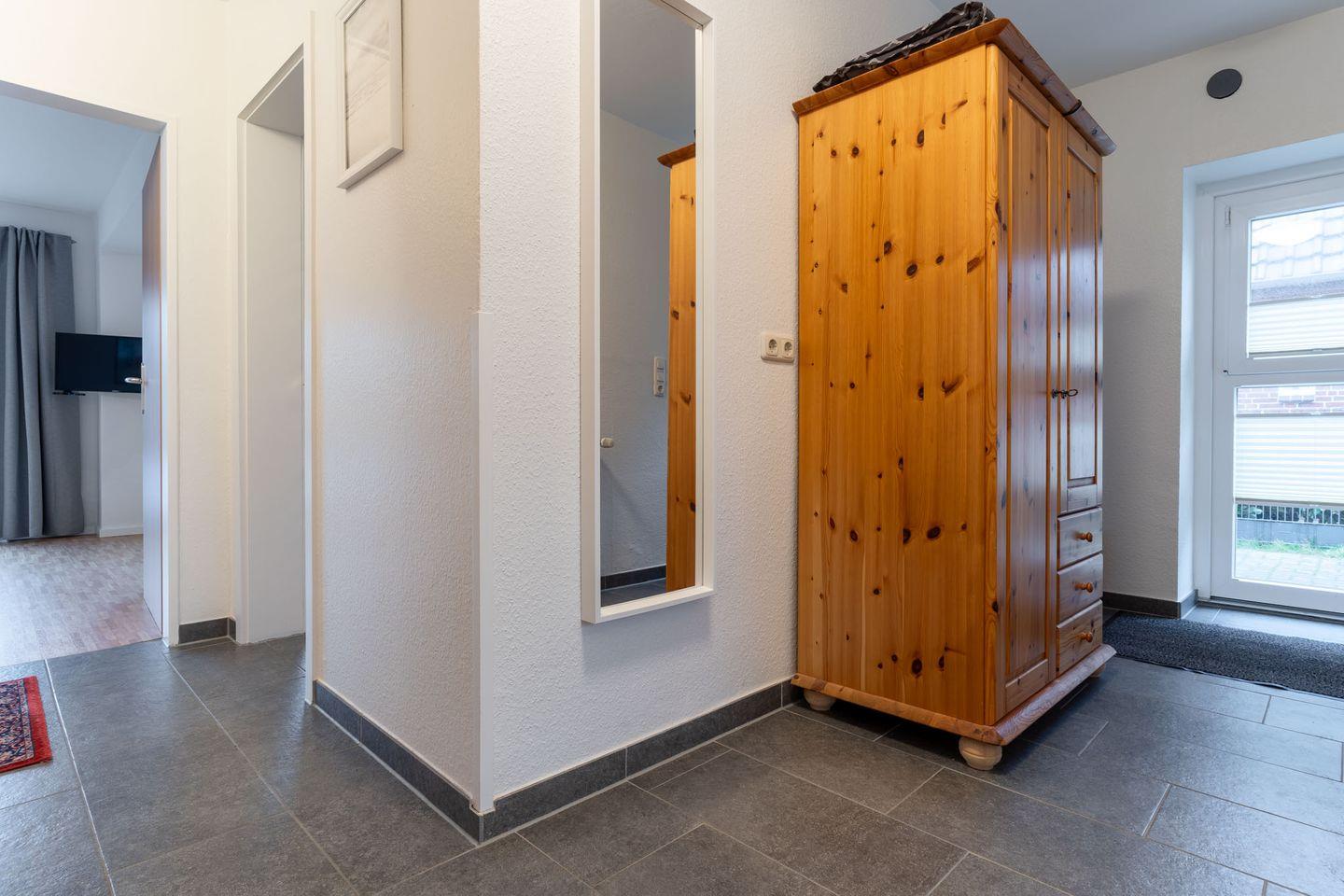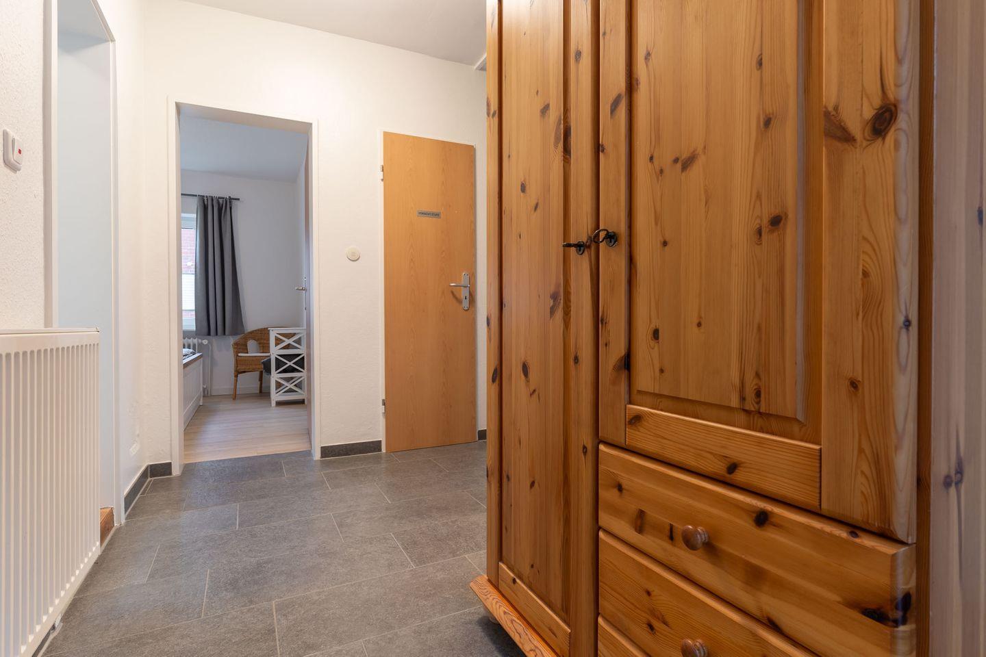 Das Schlafzimmer ist mit einem komfortablen Doppelbett (180x200 cm) ausgestattet, das für erholsame Nächte sorgt. Der Flur führt Sie zum modernen Duschbad mit WC, wo Sie sich nach einem Tag am Strand erfrischen können.