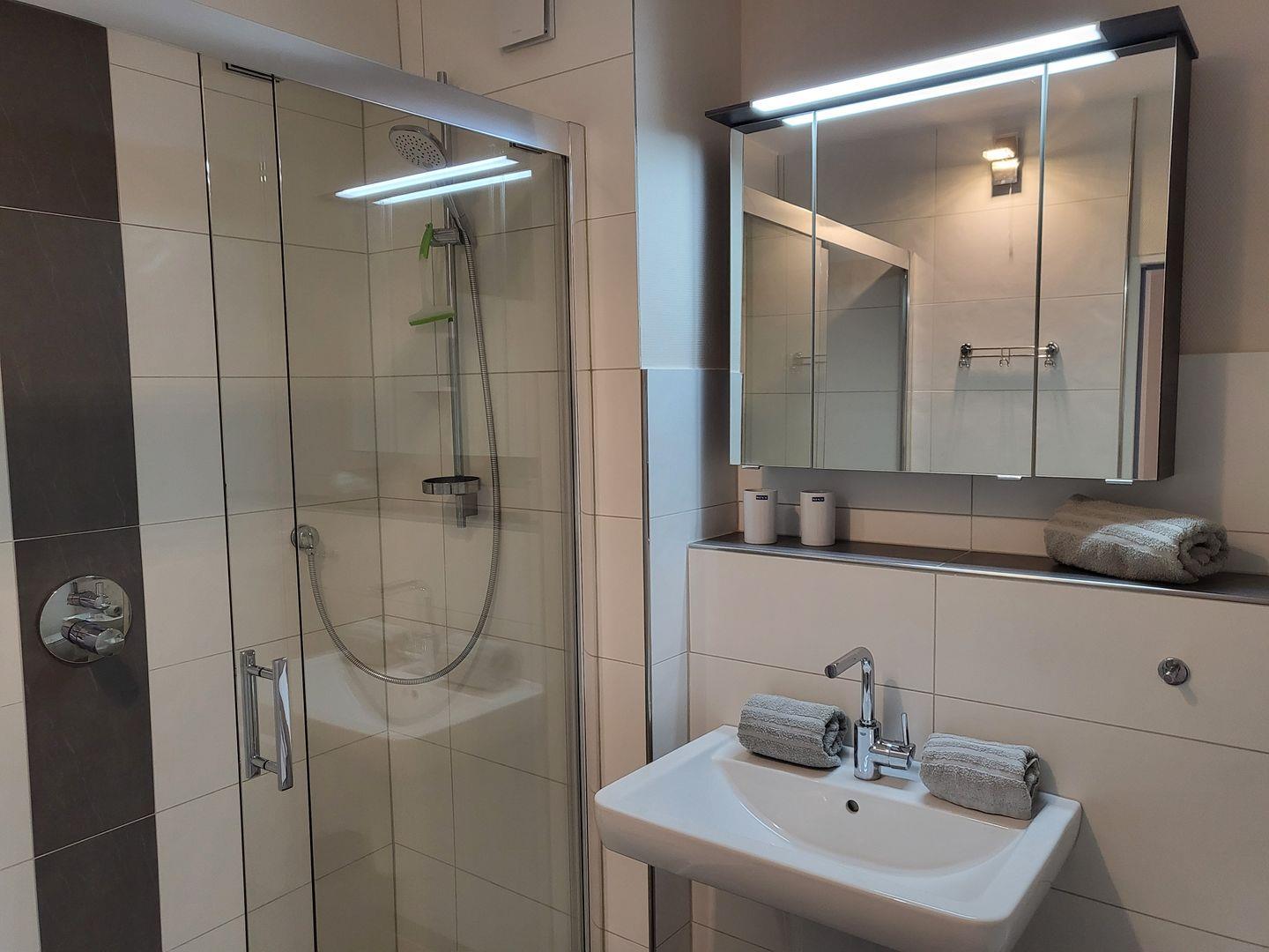 Das moderne und hochwertige Badezimmer ist mit einer bodengleichen Dusche und einem WC ausgestattet.