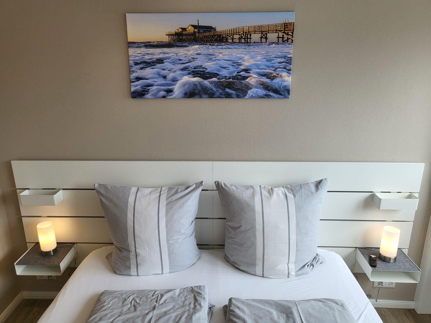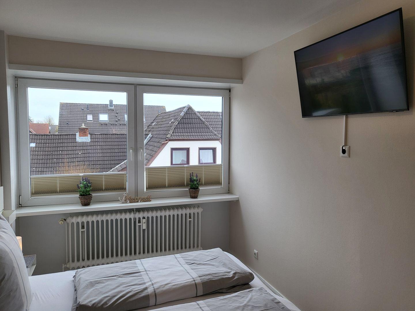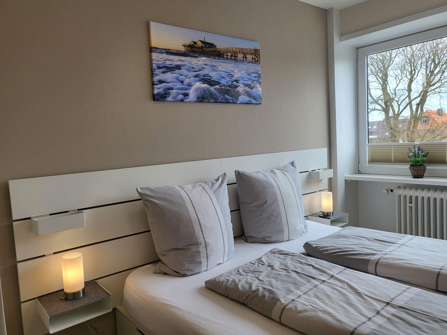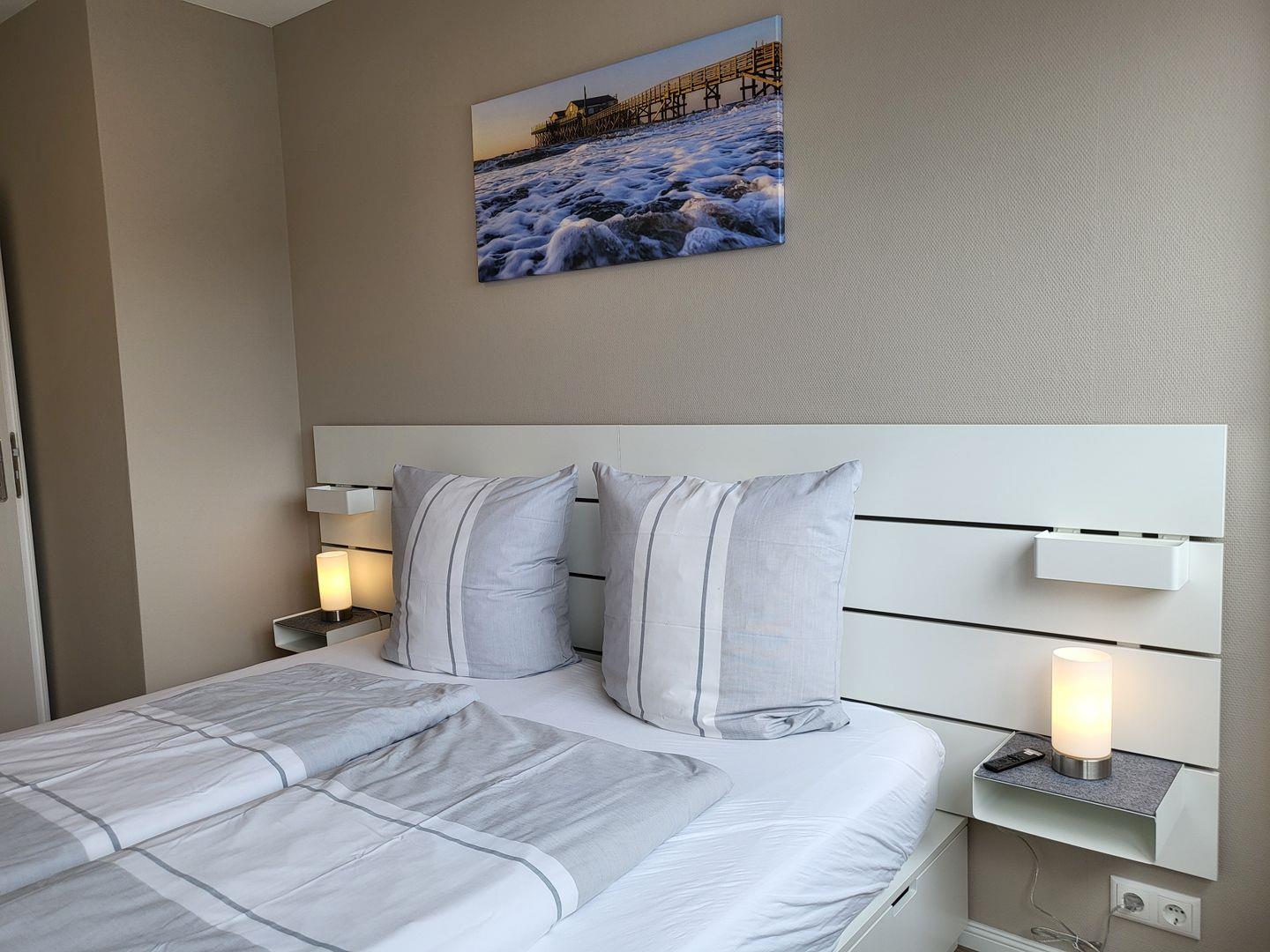 Ein geräumiges Schlafzimmer bietet ein komfortables Doppelbett (180x200cm) und einen Flachbild-TV mit Internetzugang.