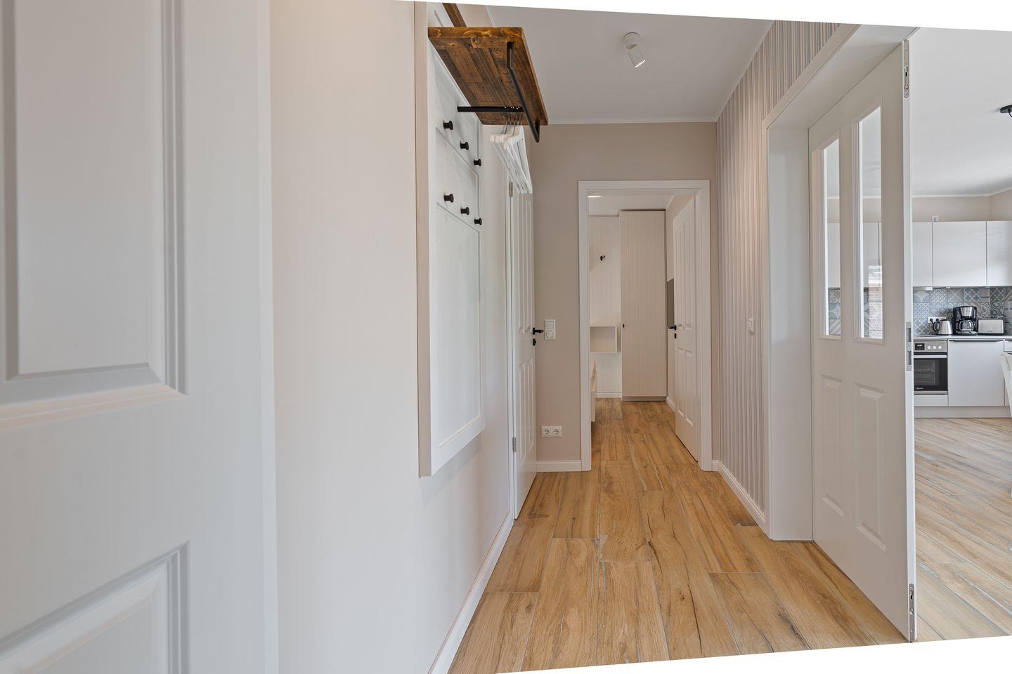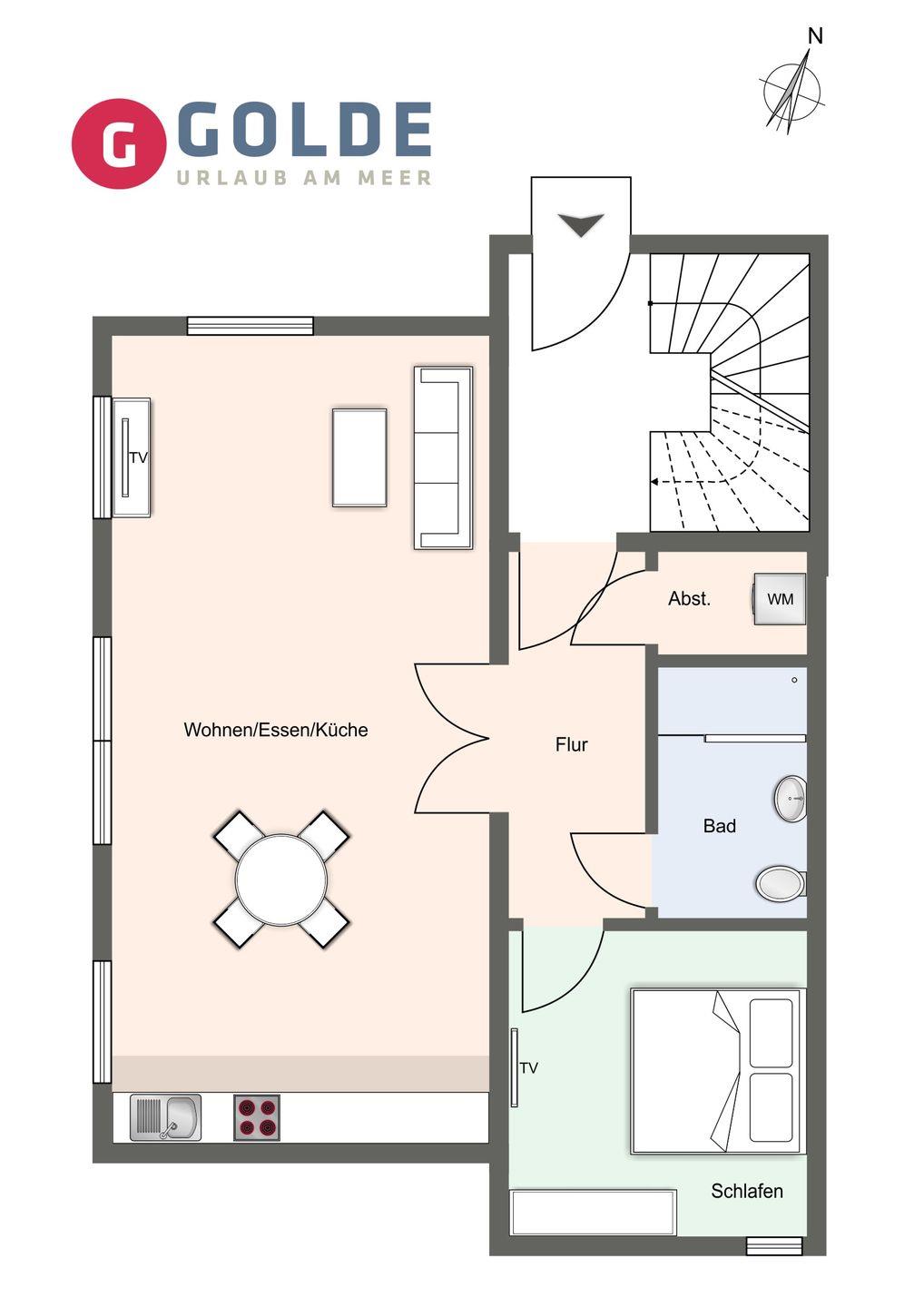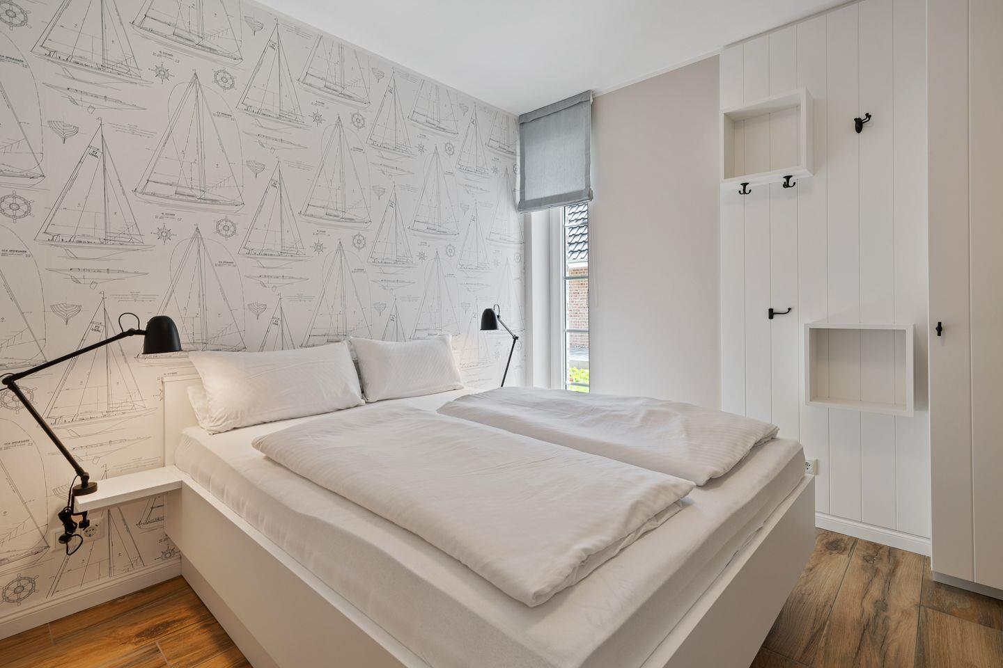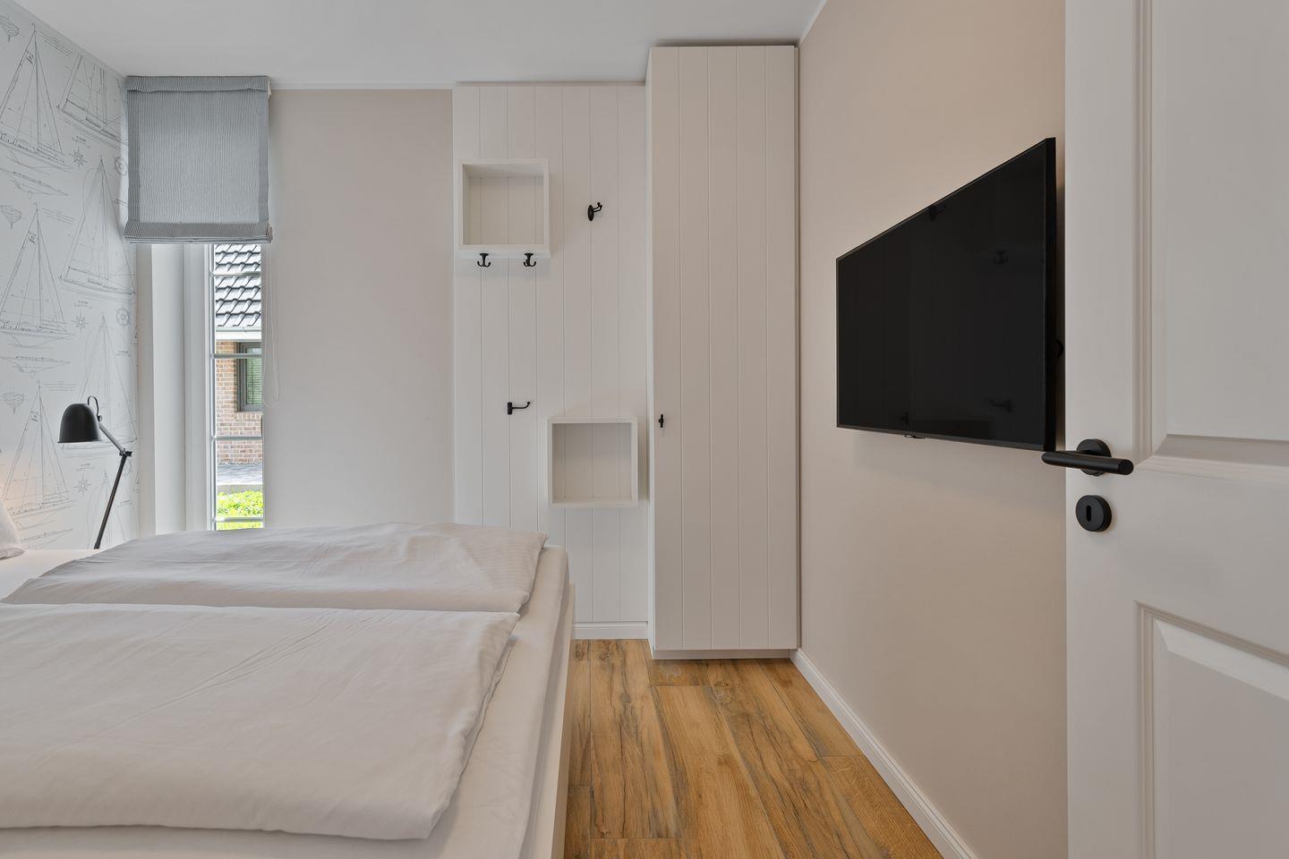Ihre gemütliche Ferienwohnung mit Fußbodenheizung und Aussenjalousien im Erdgeschoss ist mit einer Fläche von ca. 55 qm ausgestattet und lädt direkt zu einem Frühstück auf der Terrasse am Haus ein. Der helle Wohnbereich der Unterkunft verfügt über ein Schlafsofa 1,60 x 2,00 Meter, einen Couchtisch sowie einen Esstisch mit 4 Stühlen. Vom Wohnbereich aus gelangen Sie auf die Terrasse direkt am Deich, auf dem ein kleiner Tisch mit 2 Stühlen und ein Strandkorb bereitsteht. Die Küchenzeile ist mit einem Cerankochfeld, Geschirrspüler, Geschirr, Kaffeemaschine, Kühlschrank, Toaster, Wasserkocher und Backfunktion ausgestattet. Im Schlafzimmer erwartet Sie ein Doppelbett und ein Fernseher. Ebenfalls vorhanden sind ein Flur mit Garderobe und großem Spiegel sowie ein Badezimmer mit bodengleicher Dusche, Waschbecken, WC und einem elektrischen Handtuchheizung. Zur Unterhaltung stehen Ihnen ein Internet-TV Flachbildschirm sowie kostenloses WLAN zur Verfügung und ein Bluetooth-Lautsprecher. Ein PKW-Stellplatz befindet sich auf dem Grundstück. In nur 8 Fahrradminuten erreichen Sie einen Supermarkt mit Bäcker und Discounter. Die Bushaltestelle ist fußläufig. Das Objekt ist für max. zwei Haustiere zugelassen.