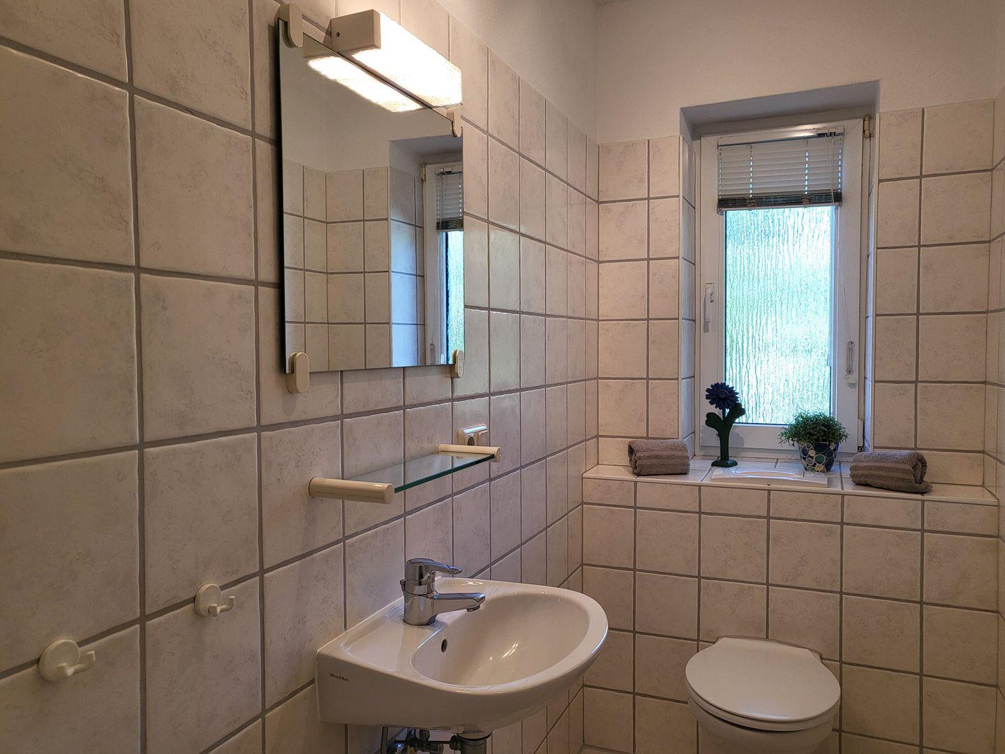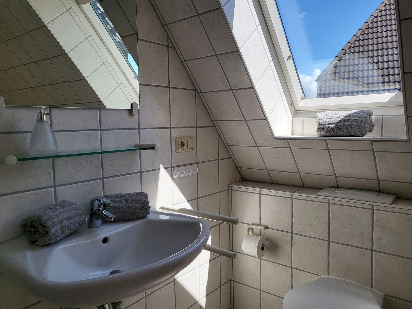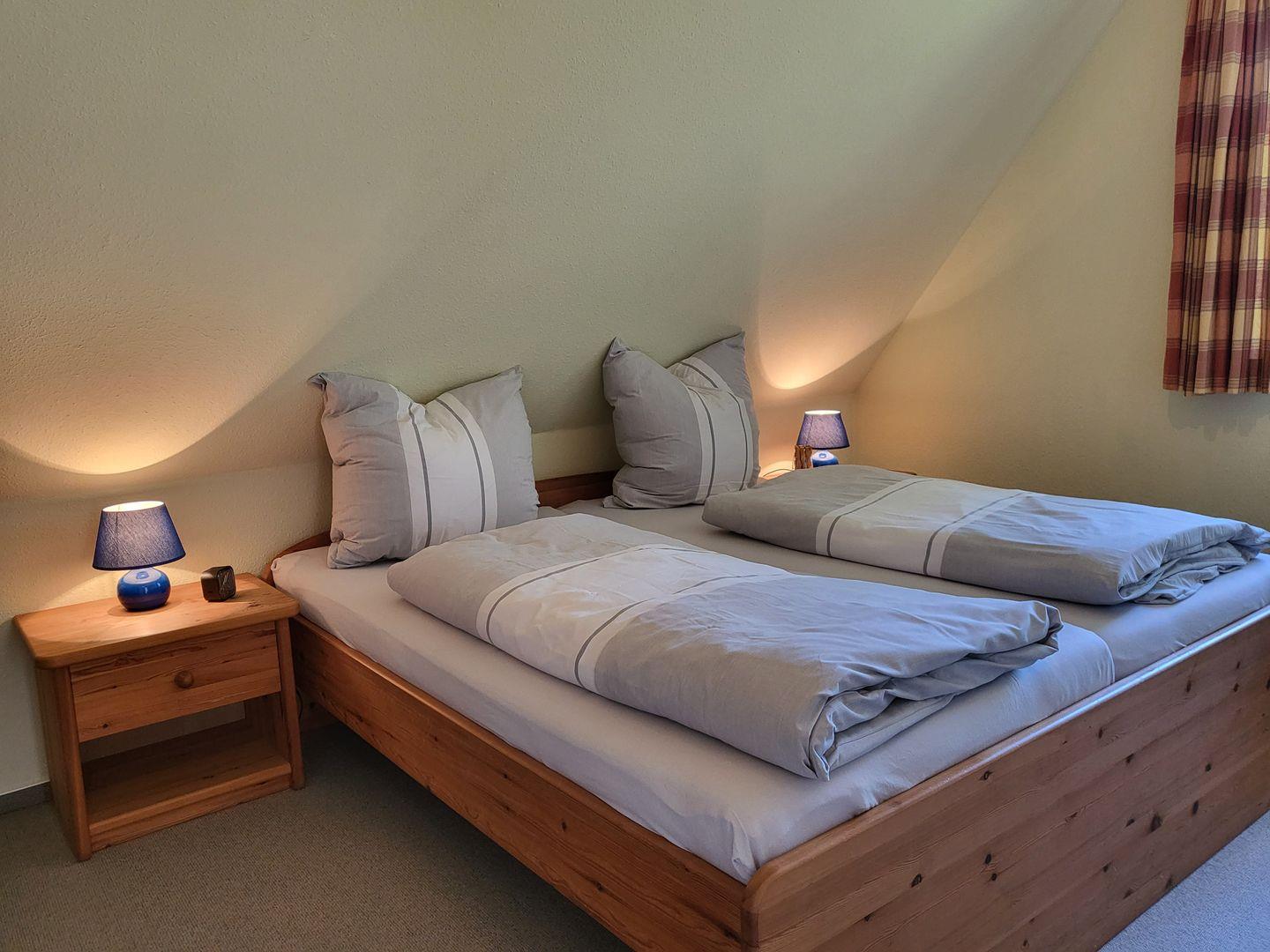 Ins Obergeschoß gelangen sie über den Treppenaufgang im Flur. Dort sind zwei separate Schlafzimmer,eines mit Doppelbett und eines mit zwei Einzelbetten und ein Duschbad mit WC und Fenster.