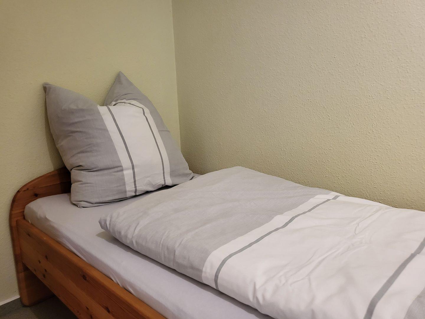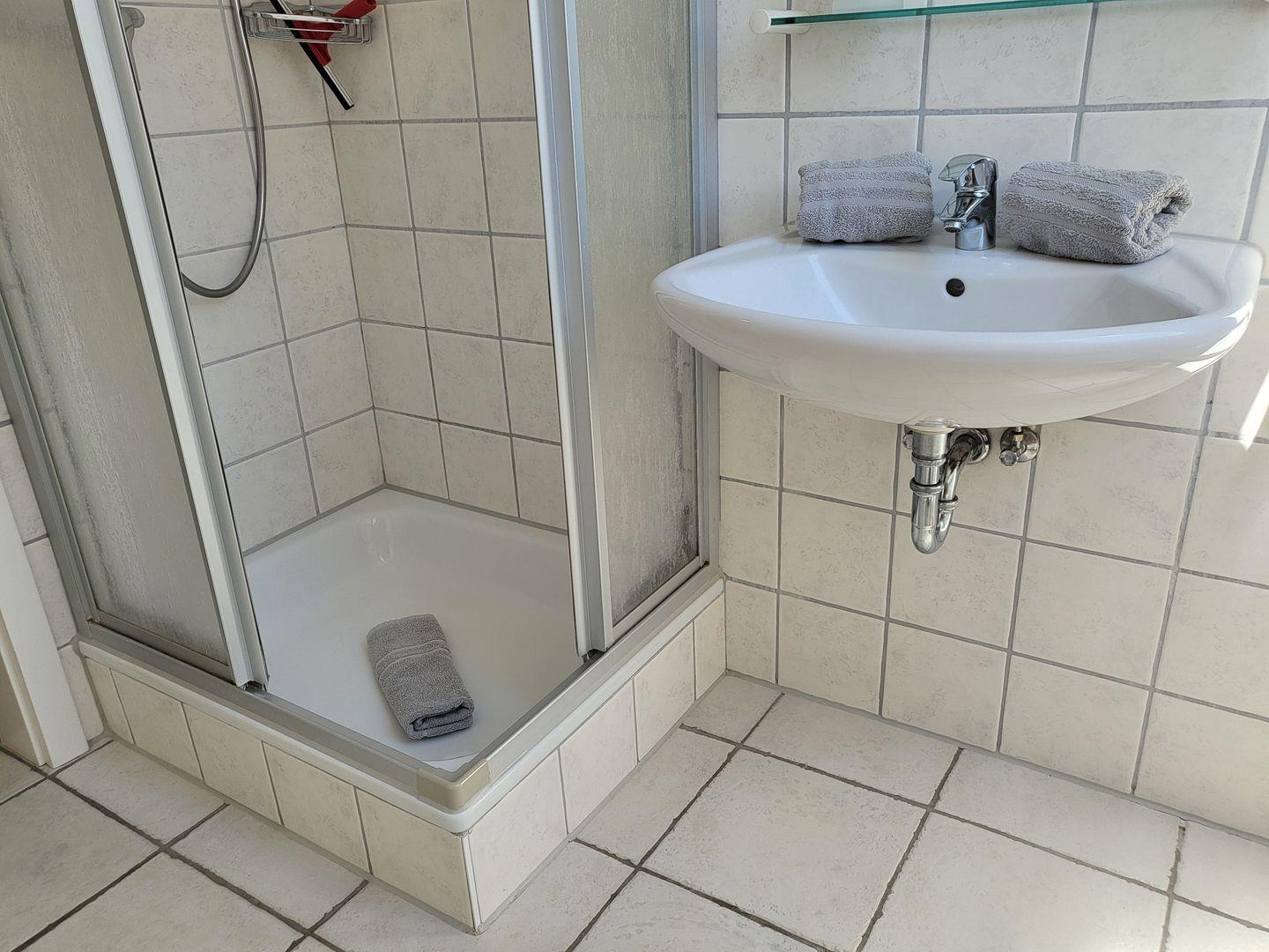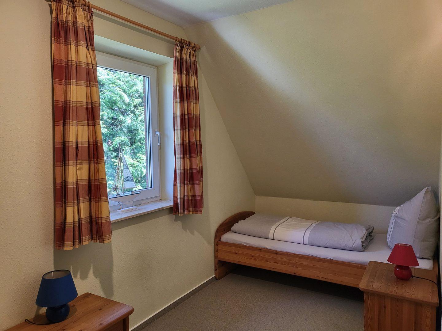 Ins Obergeschoß gelangen sie über den Treppenaufgang im Flur. Dort sind zwei separate Schlafzimmer,eines mit Doppelbett und eines mit zwei Einzelbetten und ein Duschbad mit WC und Fenster.