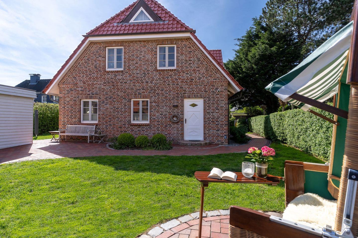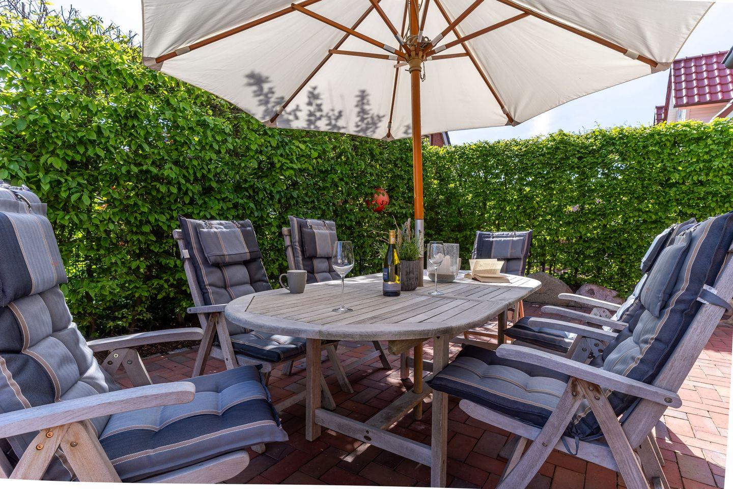 Auf den Terrassen befinden sich Teak-Gartenmöbel und ein Strandkorb. (April - Oktober)