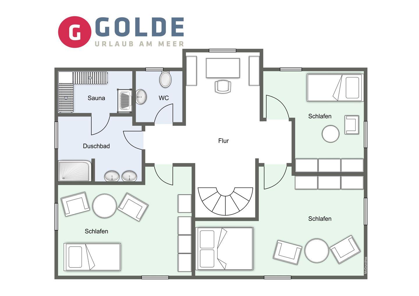 Obergeschoss: ein separater Arbeitsbereich mit Schreibtisch, ein Schlafzimmer mit Doppelbett (180 x 200 cm), Sitzecke und Arbeitsplatz, ein Schlafzimmer mit Einzelbett (80 x 200 cm), Sitzecke und Arbeitsplatz, ein Schlafzimmer mit Einzelbett (80 x 200 cm), ein Duschbad / WC mit angegliederter Sauna, ein separates Gäste-WC