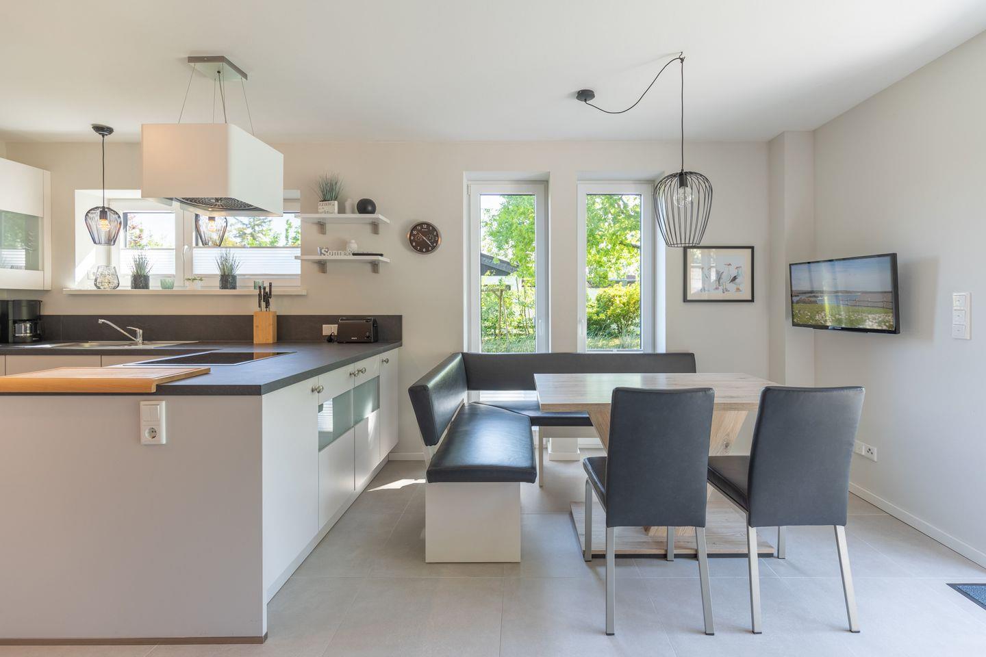 Die offene Küche bietet Ihnen eine komfortable Ausstattung: Geschirrspüler, Kühlschrank, Gefrierfach, Backofen, Ceranfeld mit 4 Kochplatten, Dunstabzugshaube, Filterkaffee-Maschine (Filtergröße 4), Mikrowelle, Wasserkocher und ein Toaster.