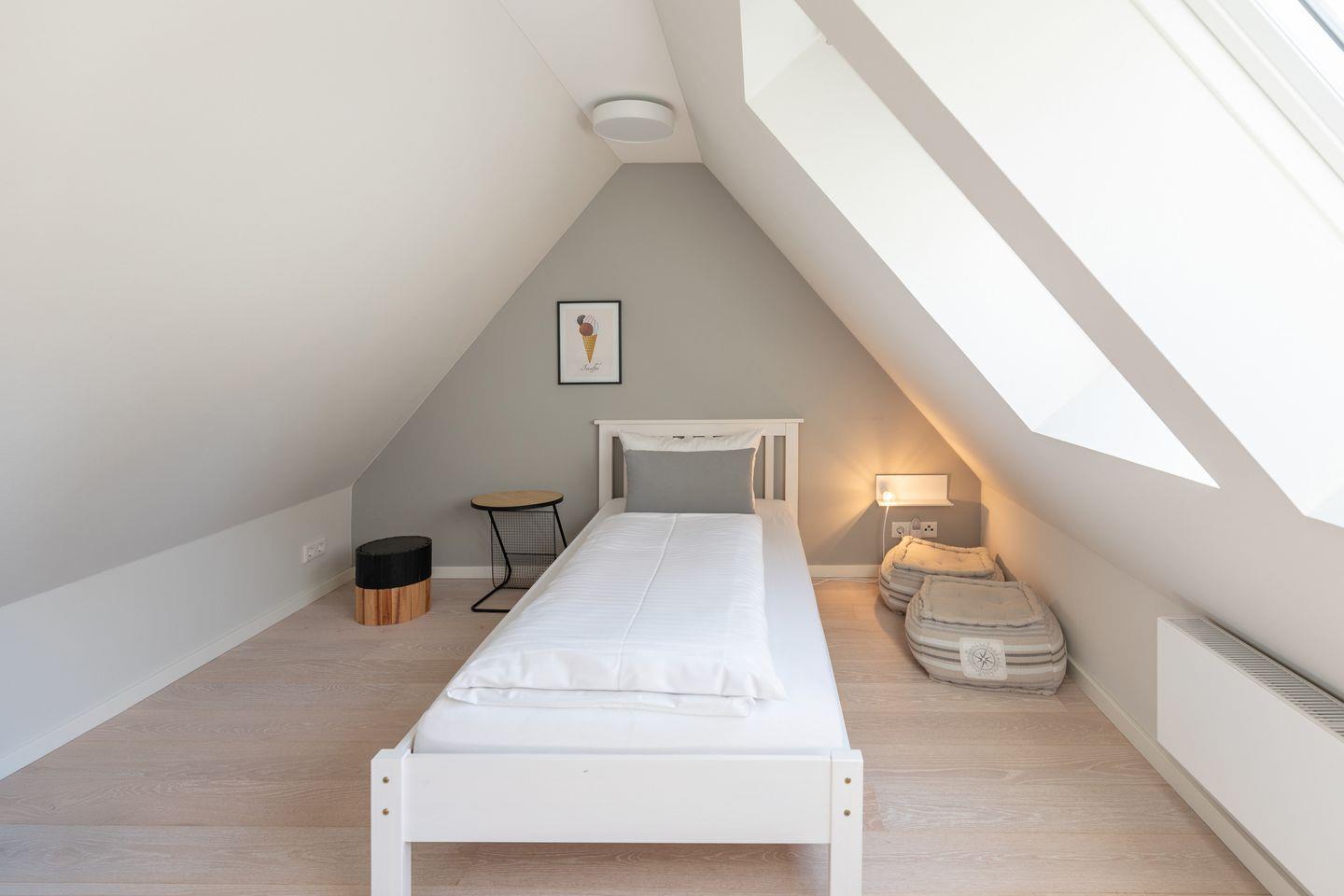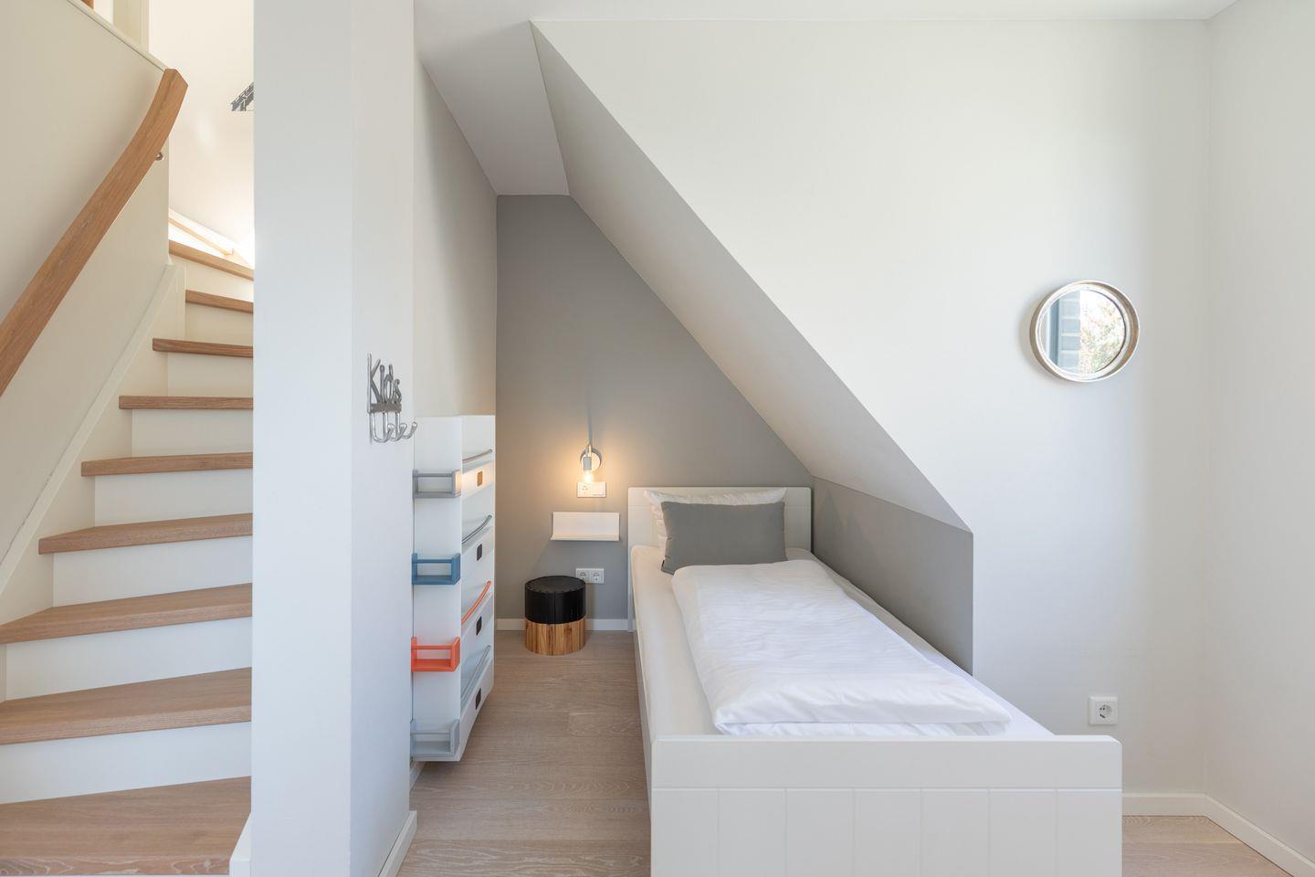 Über eine geschlossene Holztreppe erreichen Sie das erste Obergeschoss mit einem Elternschlafzimmer mit Doppelbett (180x200) und einem weiteren Schlafraum mit zwei Einzelbetten. Über eine weitere Treppe erreichen Sie den ausgebauten Spitzboden mit einem weiteren Einzelbett und einer Spielecke für die Kleinen.