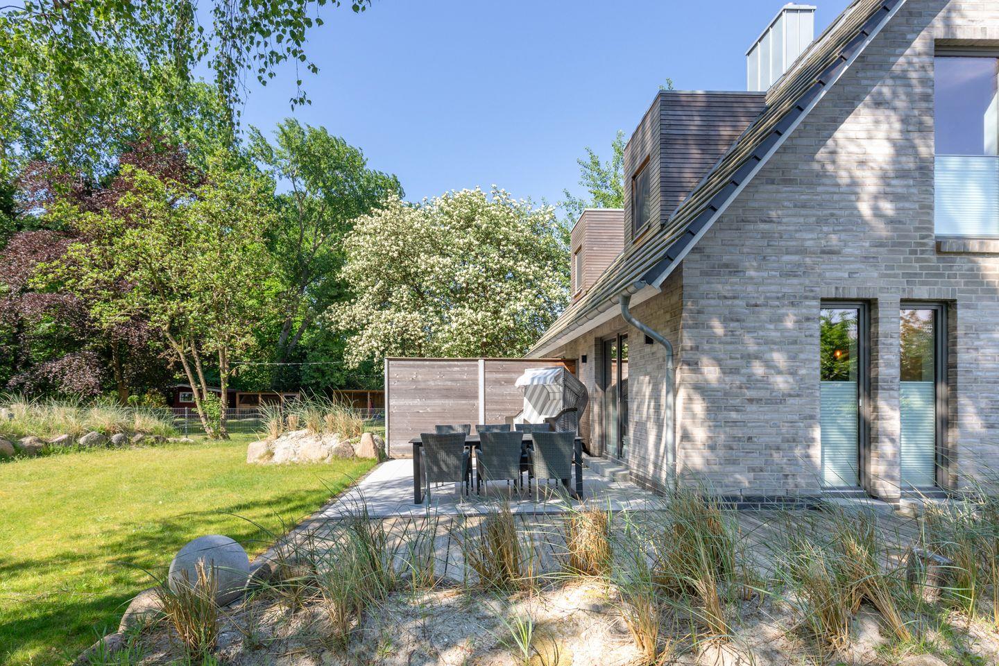 Aus dem Wohnbereich haben Sie Zugang zur großen Terrasse mit Gartenmöbeln und Strandkorb und den fantastischen Blick in einen großen, eingewachsenen Garten.