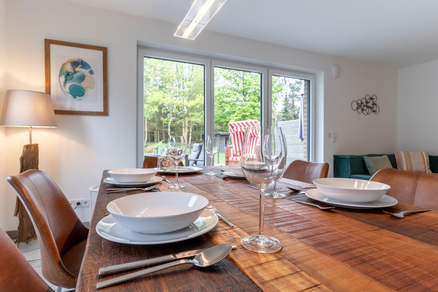 Im Erdgeschoss erwartet Sie ein großzügiger Wohnbereich, der perfekt zum Entspannen und Verweilen einlädt. Eine moderne Küche in strahlendem Weiß mit Induktionsherd und Geschirrspüler lässt keine Wünsche offen. Ein Gästebad mit einer ebenerdigen Dusche sowie Waschmaschine und Trockner sorgen für zusätzlichen Komfort. Von der möblierten Terrasse mit einem einladenden Strandkorb aus öffnet sich der Blick in den großzügigen Garten in herrlicher Südlage.