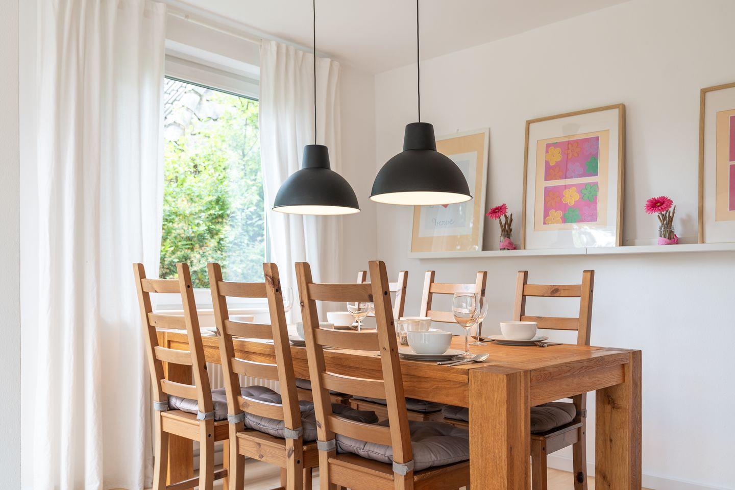 Im Erdgeschoss erwartet Sie ein hübscher, heller Wohnraum mit SAT-TV, WLAN und einer schönen Essecke. Die offenen Küche mit Küchenblock, Geschirrspüler und Backofen lädt zum Kochen ein. Ein Abstellraum und ein Gäste-WC komplettiert die Etage.