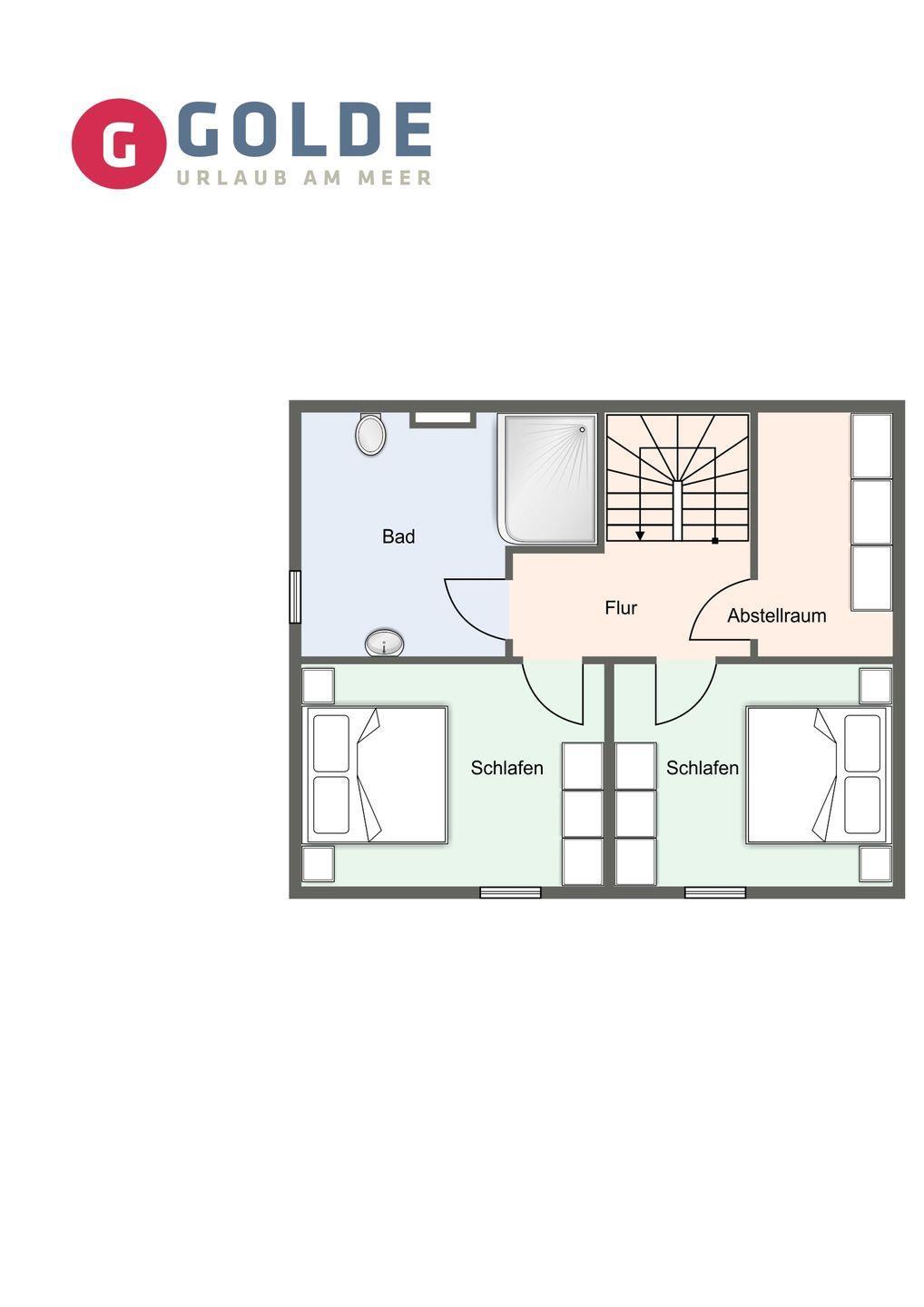 Eine massive Holztreppe führt in das Obergeschoss, wo Ihnen zwei Schlafzimmer mit jeweils einem Doppelbett (1,80 x 2,00) ungestörte Entspannung bieten. Ein großzügiges Vollbad ergänzt diese Etage. Im Dachgeschoss erwartet Sie ein Arbeitszimmer mit einem Schreibtisch, einem bequemen Stuhl, einem hochwertigen TV und einem ausziehbaren Schlafsessel (0,90 x 2,00).