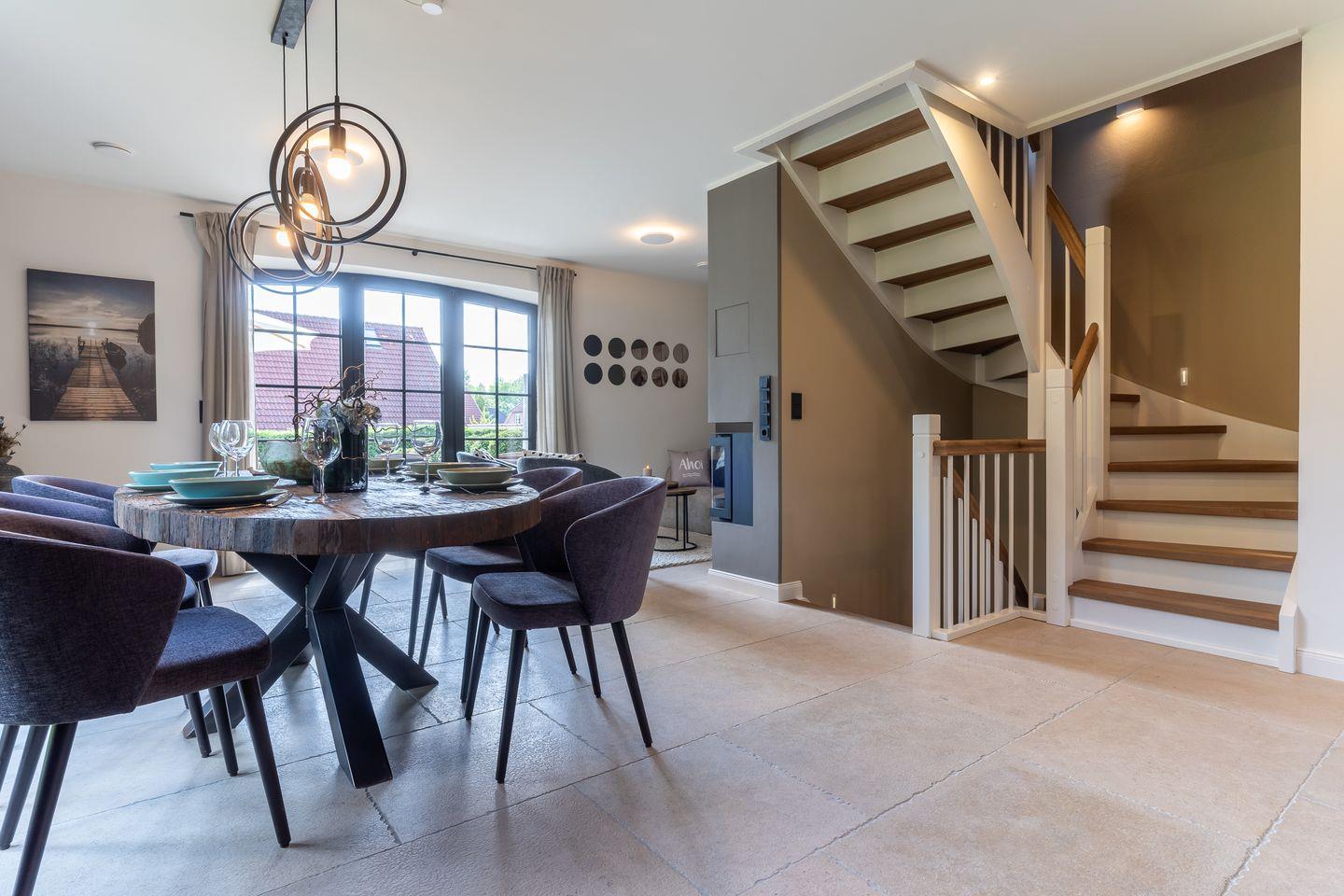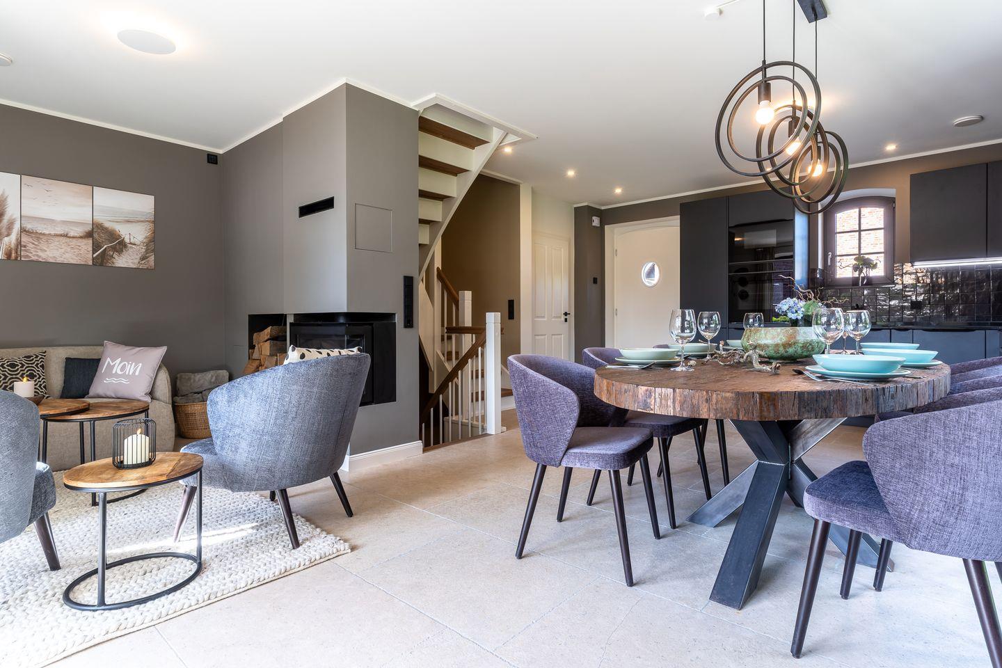 Der großzügige Wohnbereich bietet einen großen Esstisch mit Sitzplätzen für 6 Personen und eine gemütliche Sofaecke am Kamin.