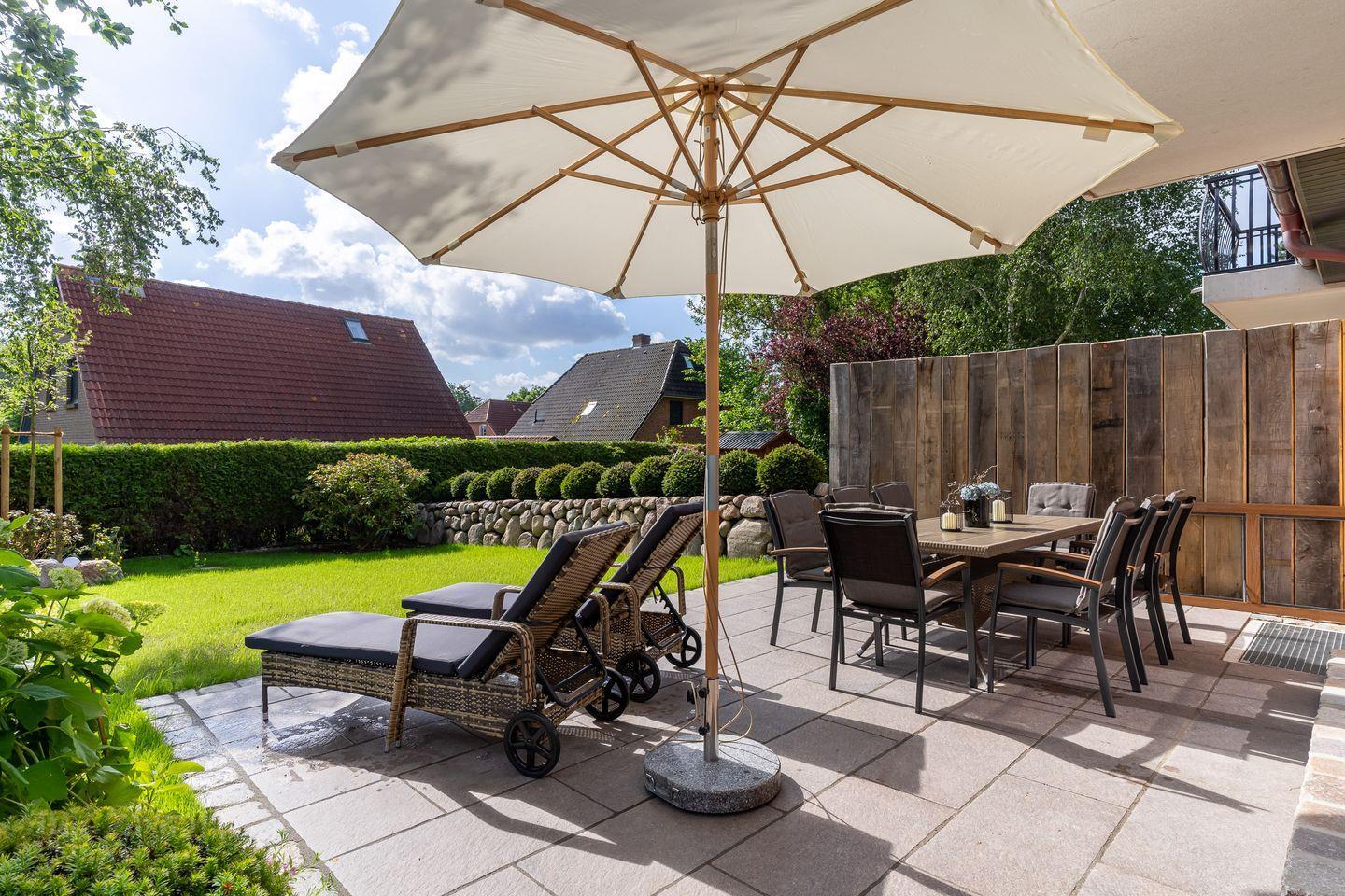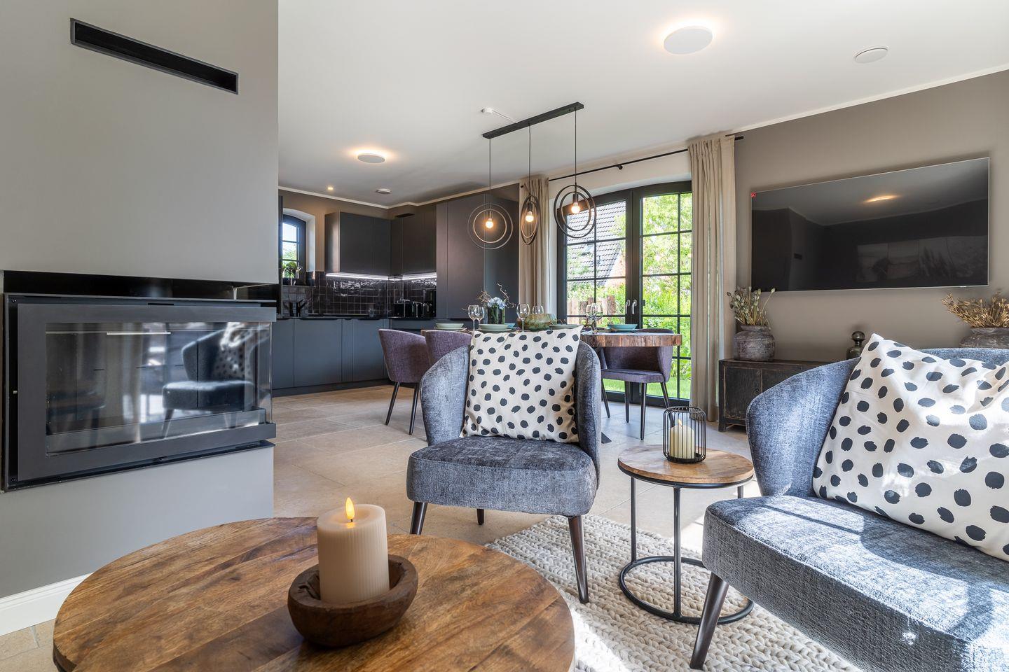 Modern eingerichtete Doppelhaushälfte in Sankt Peter-Ording mit Sauna, Kamin und Terrasse für erholsamen Urlaub.