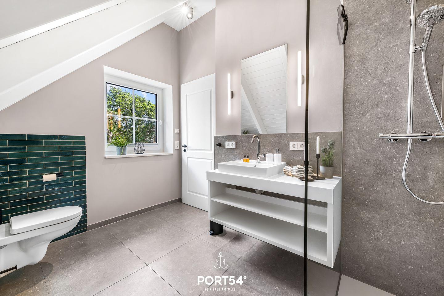 Im Badezimmer erwartet Sie eine bodengleiche Dusche, WC, Waschbecken, Spiegel und Kosmetikspiegel, warmes Wasser sowie ein Fenster. Ein Haartrockner ist vorhanden.