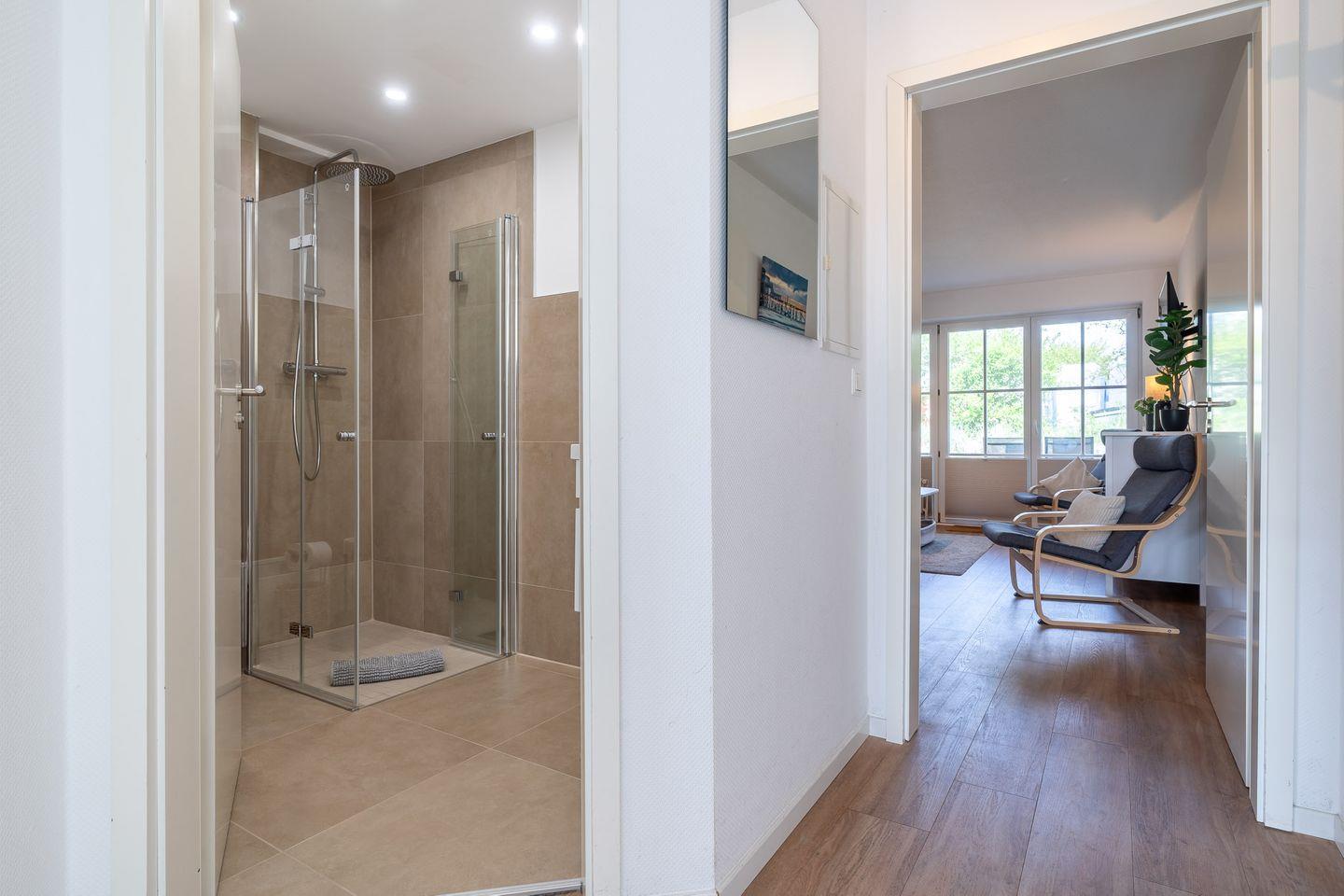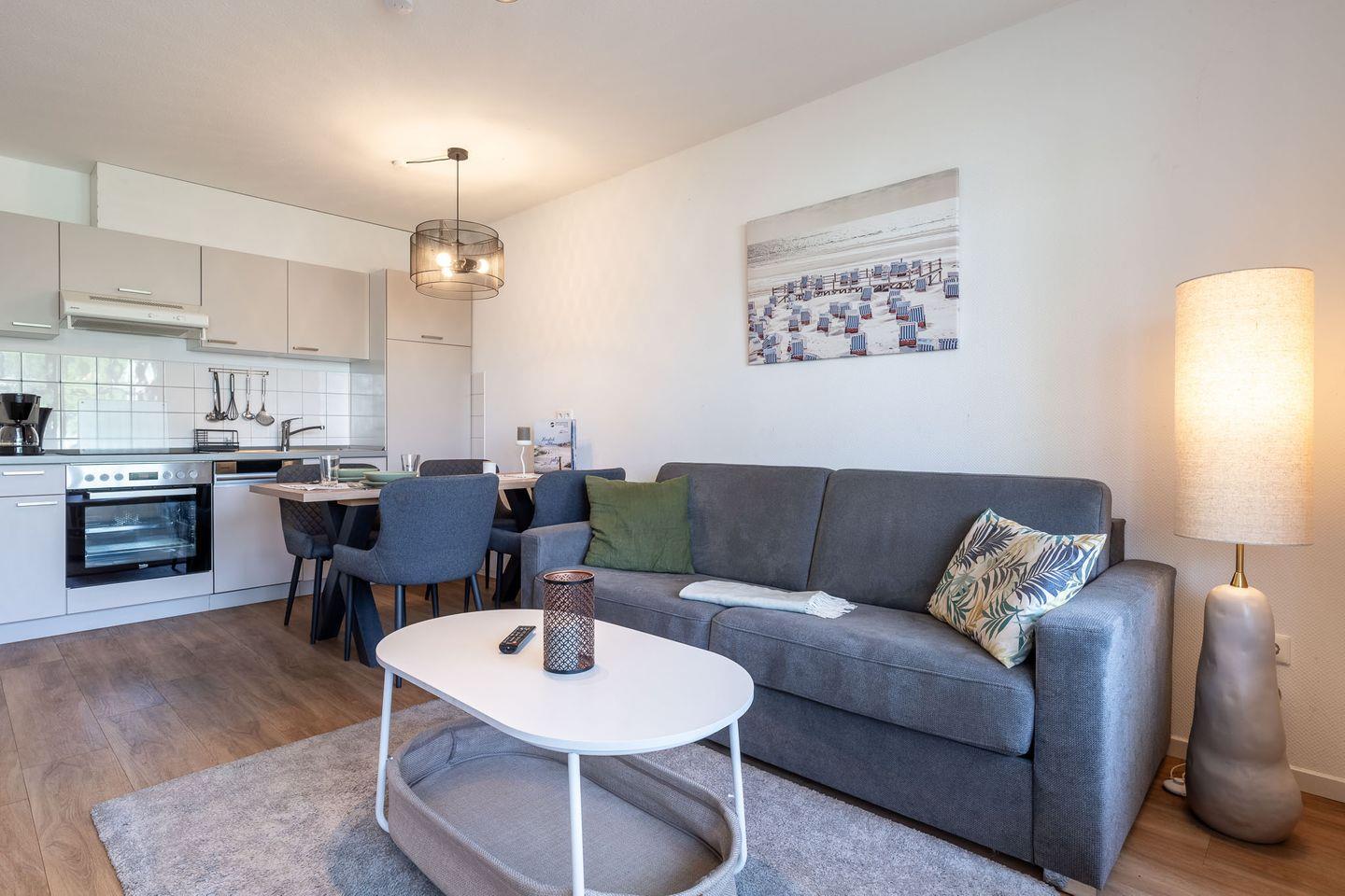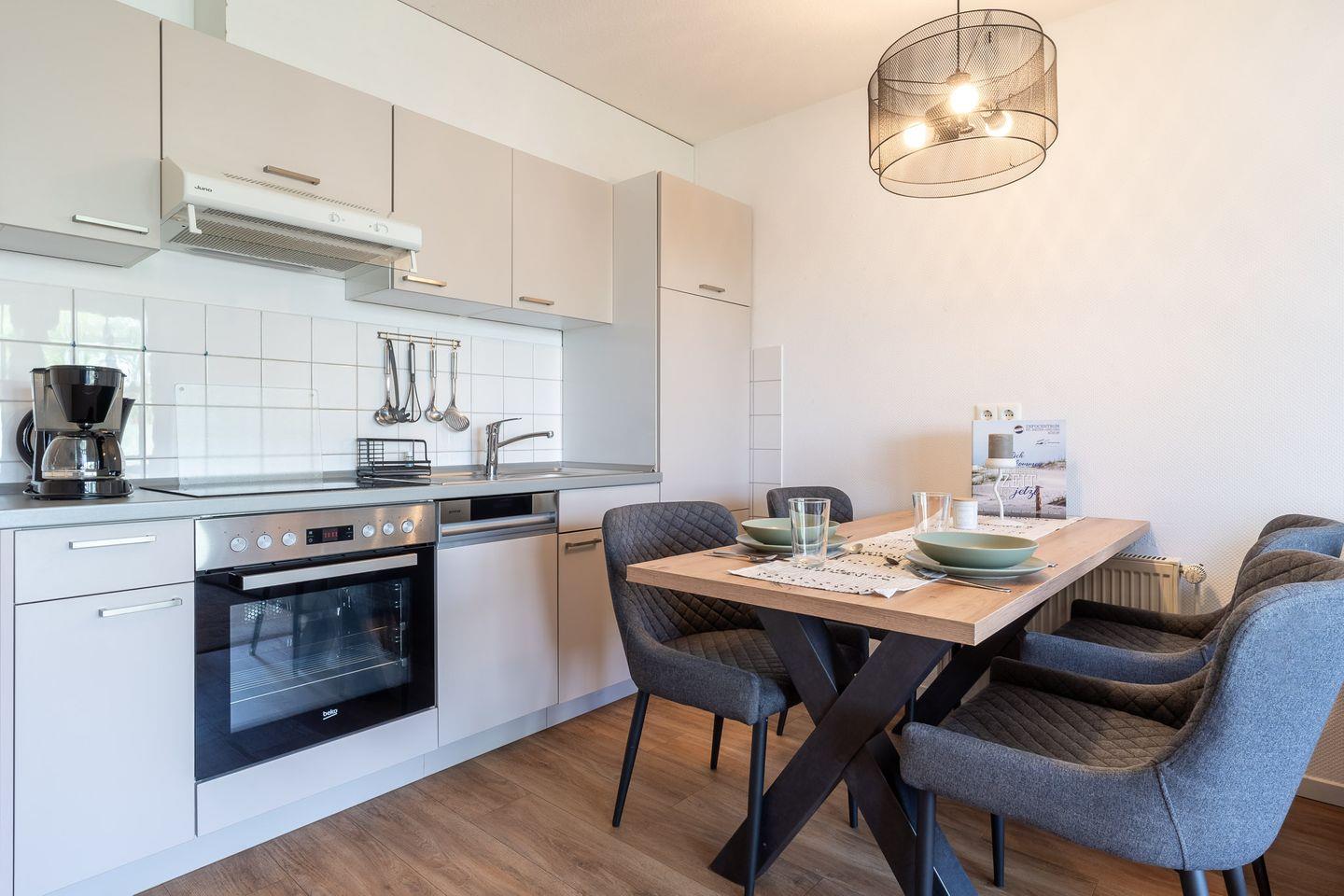 Die Wohnung verfügt über ein Schlafzimmer mit einem Doppelbett (Boxspringbett 1,80 x 2). Im Wohnraum befindet sich ein komfortables Schlafsofa, das für zusätzliche Schlafmöglichkeiten sorgt. Das Wohnzimmer ist gleichzeitig der Essbereich und bietet ausreichend Platz für gemütliche Abende oder gemeinsame Mahlzeiten. Die offene Küchenzeile ist mit allem ausgestattet, was man für eine Selbstversorgung benötigt, einschließlich Geschirrspüler und Backofen. Hier können Sie sich nach Lust und Laune kulinarisch verwöhnen und Ihre Lieblingsgerichte zaubern. Das Badezimmer wurde komplett erneuert und ist mit einer bodengleichen Dusche ausgestattet.