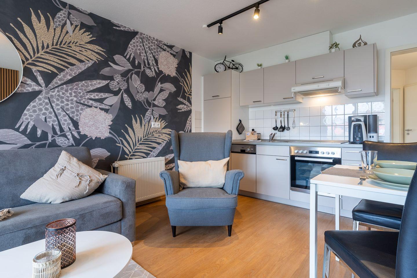 Der Wohnbereich dient gleichzeitig als Essbereich und bietet ausreichend Platz für gesellige Abende und gemeinsame Mahlzeiten. In der offenen Küchenzeile finden Sie alles, was Sie für die Selbstversorgung benötigen, inklusive Geschirrspüler und Backofen. Hier können Sie nach Herzenslust kochen und Ihre Lieblingsgerichte zubereiten. Das Badezimmer wurde komplett erneuert, verfügt über eine bodengleiche Dusche und wurde modern und zeitlos gestaltet.