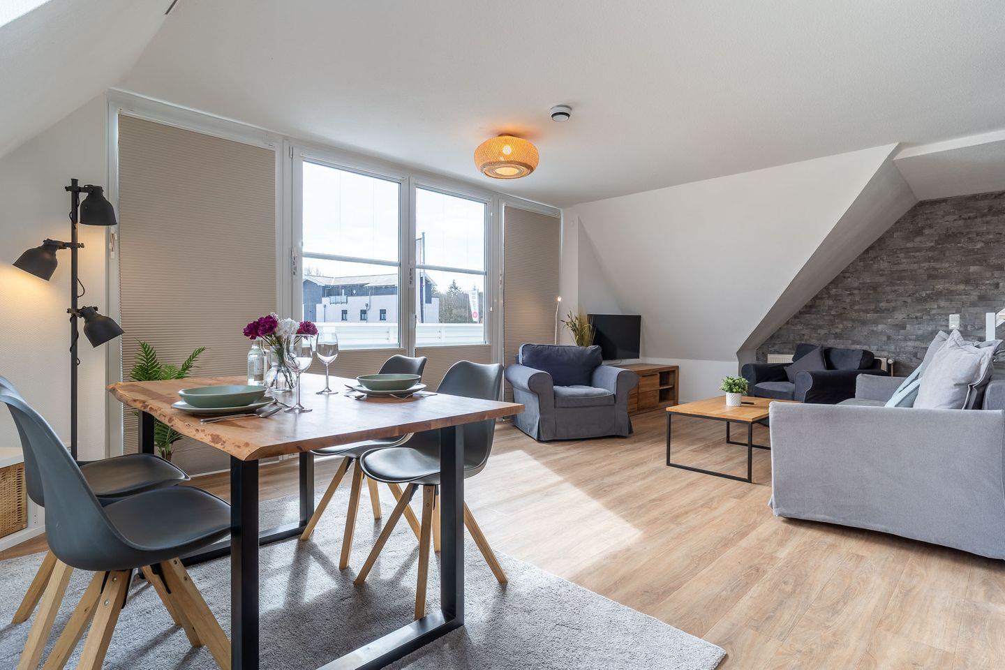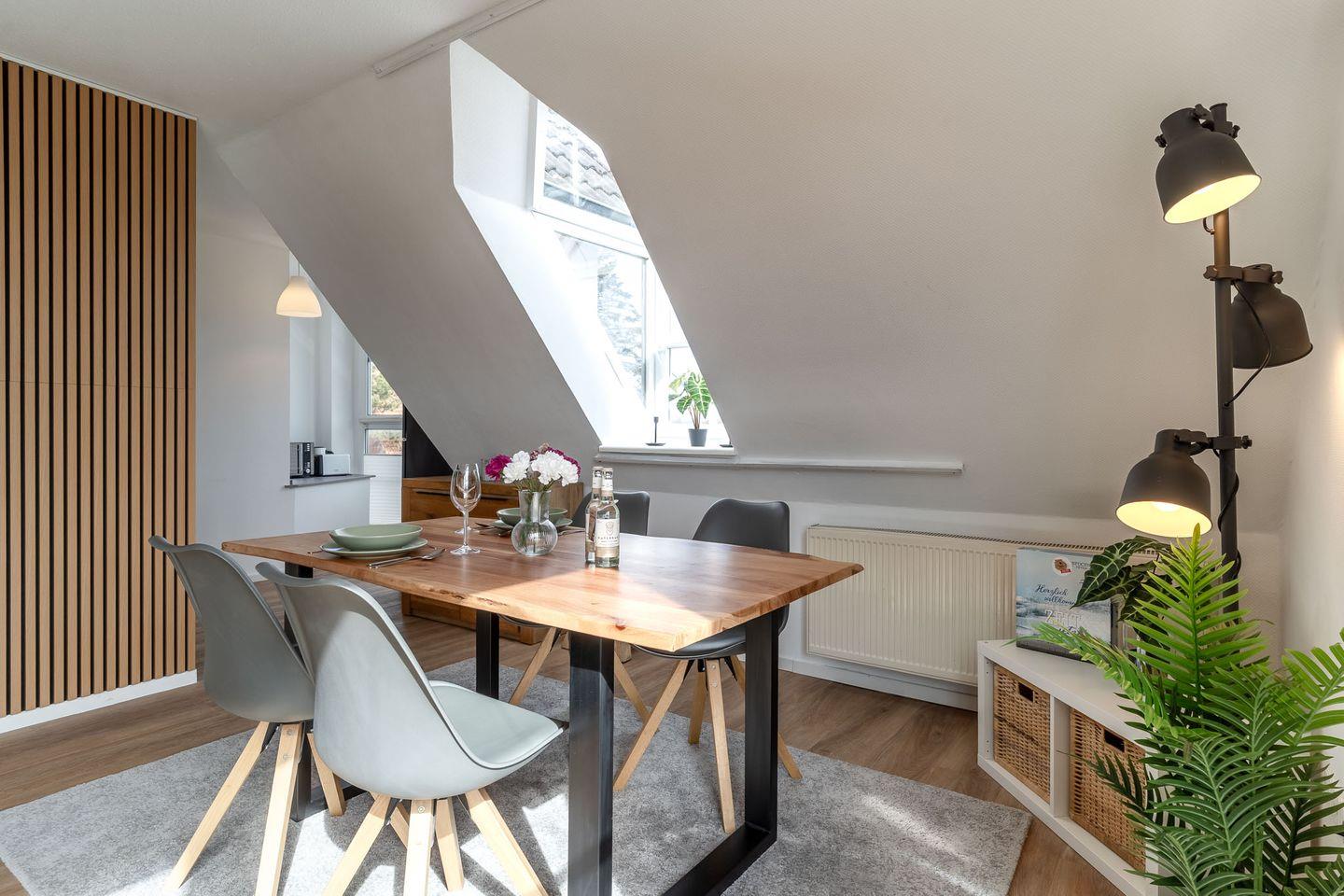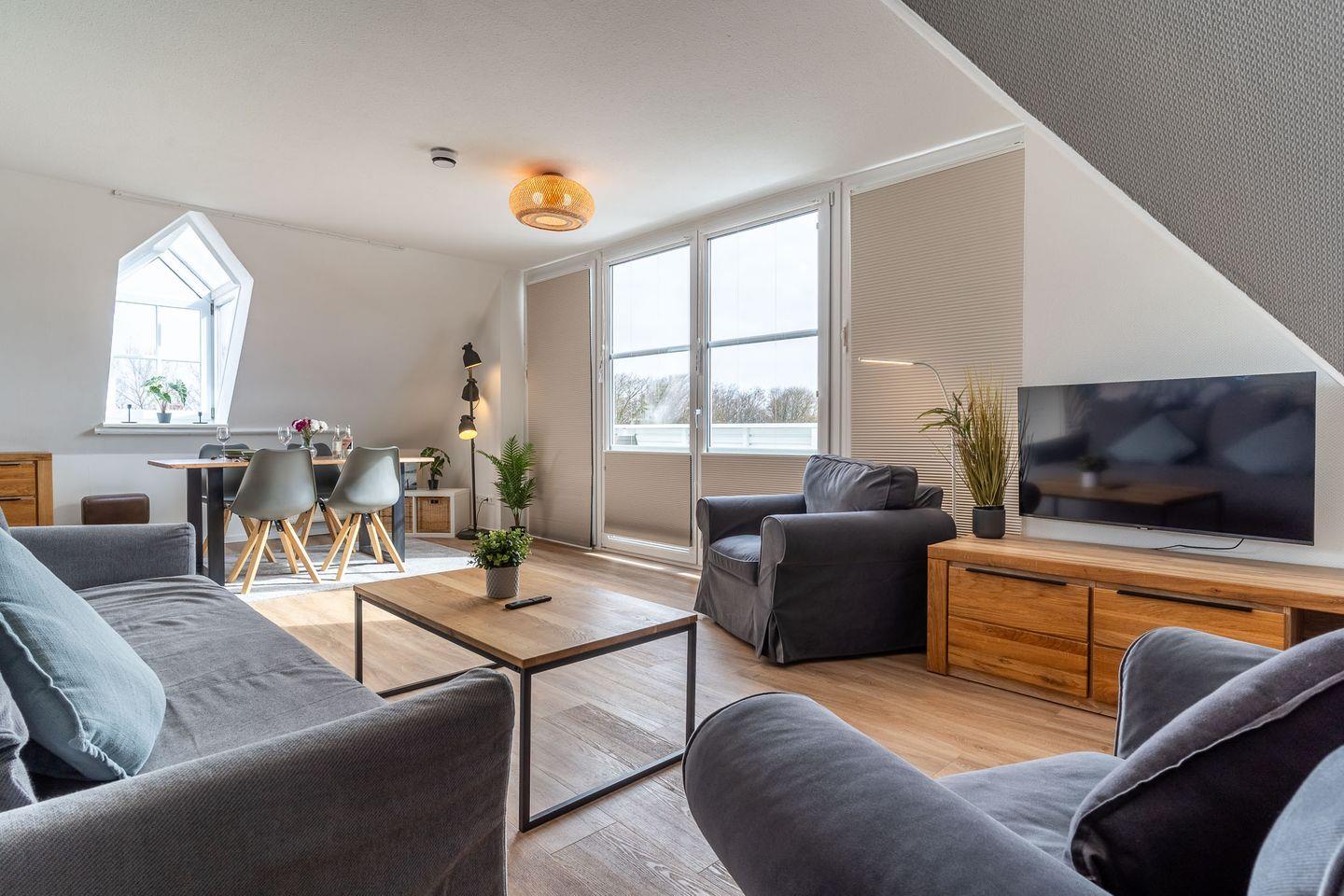 Genießen Sie Ihren Urlaub in unserer modernen Maisonette-Wohnung "De Wohnstuv". Mit 65 qm über zwei Etagen bietet sie Platz für bis zu vier Personen. Der Balkon mit herrlichem Ausblick, eine voll ausgestattete Küche, kostenloses WLAN, Smart TV, und die Möglichkeit, Haustiere mitzubringen, machen Ihren Aufenthalt perfekt.