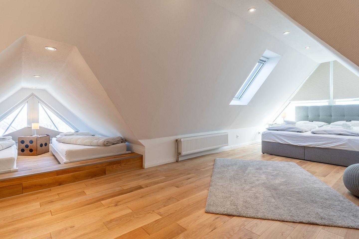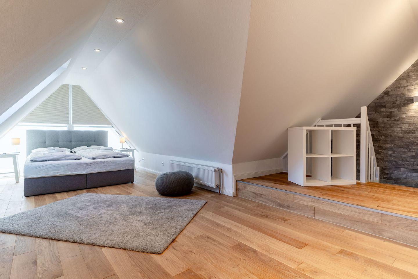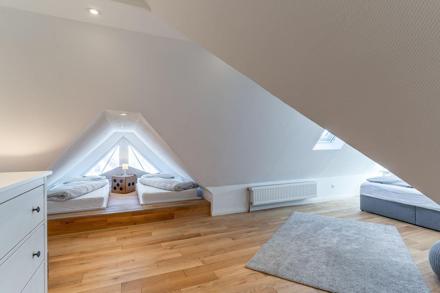 Über eine stilvolle Treppe gelangen Sie in den offenen Schlafraum im 2. Obergeschoss. Dieser Raum ist ebenfalls frisch saniert und mit einem hochwertigen Eichenboden ausgestattet. Hier erwartet Sie ein gemütliches Boxspringbett (160x200), sowie zwei Einzelbetten (90x200). Kostenloses WLAN steht Ihnen in der gesamten Wohnung zur Verfügung, sodass Sie jederzeit in Verbindung bleiben können.