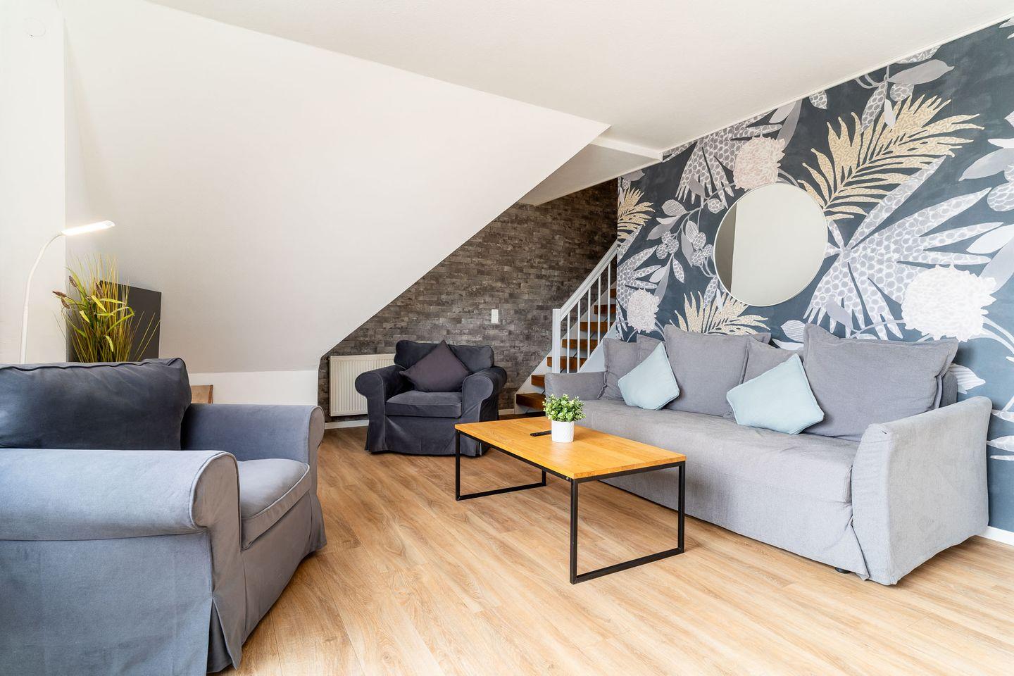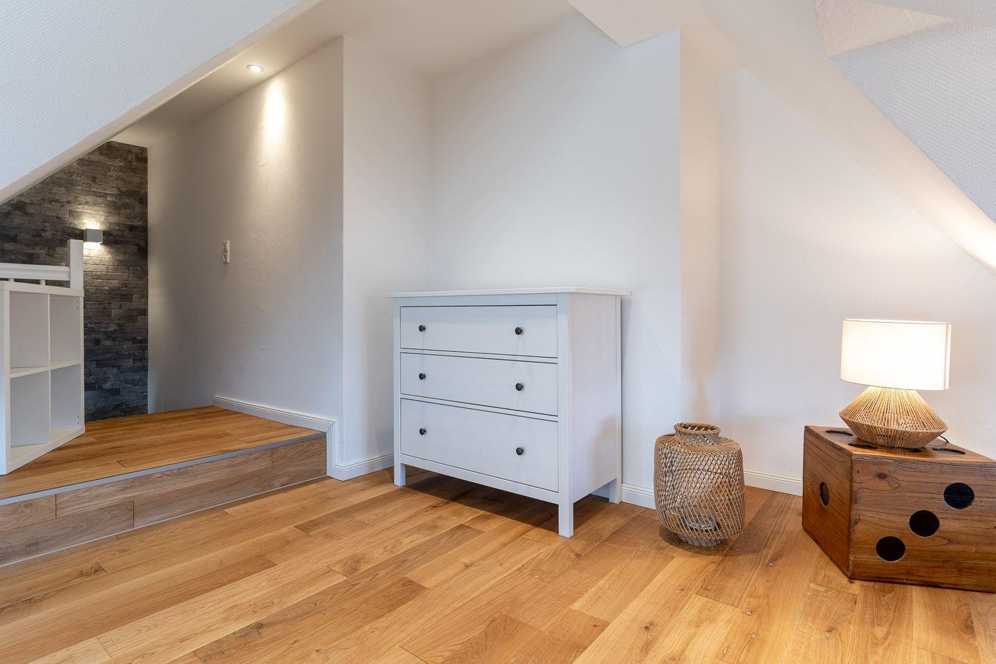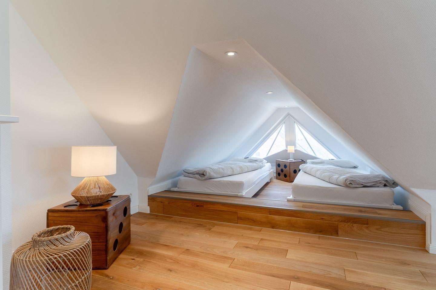 Über eine stilvolle Treppe gelangen Sie in den offenen Schlafraum im 2. Obergeschoss. Dieser Raum ist ebenfalls frisch saniert und mit einem hochwertigen Eichenboden ausgestattet. Hier erwartet Sie ein gemütliches Boxspringbett (160x200), sowie zwei Einzelbetten (90x200). Kostenloses WLAN steht Ihnen in der gesamten Wohnung zur Verfügung, sodass Sie jederzeit in Verbindung bleiben können.