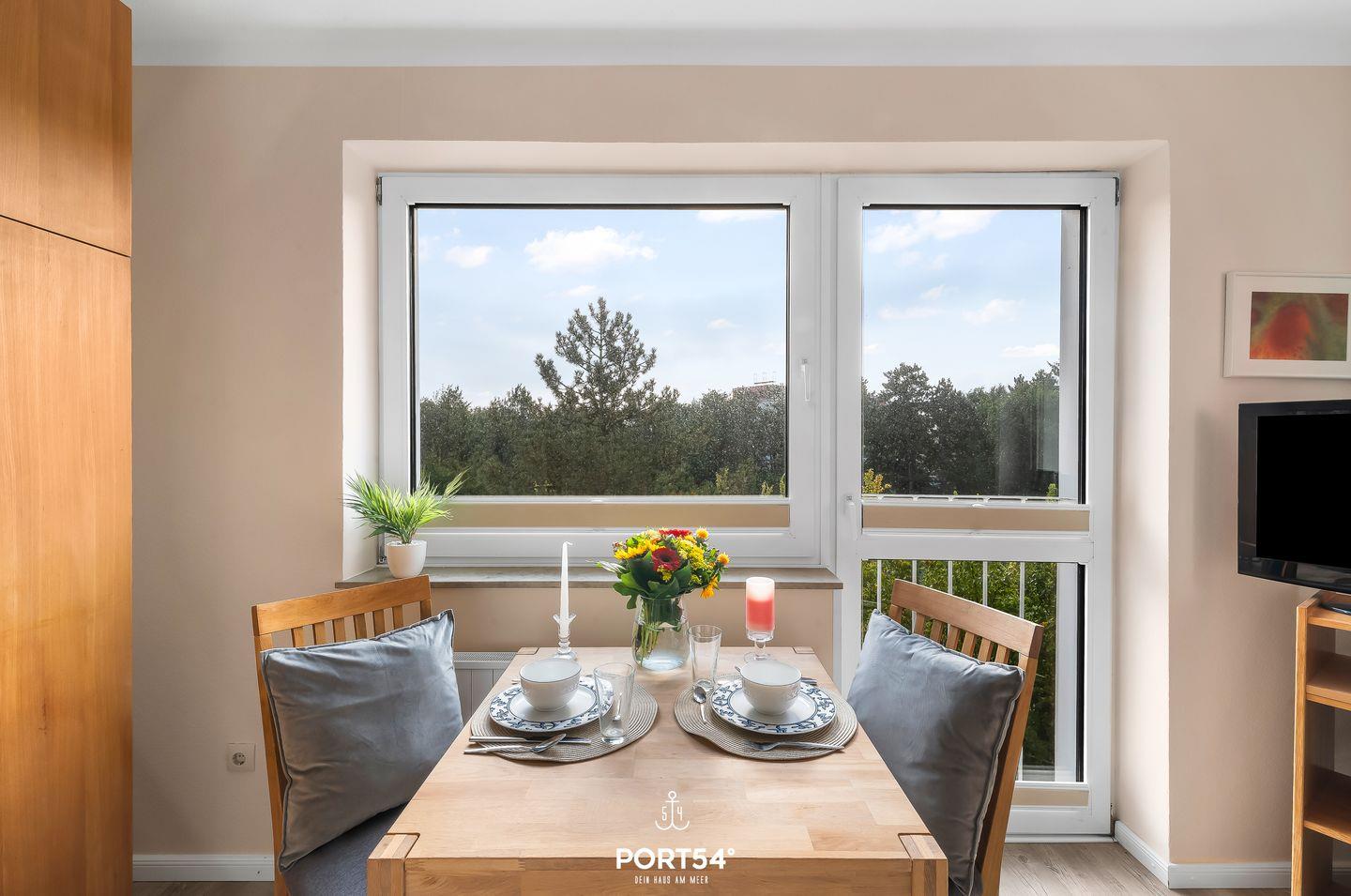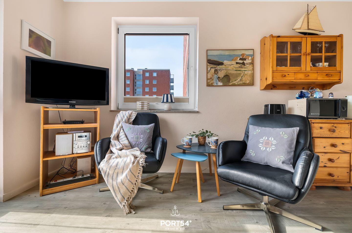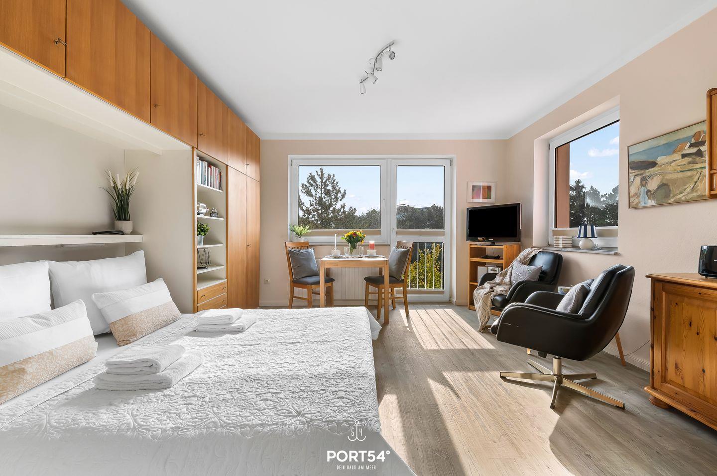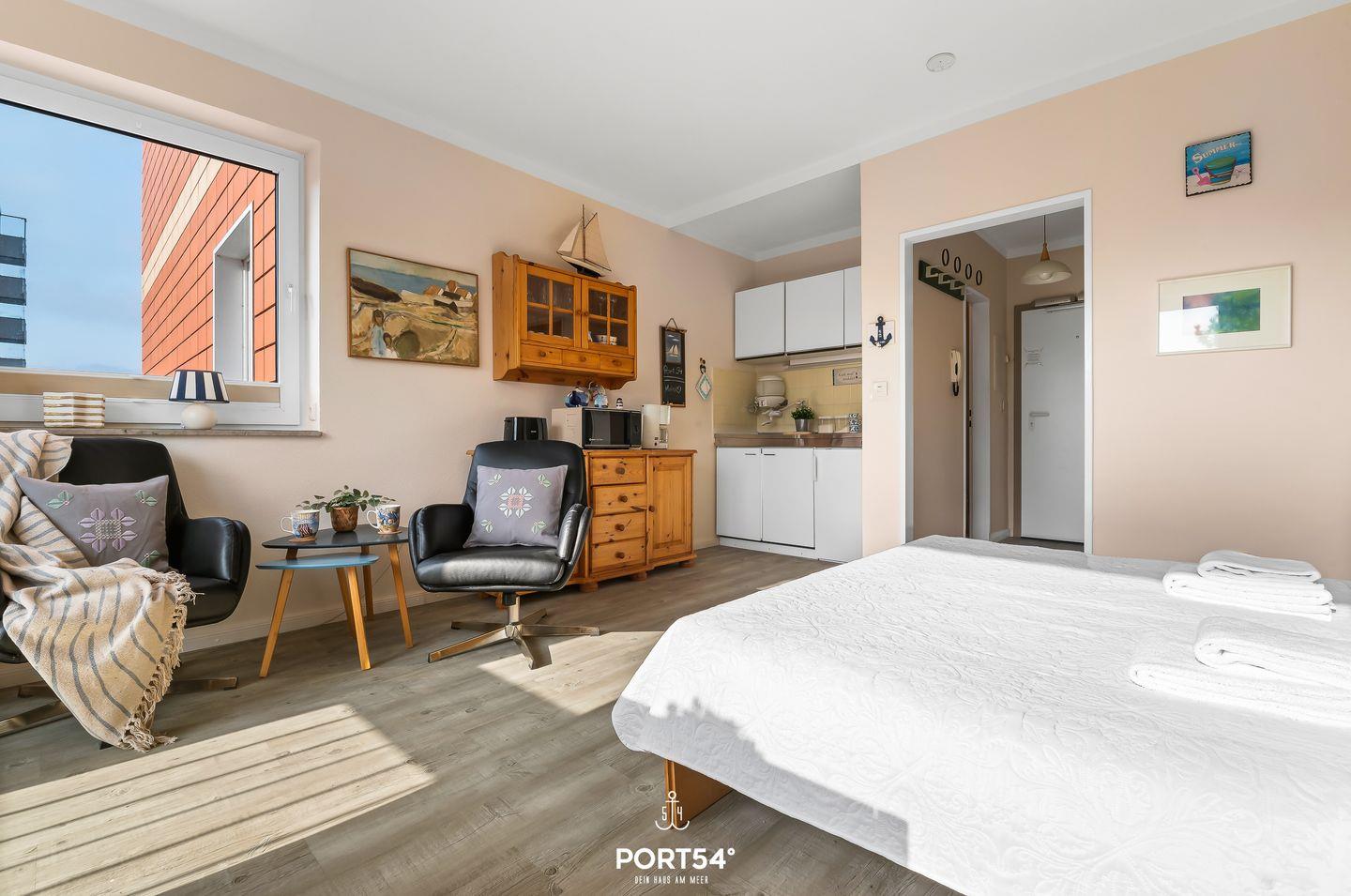 Die Wohnung für 2 Personen bietet in nur einem Zimmer Platz für alle wünschenswerten Annehmlichkeiten, wie eine voll ausgestattete Küche sowie gemütliche Sessel und ein Smart-TV, bieten Ihnen vollsten Komfort.