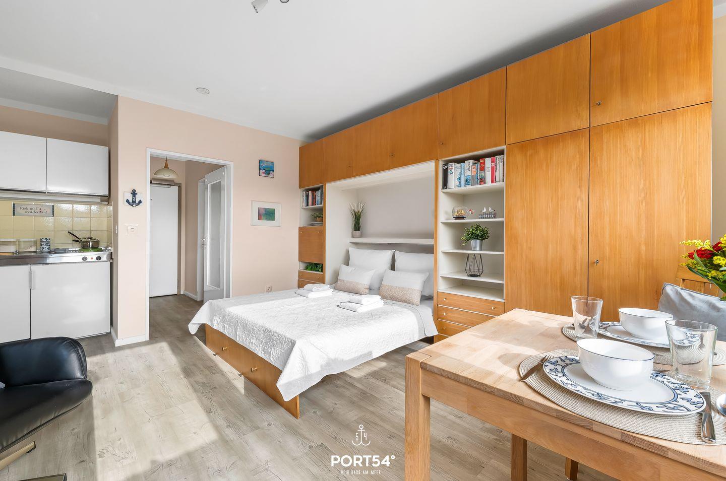 Die Wohnung bietet Platz für 2 Personen und verfügt über ein gemütliches Schrankbett und einen offenen Wohn- und Essbereich, eine voll ausgestattete Küche. Kostenfreier Parkplatz vorhanden. Willkommen an der Nordsee!
