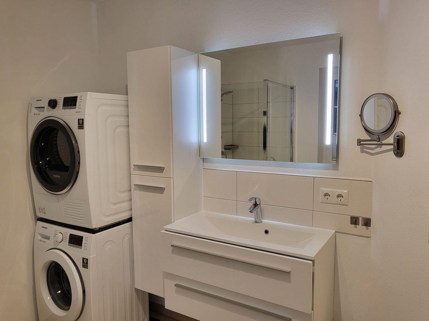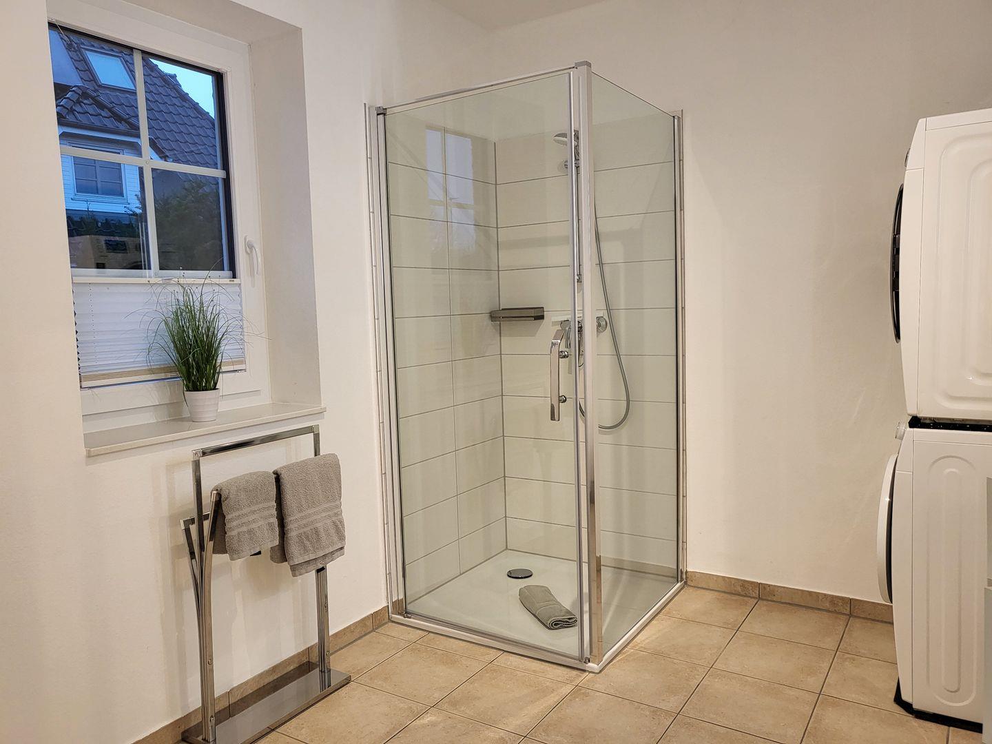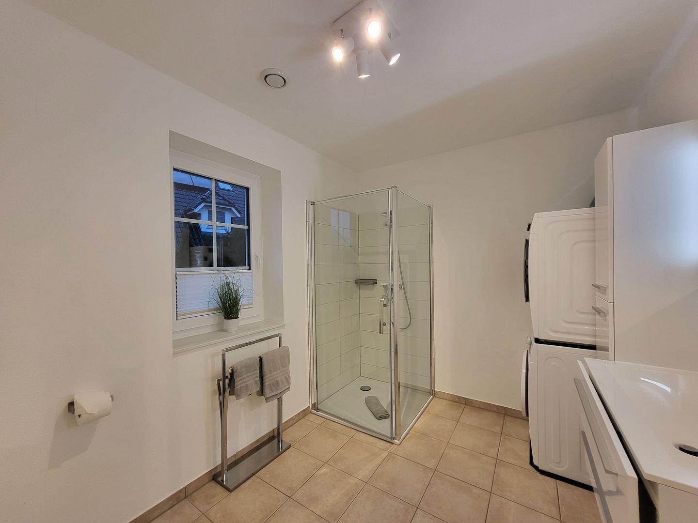 Ebenso ist im Erdgeschoss ein geräumiger Flur mit Garderobe und ein Bad mit ebenerdiger Dusche, WC, Waschmaschine und Trockner.
