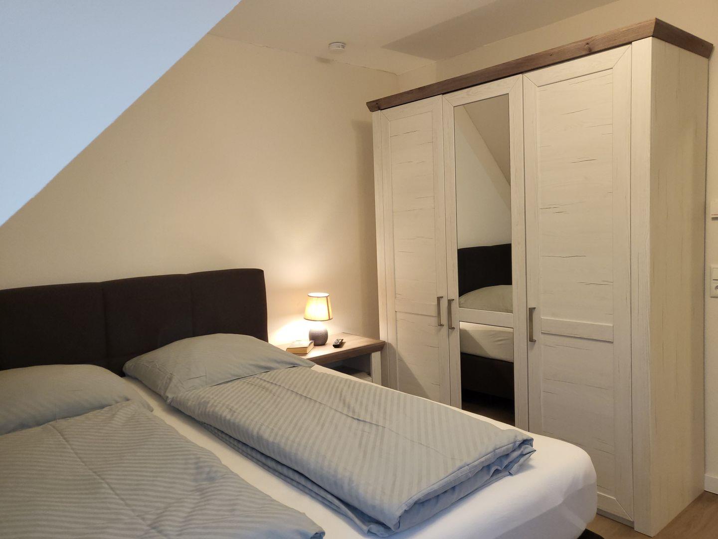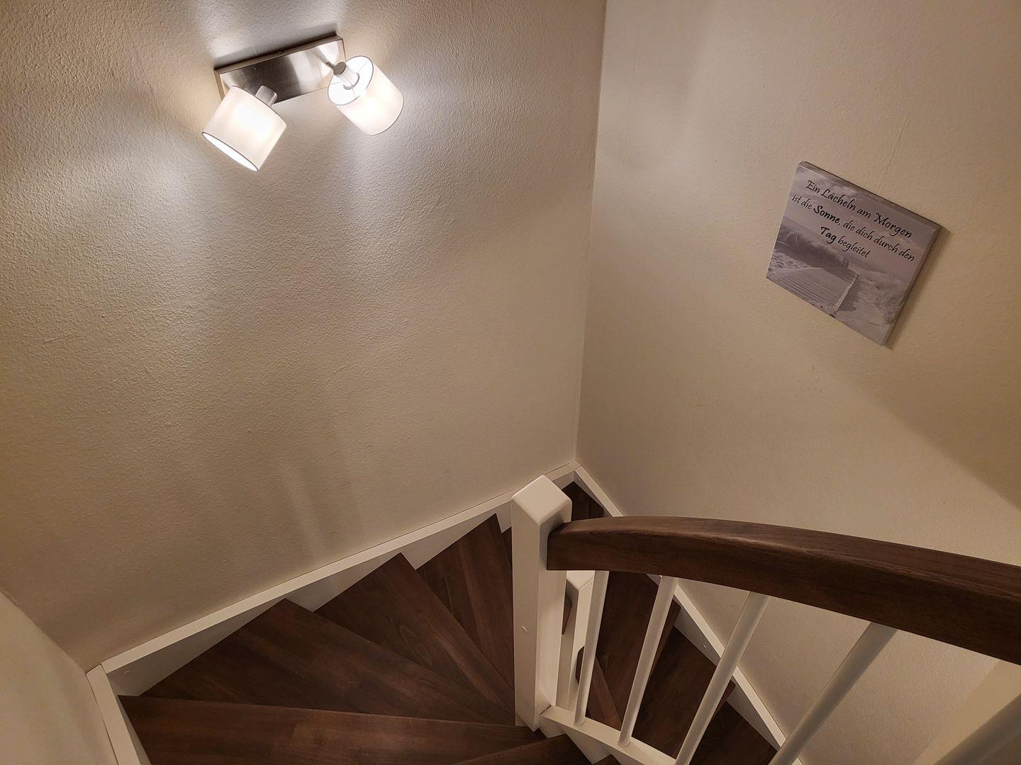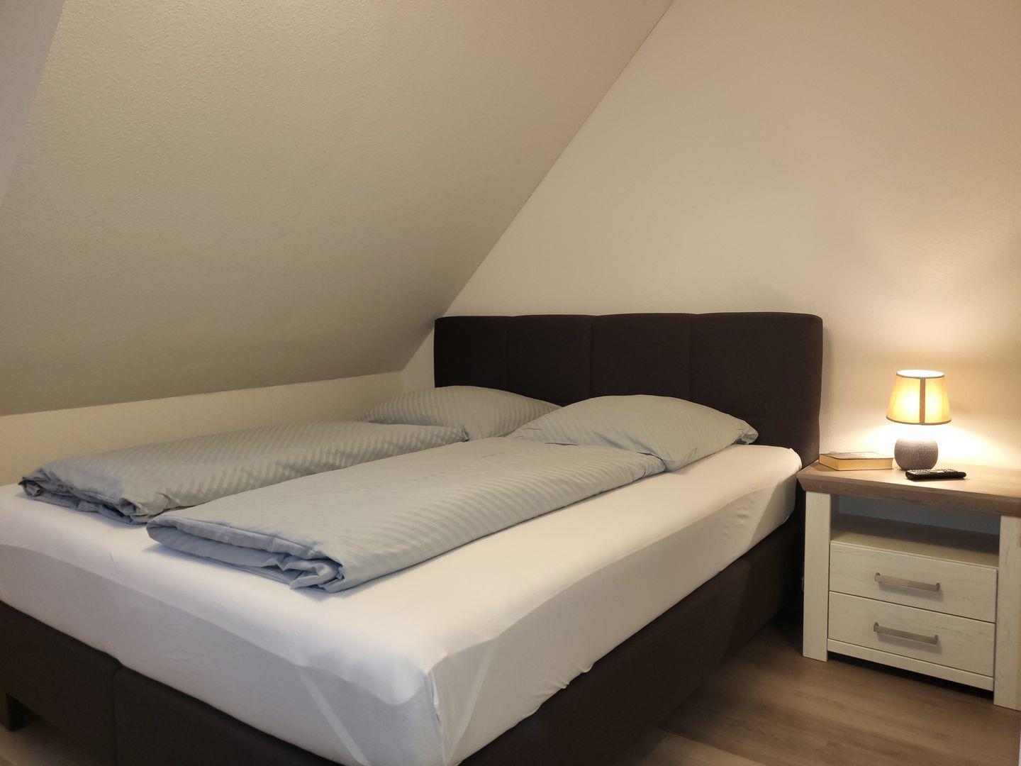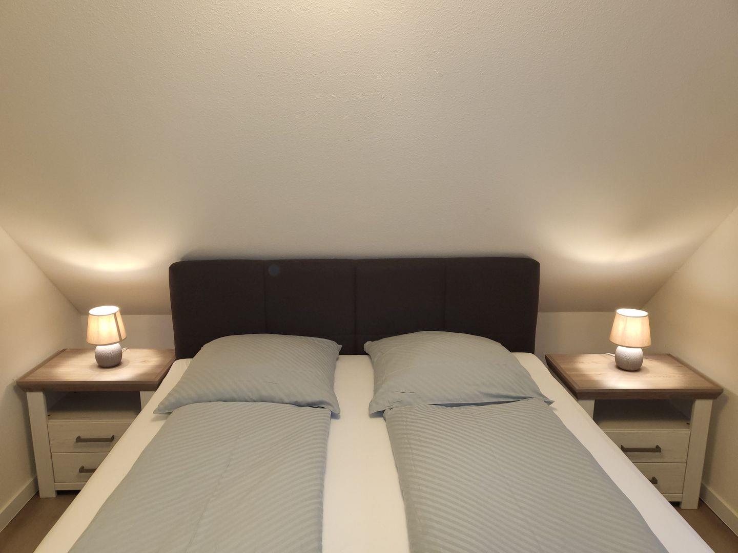 Über eine offene Holztreppe gelangt man in das helle Obergeschoss. Die zwei Schlafzimmer, mit je einem Doppel Boxspringbett (180 x 200 cm) bieten eine ruhevollen Schlaf.