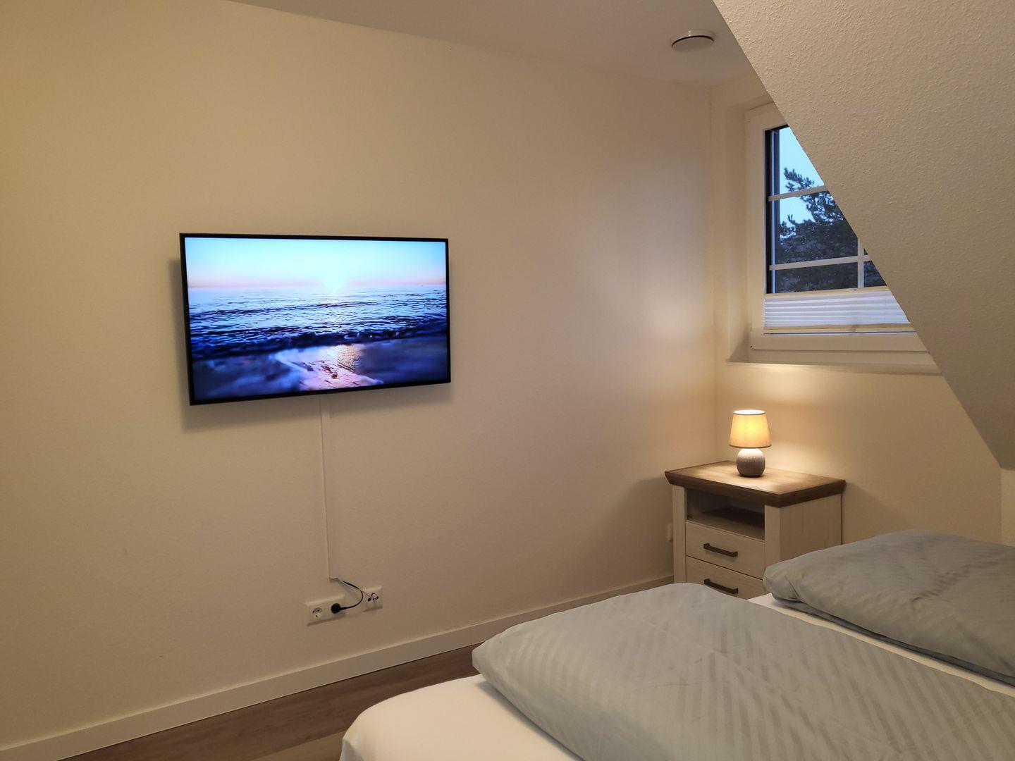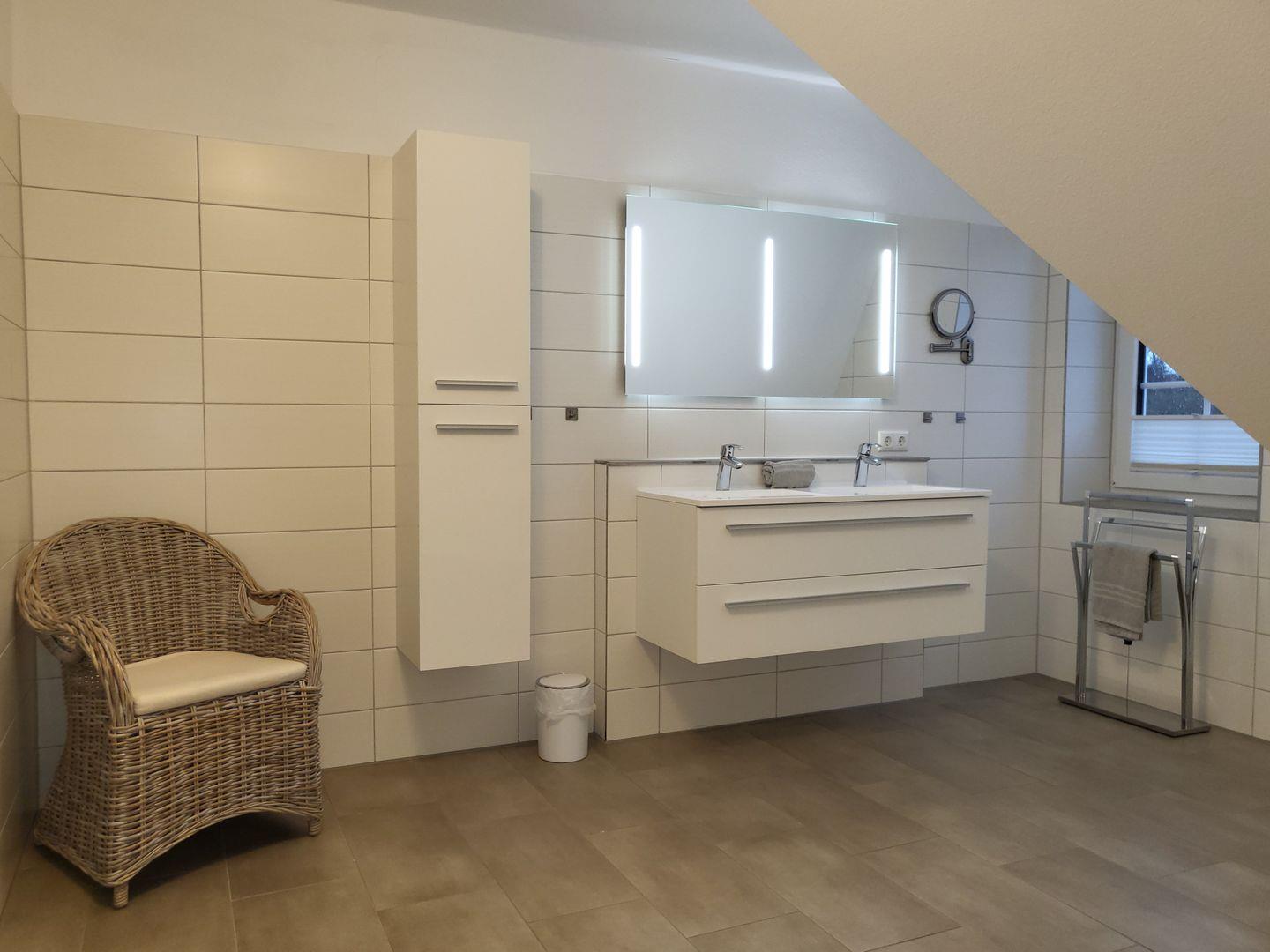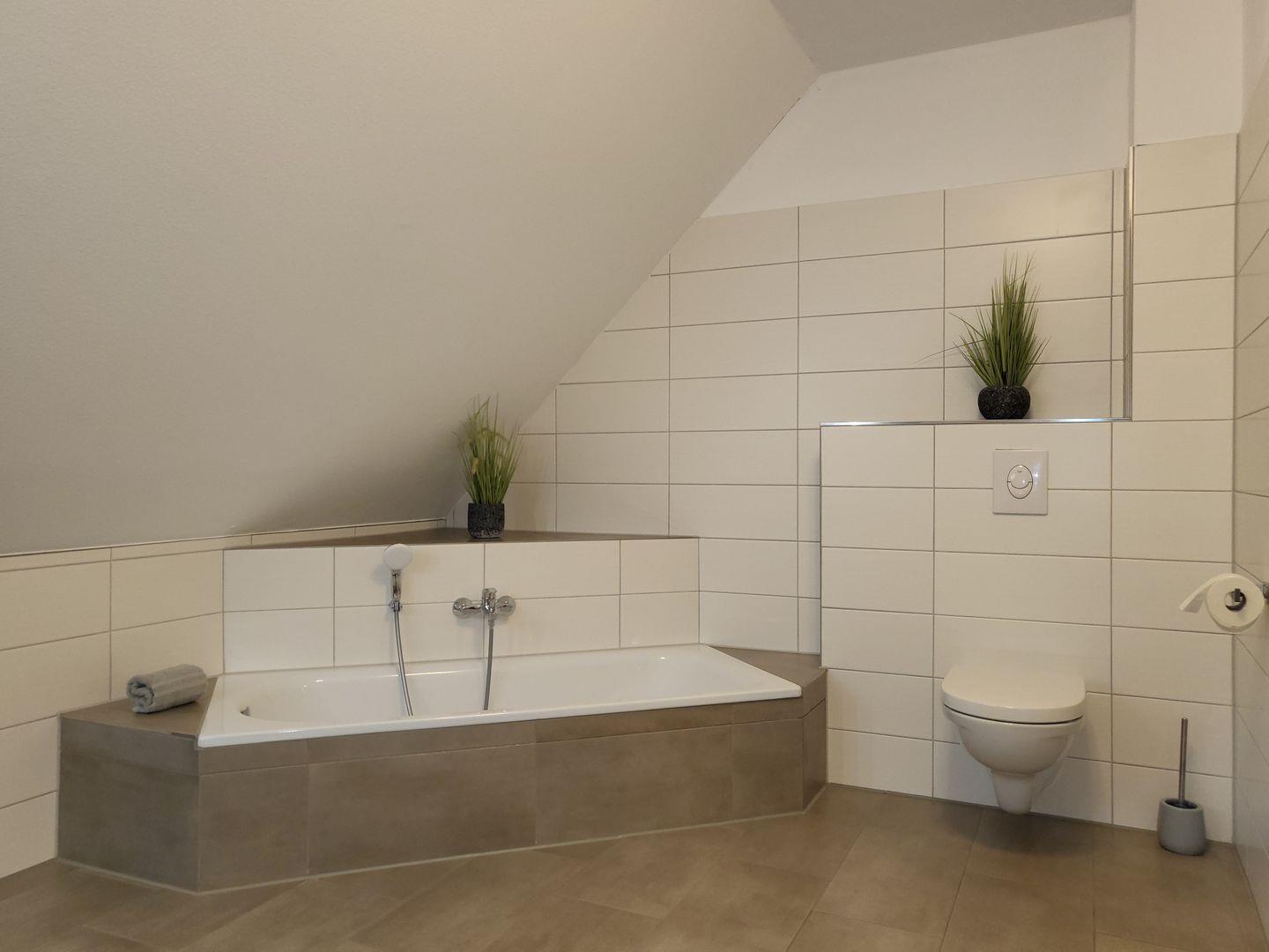 Eines ist zusätzlich mit einem Flachbild-TV ausgestattet. Darüber hinaus befindet sich im Obergeschoss auch ein geräumiges Bad mit separater, ebenerdiger Dusche und Badewanne.