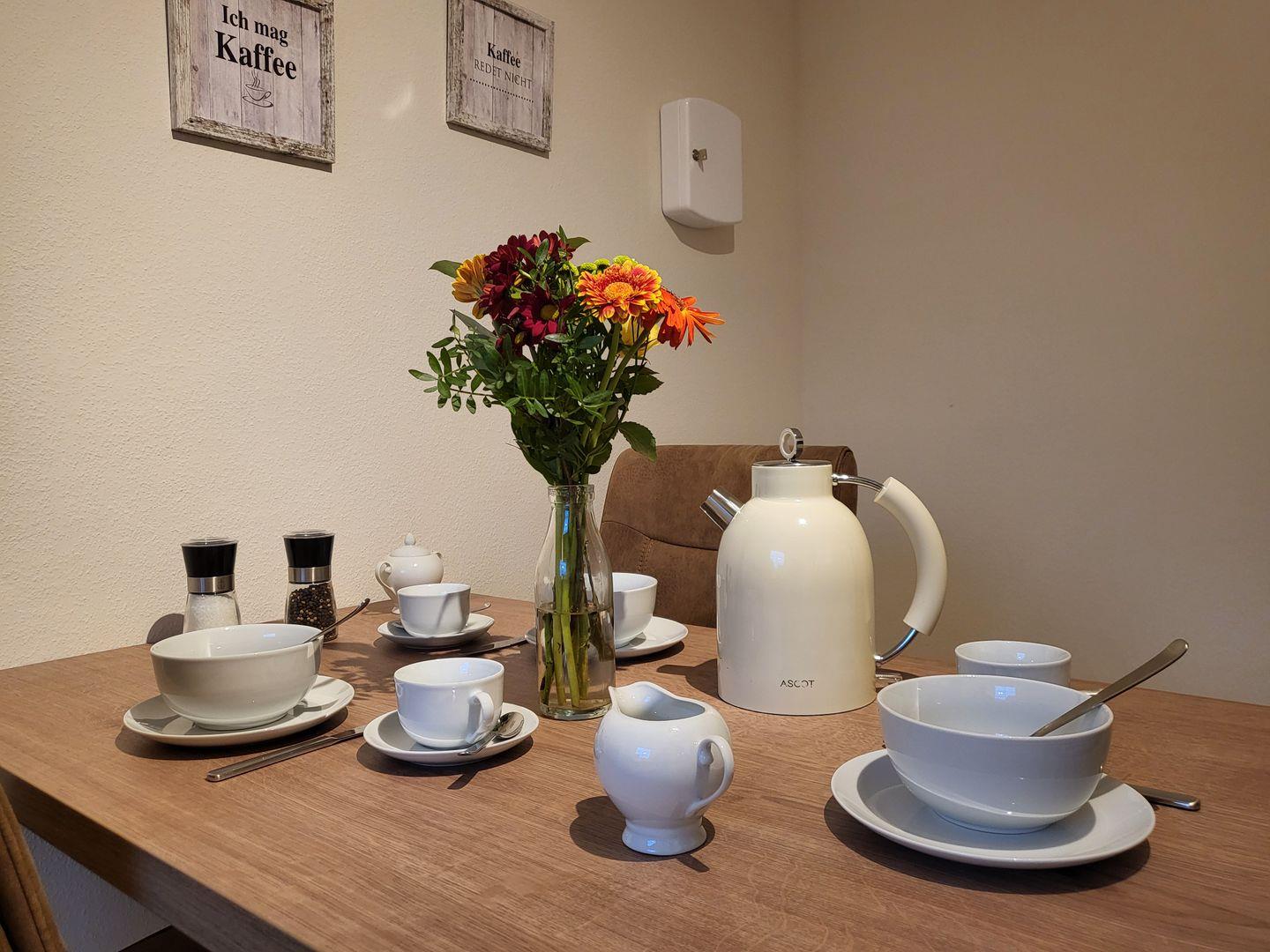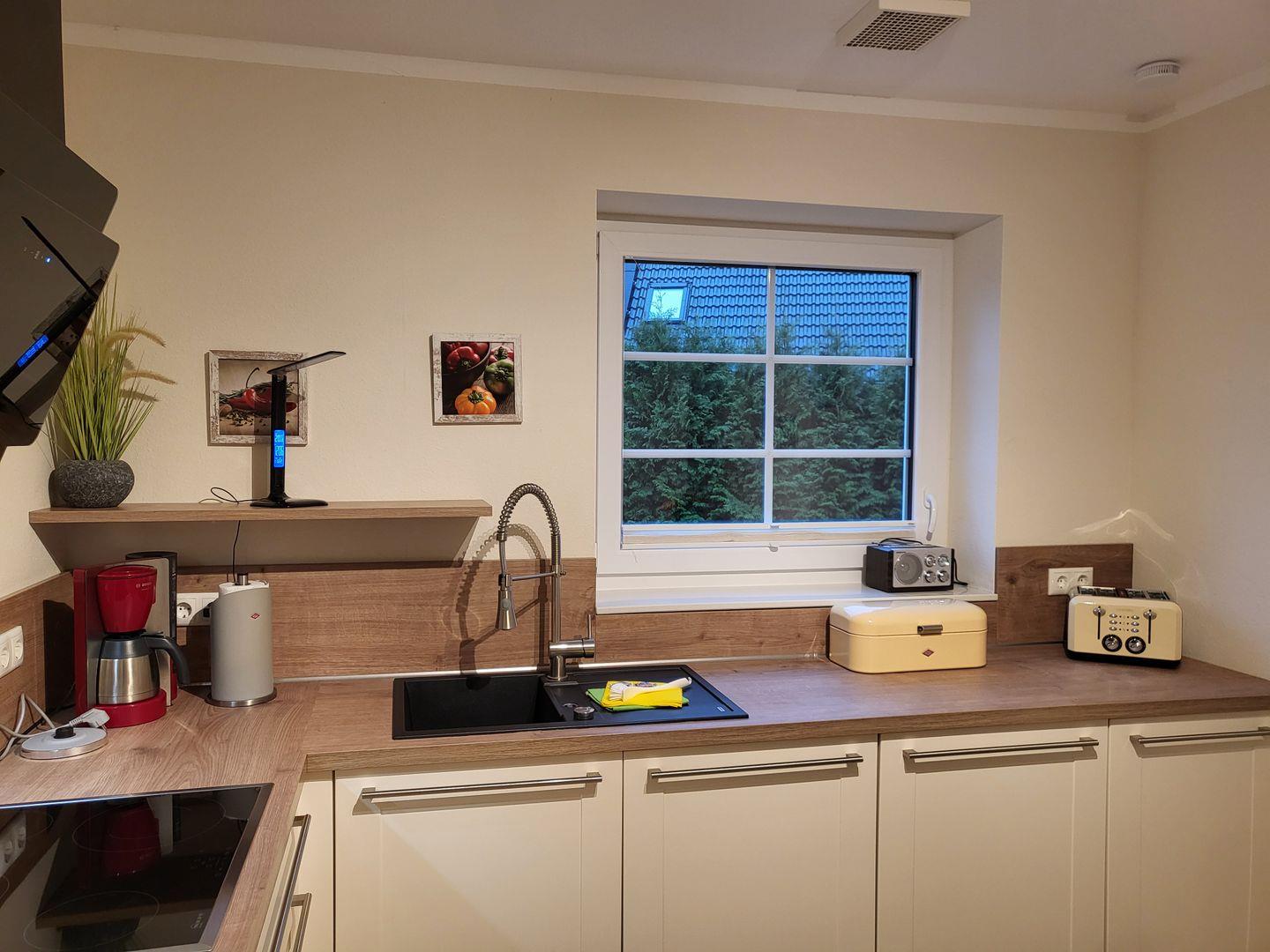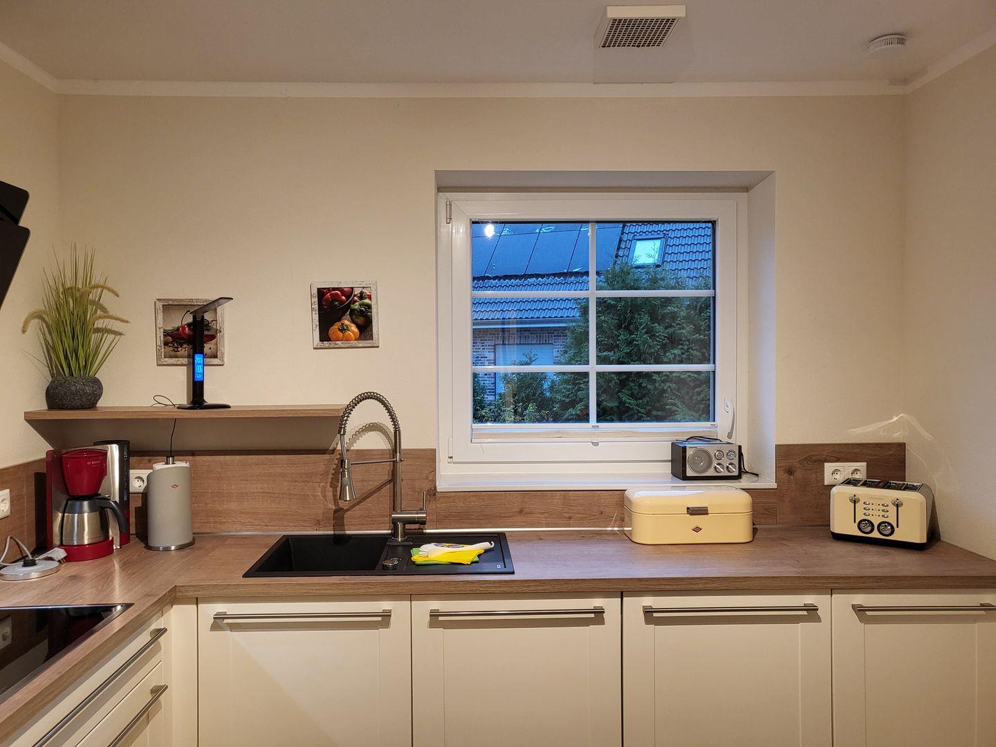 Hier gehören unter anderem ein großes Cerankochfeld mit Backofen, Kaffeemaschine, ein Kühlschrank mit Gefrierfach sowie Geschirrspüler und einer Mikrowelle zum Inventar.