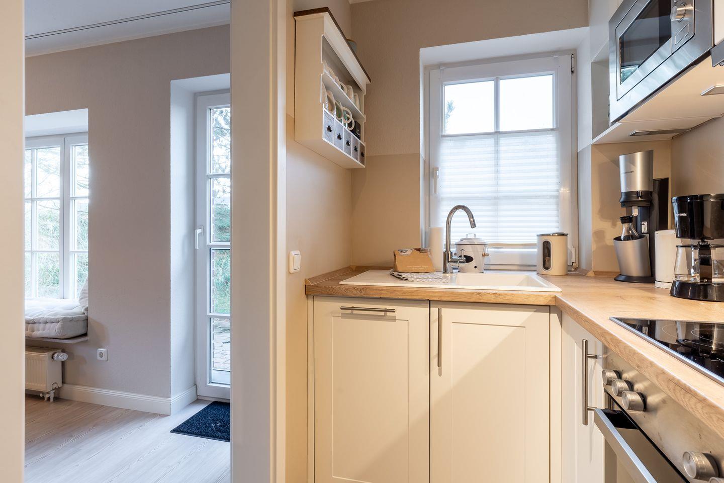 Die Ferienwohnung besticht durch helle, maritime Materialien und einen offenen Wohn- und Essbereich, der direkt auf die sonnige Südterrasse führt. Hier erwartet Sie ein Strandkorb und ein kleiner Gartenanteil – perfekt, um die frische Nordseeluft zu genießen. Die angrenzende, moderne Küche ist komplett ausgestattet, unter anderem mit einem 4-Platten-Cerankochfeld, Backofen, Mikrowelle und Geschirrspüler, sodass Sie auch kulinarisch verwöhnt werden.