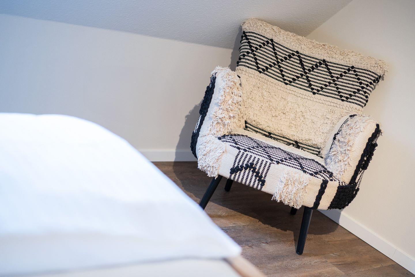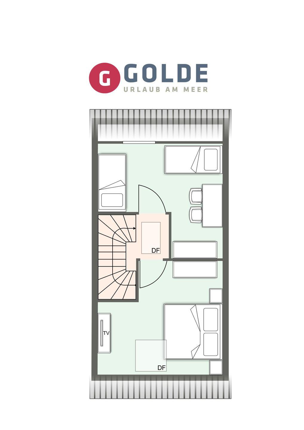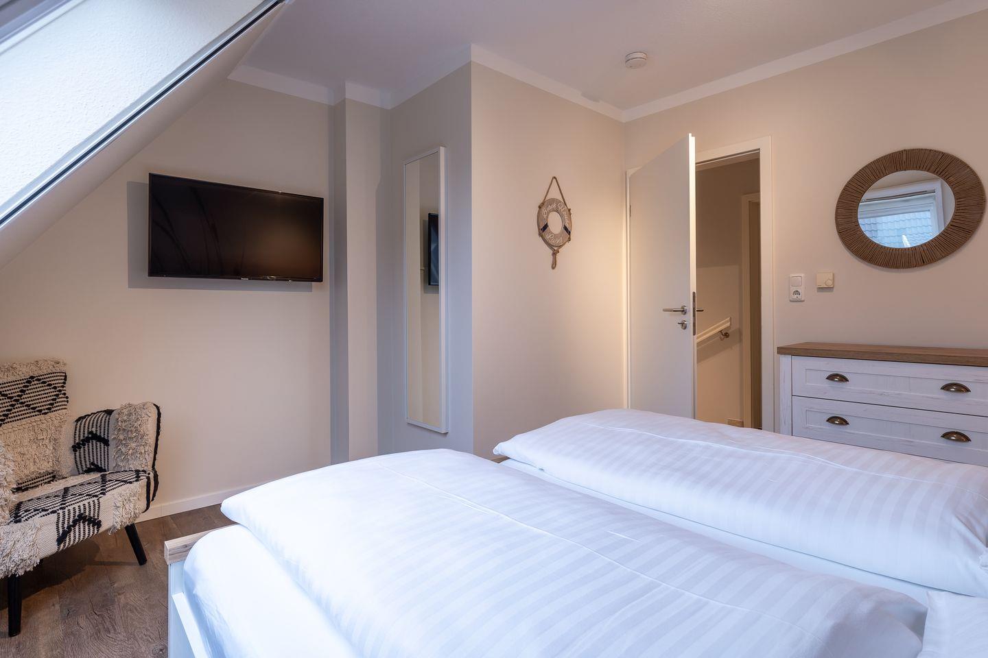 Obergeschoss: 2 Schlafräume (1 Doppelbett + TV, 2 Einzelbetten).