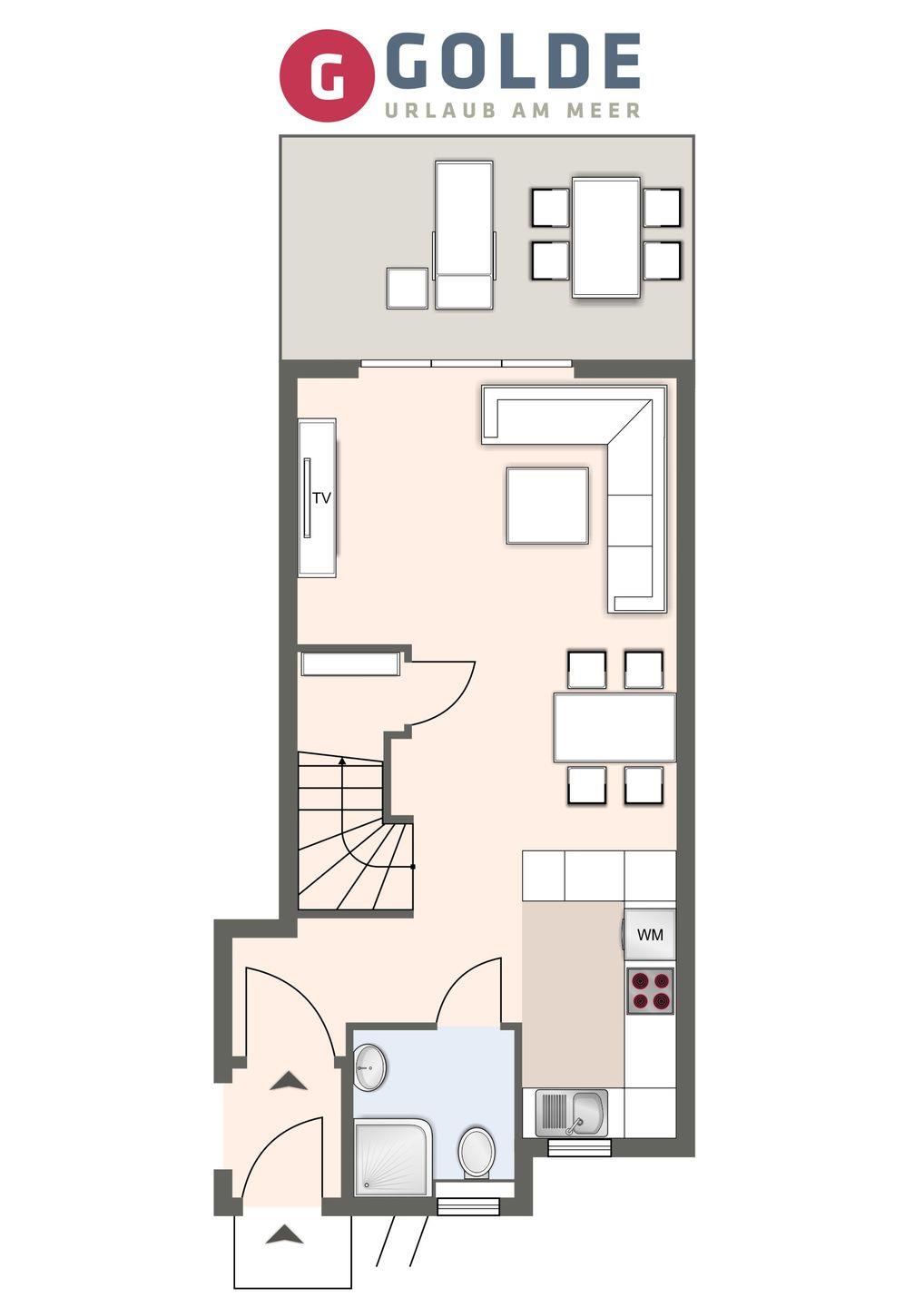 Erdgeschoss: Wohnzimmer mit Küche, Duschbad, Abstellraum.