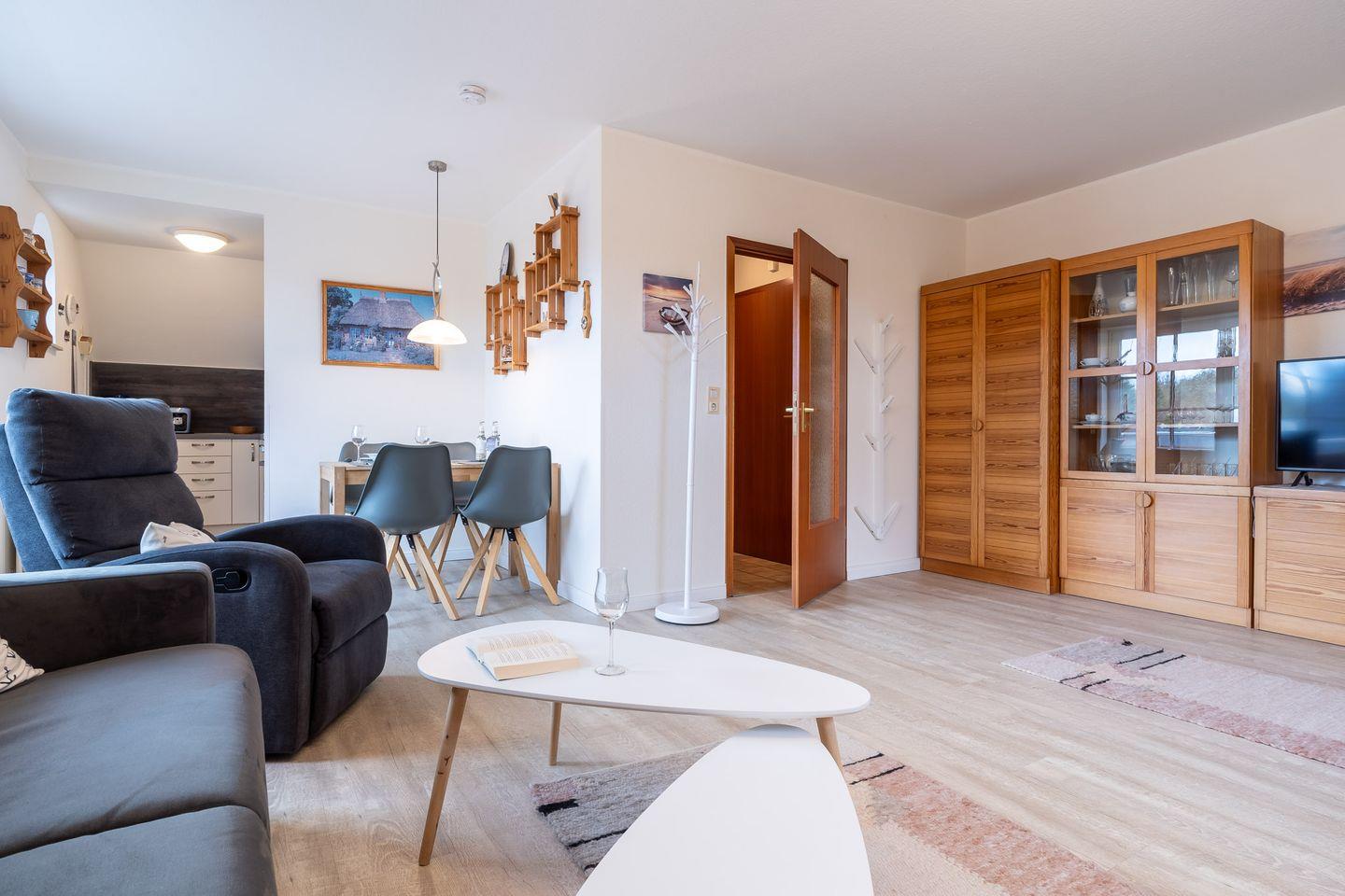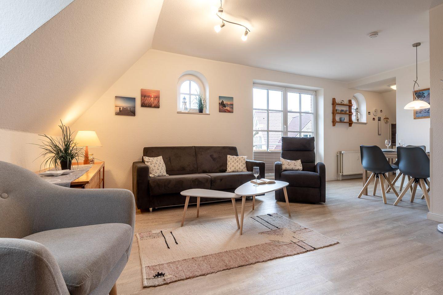 Das helle, einladende Wohnzimmer lädt mit einer bequemen Schlafcouch zum Verweilen ein – perfekt für entspannte Abende nach einem Tag am Meer. Die offene, moderne Küche ist vollständig ausgestattet und bietet alles, was Sie für die Zubereitung leckerer Mahlzeiten benötigen. Genießen Sie Ihre Speisen gemeinsam am Esstisch oder lassen Sie den Tag bei einem Glas Wein auf dem sonnigen Balkon ausklingen.