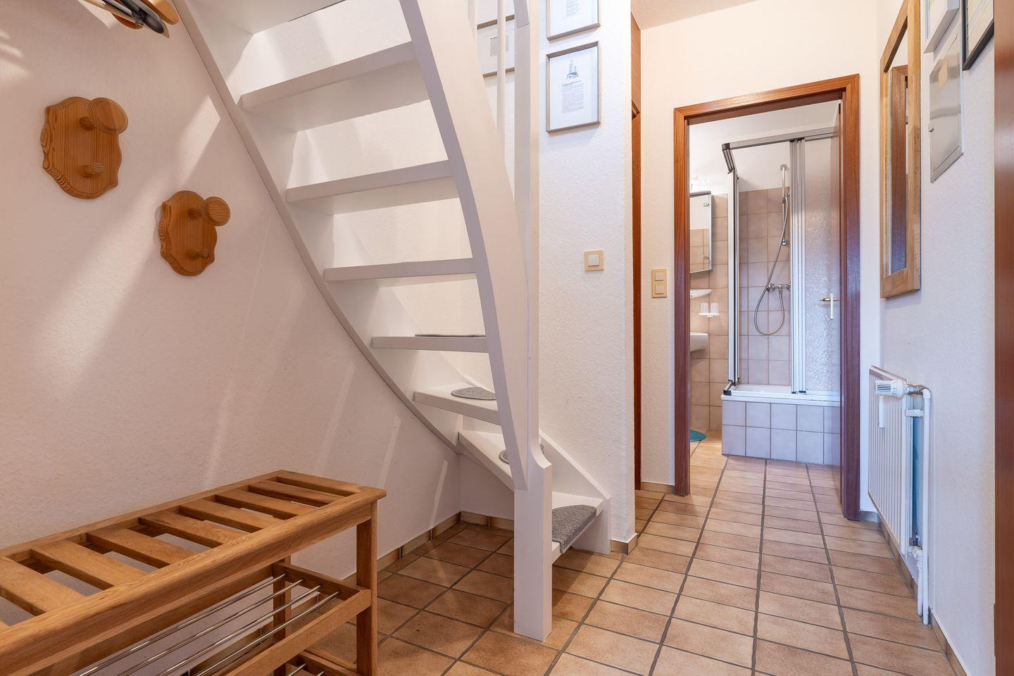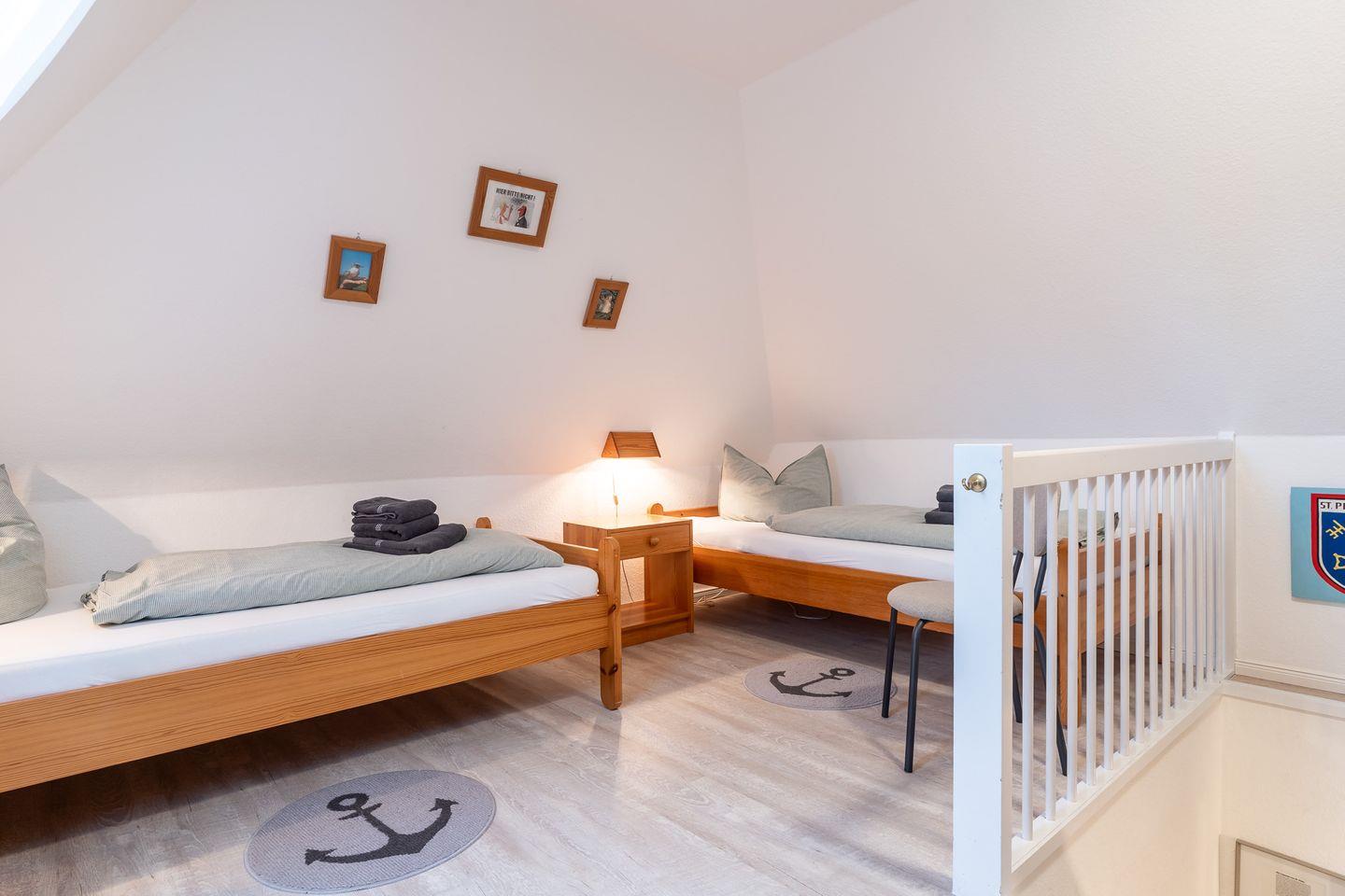 Das Schlafzimmer im Dachgeschoss erreichen Sie über eine relativ steile Treppe. Hier erwarten Sie zwei gemütliche Einzelbetten, die für erholsamen Schlaf sorgen. Diese Raumaufteilung macht die Wohnung ideal für Familien oder kleine Gruppen von Freunden, die ihren Urlaub an der Nordsee genießen möchten.