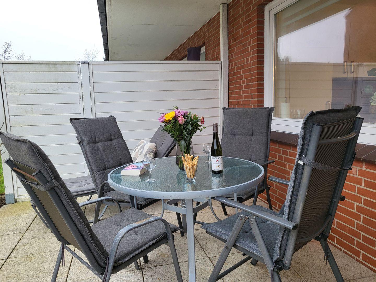 Auf der geräumigen Terrasse haben Sie Platz für Sonnenliegen und Tisch mit Stühlen. Eine Aussensteckdose ist vorhanden, falls Sie einen Elektrogrill nutzen möchten.
