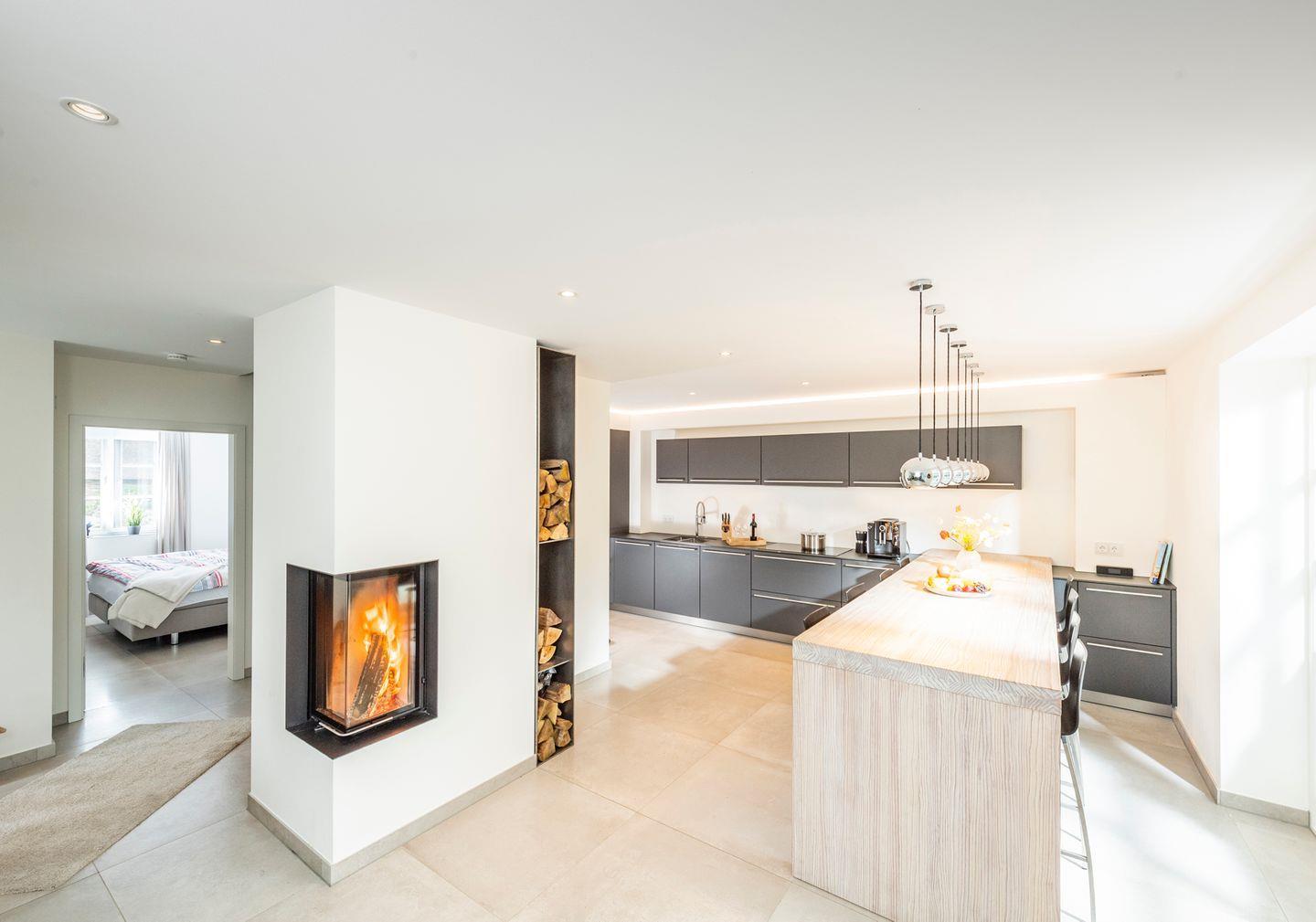 Im Erdgeschoss erwarten Sie ein einladender Flur mit Garderobe, ein geräumiger Wohn- und Essbereich mit offener Küche und Kaminofen, ein Schlafzimmer mit einem komfortablen Boxspringbett (180 x 200 cm) und eigenem Duschbad/WC sowie ein Hauswirtschaftsraum mit Waschmaschine und Trockner.