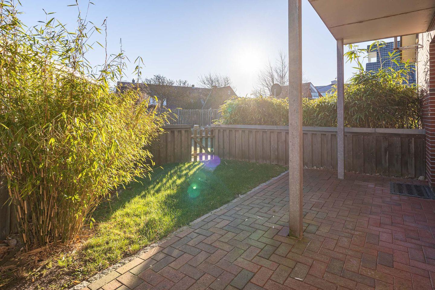 Die Ferienwohnung verfügt über eine eigene Terrasse mit Gartenmöbeln (nutzbar von April bis Oktober), eine Liege- und Spielwiese sowie eine abschließbare Garage für Fahrräder. Ihr Auto parken Sie bequem auf dem eigenen Stellplatz (Nr. 1 links neben dem Haus).