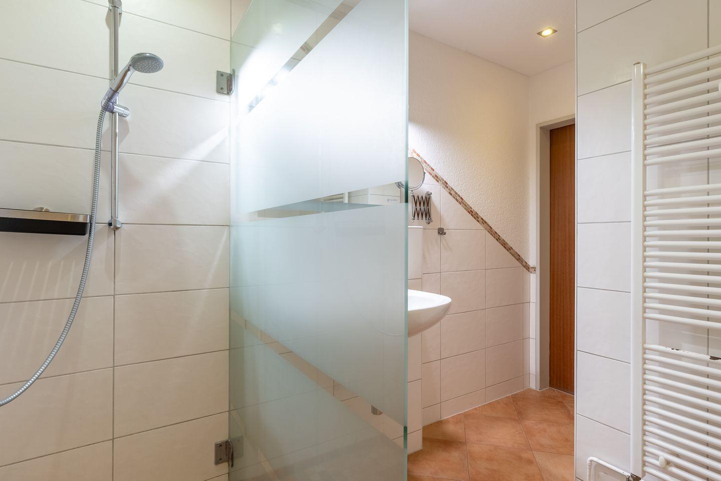 • Badezimmer: Helles Duschbad mit Handtuchheizkörper und Wäscheständer für zusätzlichen Komfort.