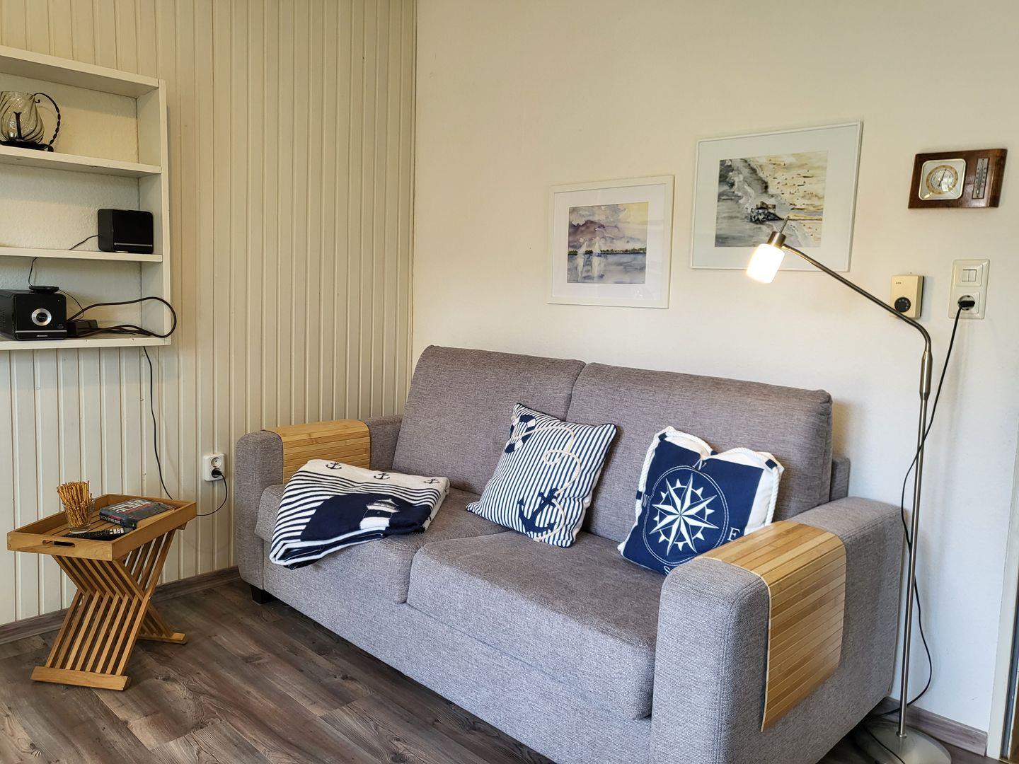 2 Zimmerwohnung im EG mit Terrasse, geeignet für bis zu 2 Erwachsene und 2 Kinder, Wohnzimmer mit Esstisch und Schlafcouch, Küchenzeile im Flurbereich, Duschbad mit WC,