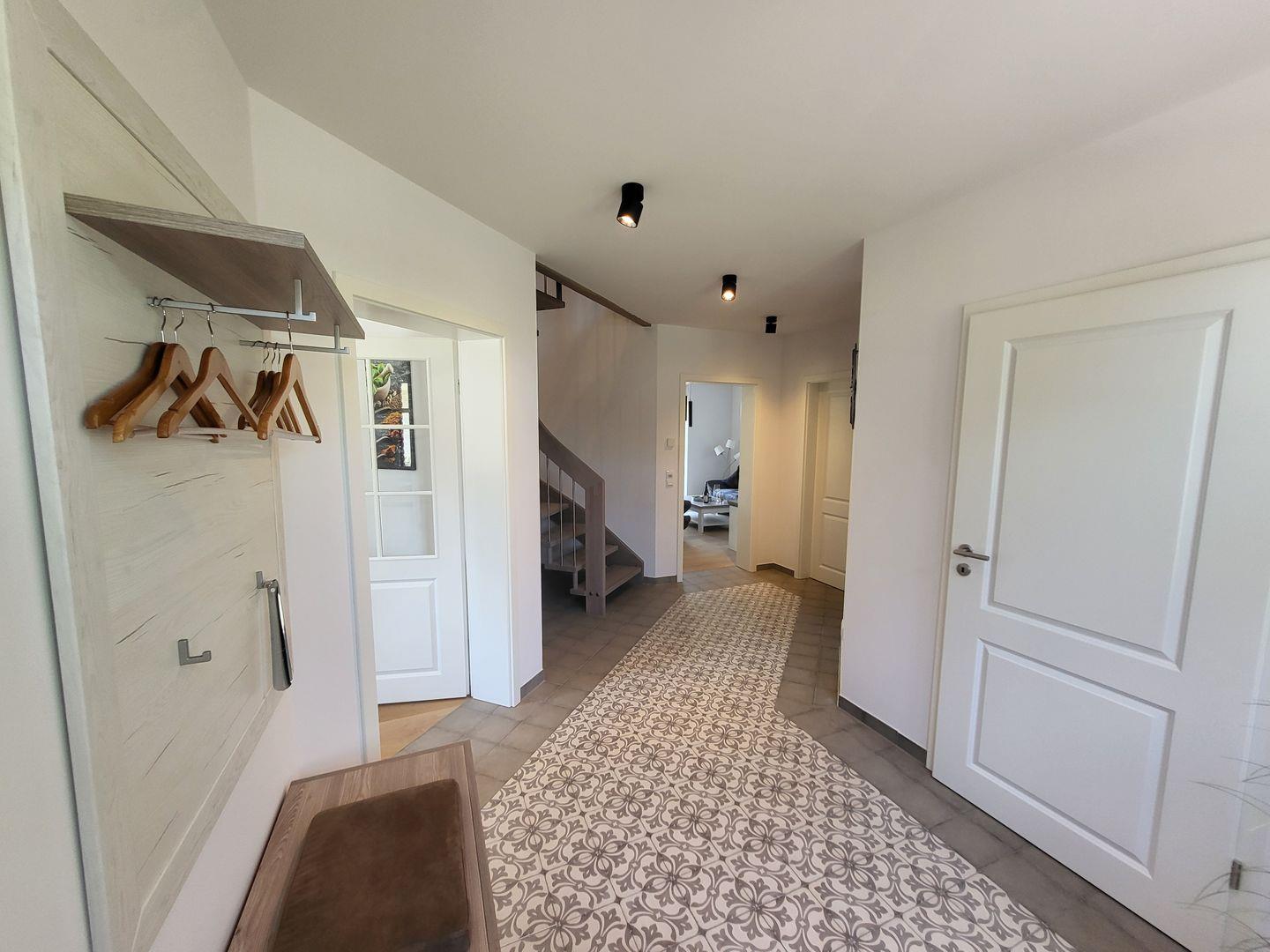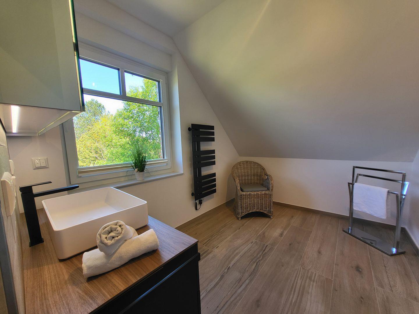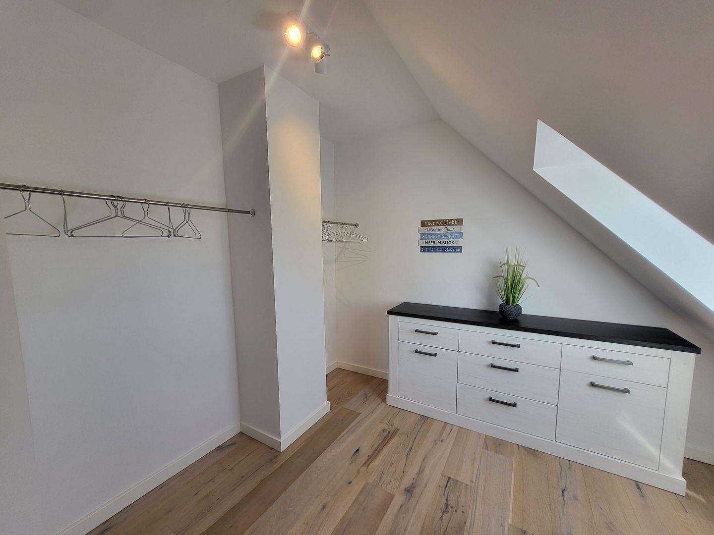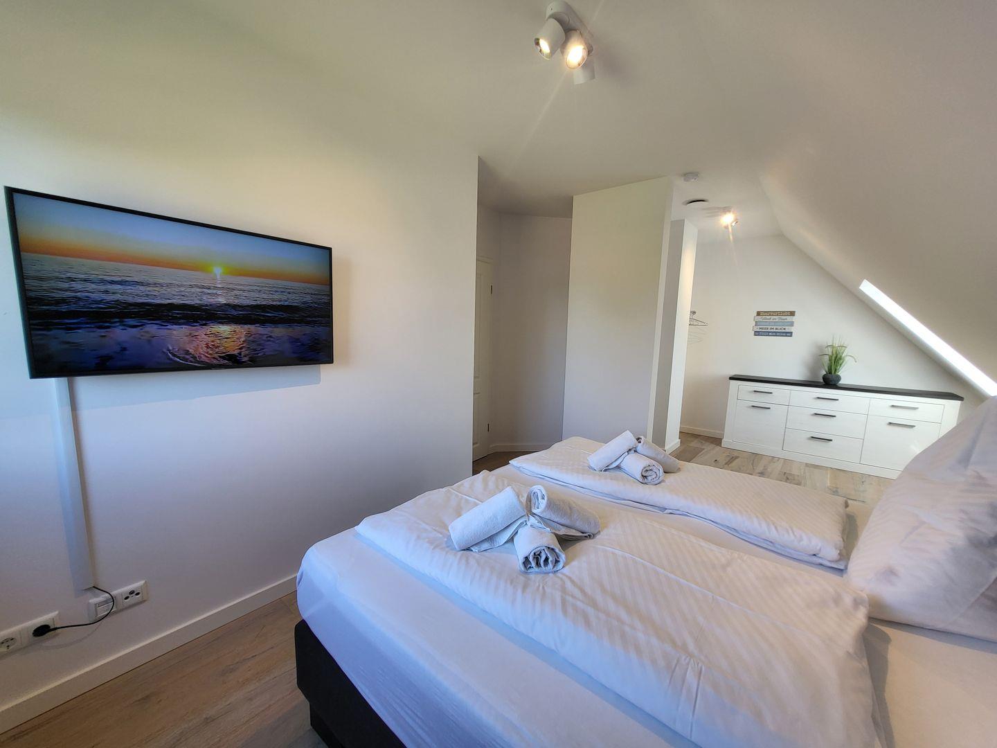 Die beiden stilvollen Schlafzimmer im Obergeschoß sind mit modernen Möbeln, Boxspringbetten (180 x 200) und Parkettboden ausgestattet, und bieten einen angenehmen Rückzugsort nach einem aktiven Tag am Strand. Die beiden Badezimmer verfügen über bodengleiche Duschen, Waschbecken, WC und komfortable Spiegel, während ein Haartrockner für Ihren Komfort bereitsteht. Kostenloses WLAN und zwei Smart-TV´s sorgen dafür, dass Sie auch bei schlechtem Wetter gut unterhalten werden.
