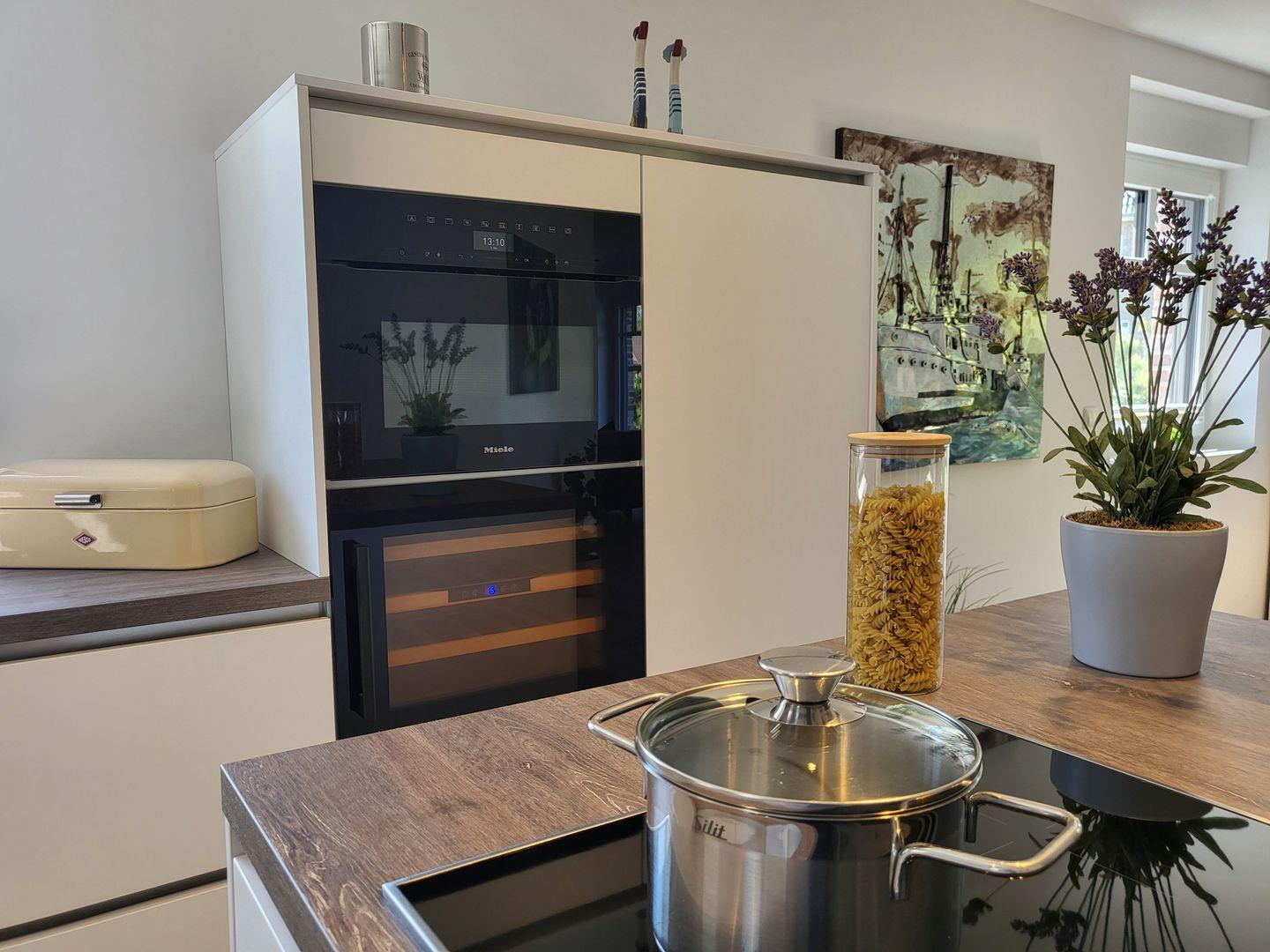 Das im Jahr 2024 erbaute, freistehende Ferienhaus besticht durch eine moderne und helle Innengestaltung. Der großzügige Wohnbereich, versehen mit einem komfortablen Parkettboden, lädt zum Verweilen ein und bietet nicht nur zwei gemütliche Sofas, sondern auch einen Essbereich, der zu gemeinsamen Mahlzeiten einlädt. Die offene Küche ist mit hochwertigen Annehmlichkeiten ausgestattet, darunter ein Induktionsherd, Backofen, Mikrowelle, Weinkühler und Geschirrspüler, wodurch das Kochen zum Vergnügen wird. Ein Kühlschrank sowie alle notwendigen Küchenutensilien stehen Ihnen ebenfalls zur Verfügung.