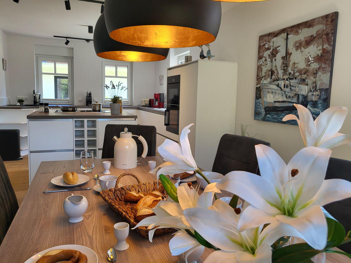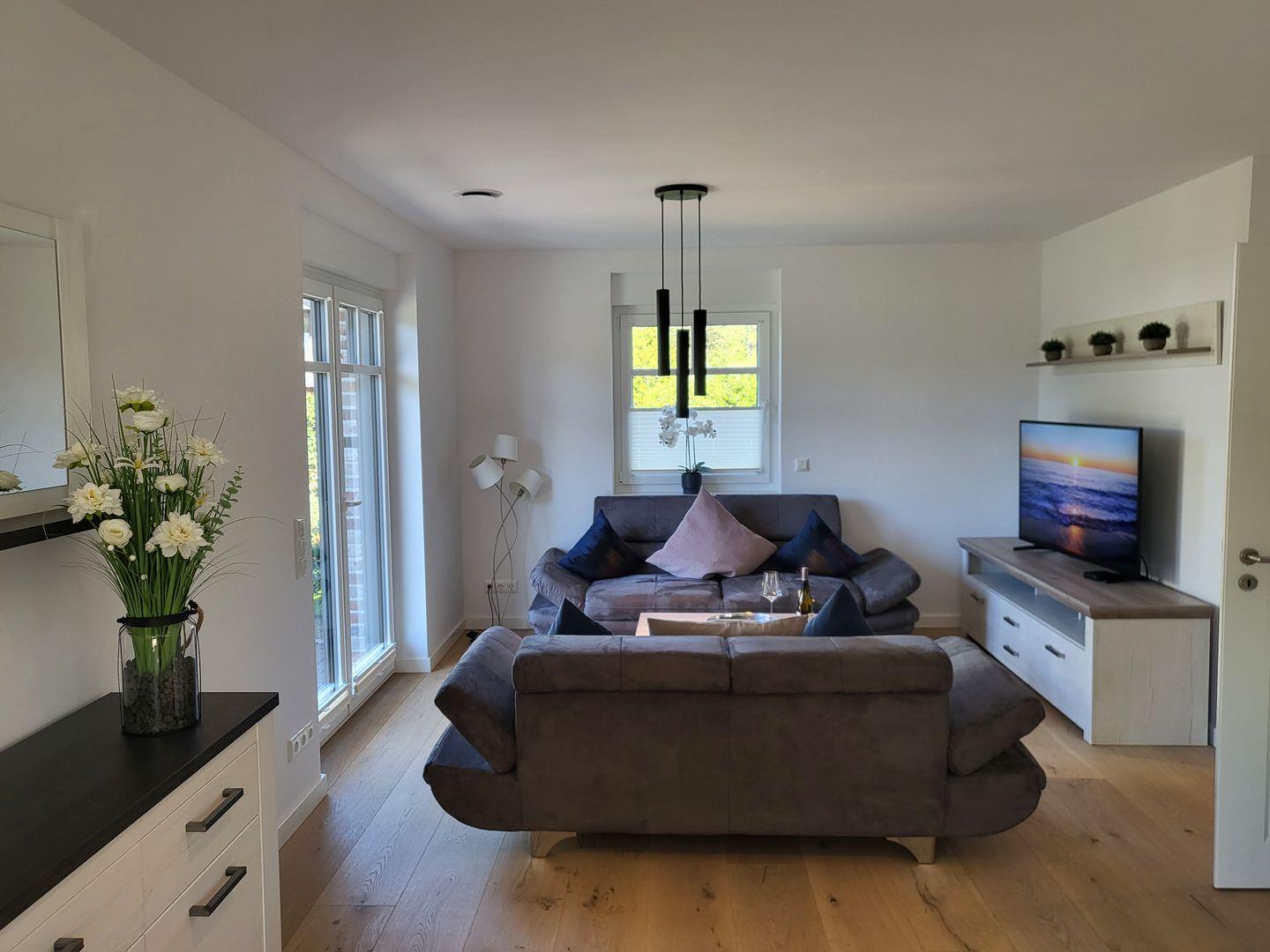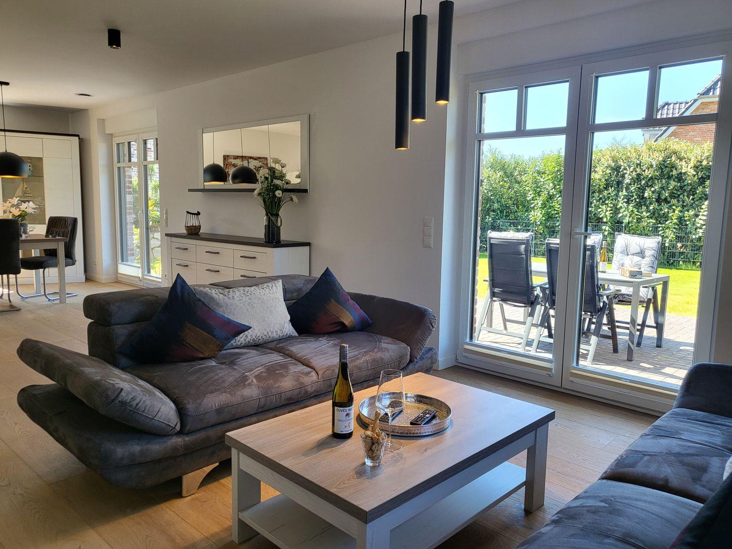 FH Strandläufer, Wohnraum mit moderner Küche, Terrasse, 2 Schlafzimmer mit Boxspringbetten, 2 Bäder, Nichtraucher, Fußbodenheizung, WLAN, 1x Haustier auf Anfrage, kinderfreundlich, 2 PKW Stellplätz auf dem Grundstück vorhanden, 2x Smart-TV, komplett eingezäuntes Gartengrundstück, freies WLAN, kostenfreie Wallbox-Ladestation für E-Autos, kostenfreier Kinderhochstuhl vorhanden, Waschmaschine und Trockner vorhanden