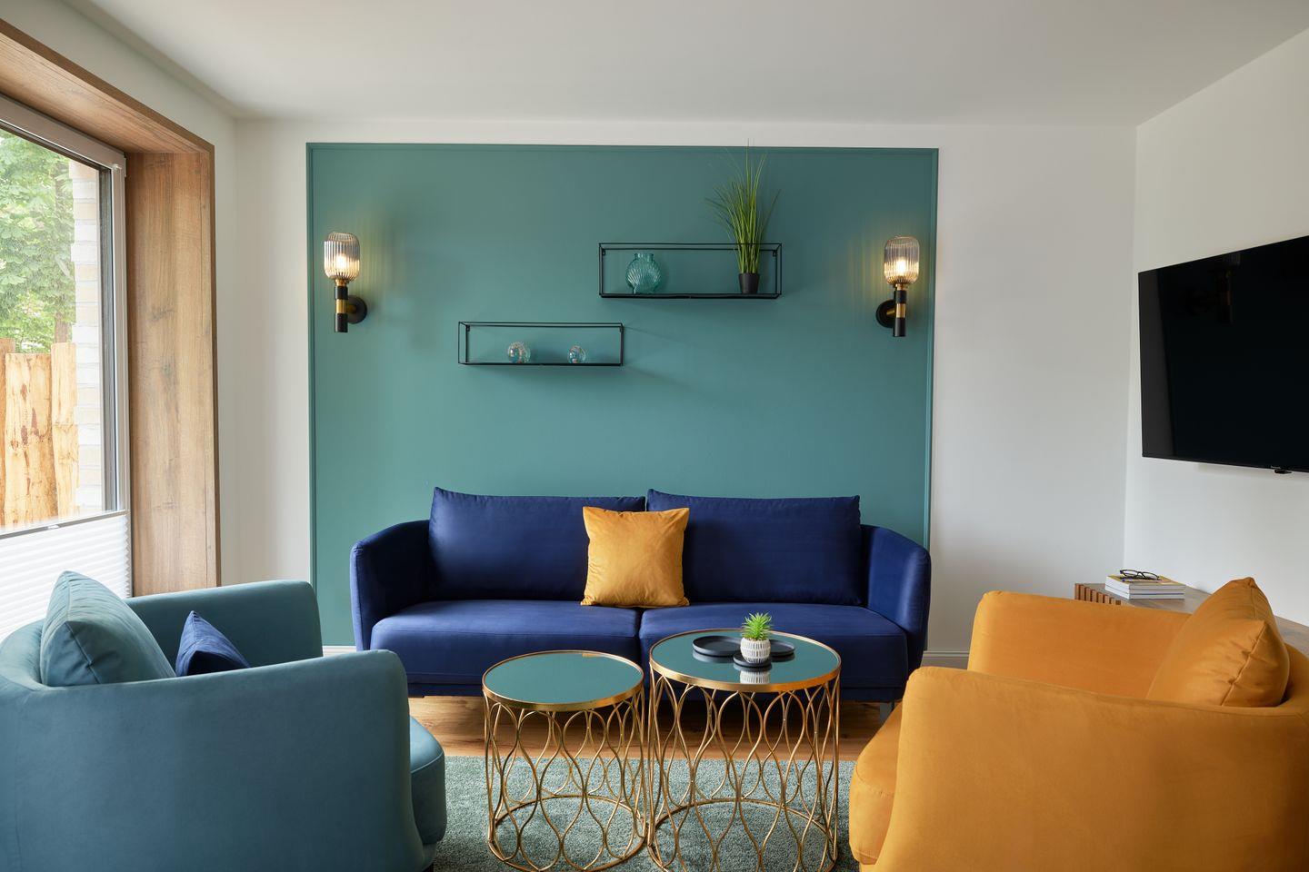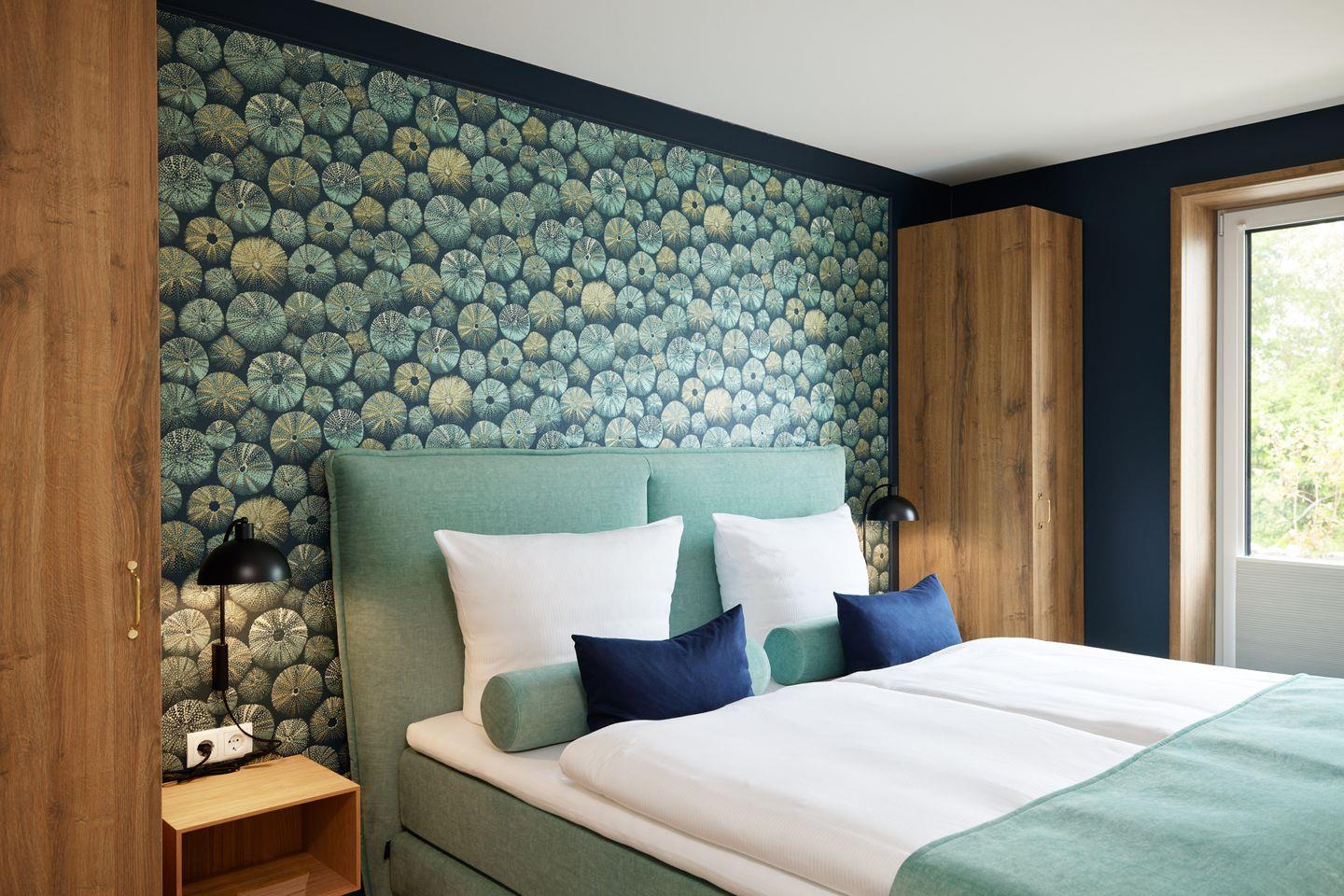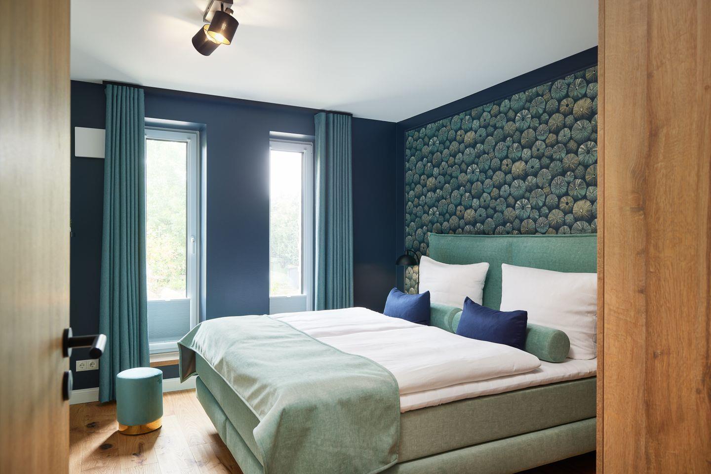 Ein Highlight ist die hochwertige Küche mit tiefblauen Fronten und goldenen Armaturen – stilvoll und maritim. Zwei Schlafzimmer mit bequemen Boxspringbetten bieten Platz für vier Gäste.