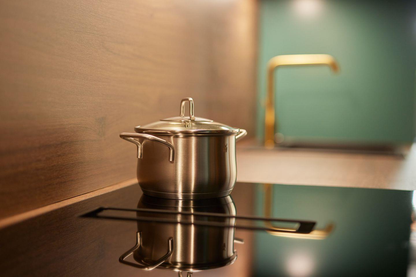 Ein Highlight ist die hochwertige Küche mit tiefblauen Fronten und goldenen Armaturen.